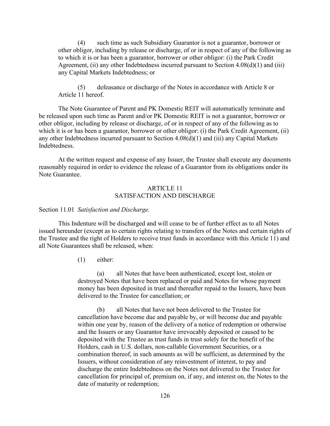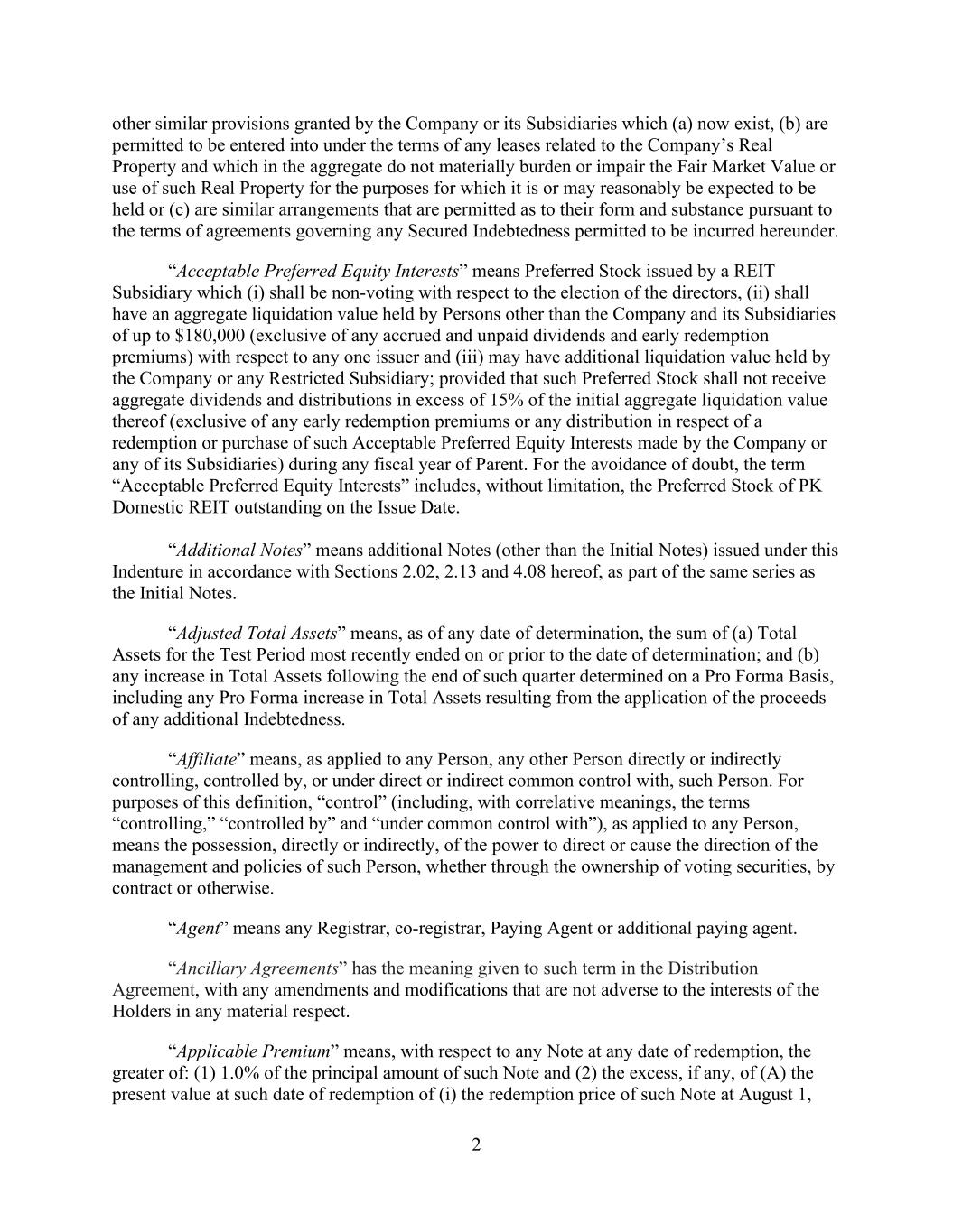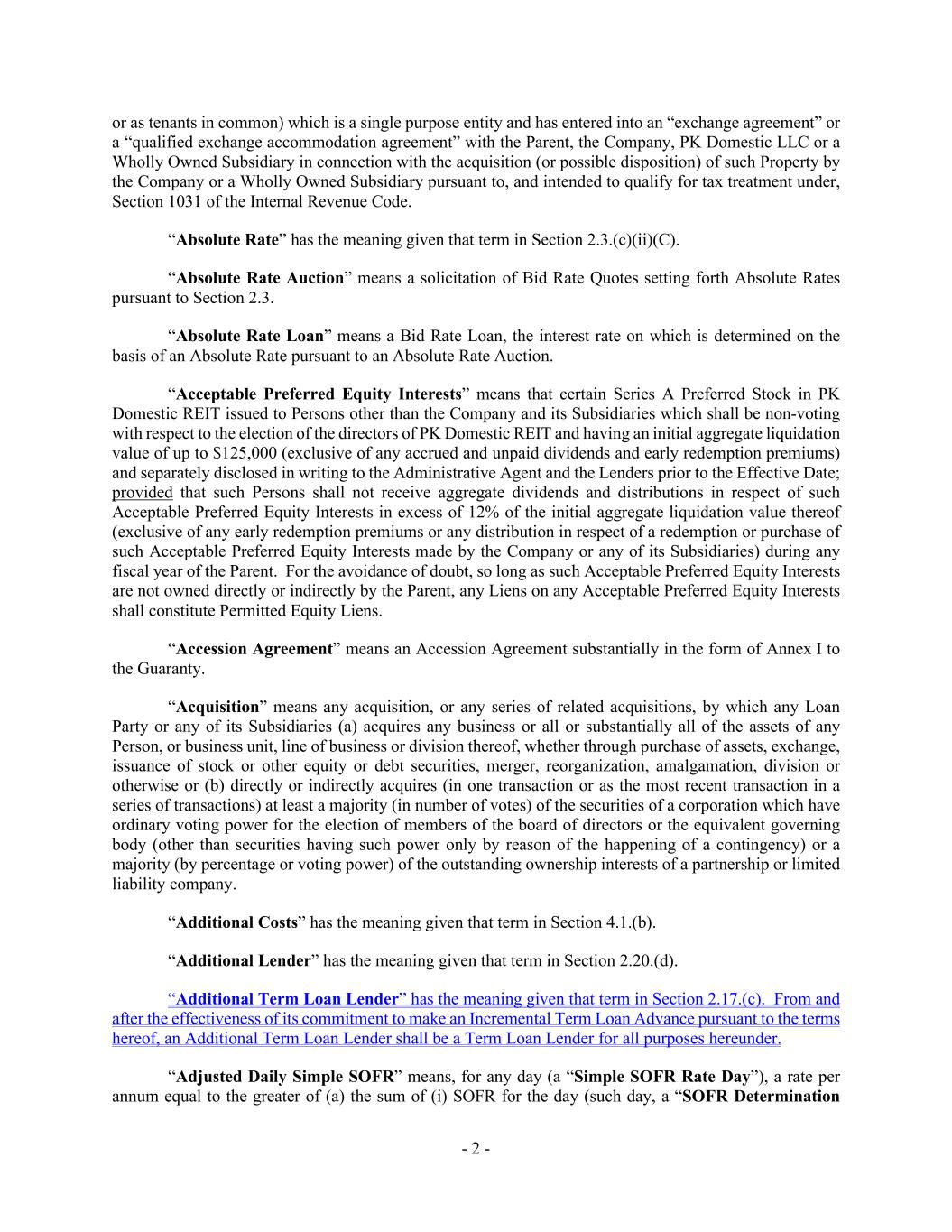 - 2 - or as tenants in common) which is a single purpose entity and has entered into an “exchange agreement” or a “qualified exchange accommodation agreement” with the Parent, the Company, PK Domestic LLC or a Wholly Owned Subsidiary in connection with the acquisition (or possible disposition) of such Property by the Company or a Wholly Owned Subsidiary pursuant to, and intended to qualify for tax treatment under, Section 1031 of the Internal Revenue Code. “Absolute Rate” has the meaning given that term in Section 2.3.(c)(ii)(C). “Absolute Rate Auction” means a solicitation of Bid Rate Quotes setting forth Absolute Rates pursuant to Section 2.3. “Absolute Rate Loan” means a Bid Rate Loan, the interest rate on which is determined on the basis of an Absolute Rate pursuant to an Absolute Rate Auction. “Acceptable Preferred Equity Interests” means that certain Series A Preferred Stock in PK Domestic REIT issued to Persons other than the Company and its Subsidiaries which shall be non-voting with respect to the election of the directors of PK Domestic REIT and having an initial aggregate liquidation value of up to $125,000 (exclusive of any accrued and unpaid dividends and early redemption premiums) and separately disclosed in writing to the Administrative Agent and the Lenders prior to the Effective Date; provided that such Persons shall not receive aggregate dividends and distributions in respect of such Acceptable Preferred Equity Interests in excess of 12% of the initial aggregate liquidation value thereof (exclusive of any early redemption premiums or any distribution in respect of a redemption or purchase of such Acceptable Preferred Equity Interests made by the Company or any of its Subsidiaries) during any fiscal year of the Parent. For the avoidance of doubt, so long as such Acceptable Preferred Equity Interests are not owned directly or indirectly by the Parent, any Liens on any Acceptable Preferred Equity Interests shall constitute Permitted Equity Liens. “Accession Agreement” means an Accession Agreement substantially in the form of Annex I to the Guaranty. “Acquisition” means any acquisition, or any series of related acquisitions, by which any Loan Party or any of its Subsidiaries (a) acquires any business or all or substantially all of the assets of any Person, or business unit, line of business or division thereof, whether through purchase of assets, exchange, issuance of stock or other equity or debt securities, merger, reorganization, amalgamation, division or otherwise or (b) directly or indirectly acquires (in one transaction or as the most recent transaction in a series of transactions) at least a majority (in number of votes) of the securities of a corporation which have ordinary voting power for the election of members of the board of directors or the equivalent governing body (other than securities having such power only by reason of the happening of a contingency) or a majority (by percentage or voting power) of the outstanding ownership interests of a partnership or limited liability company. “Additional Costs” has the meaning given that term in Section 4.1.(b). “Additional Lender” has the meaning given that term in Section 2.20.(d). “Additional Term Loan Lender” has the meaning given that term in Section 2.17.(c). From and after the effectiveness of its commitment to make an Incremental Term Loan Advance pursuant to the terms hereof, an Additional Term Loan Lender shall be a Term Loan Lender for all purposes hereunder. “Adjusted Daily Simple SOFR” means, for any day (a “Simple SOFR Rate Day”), a rate per annum equal to the greater of (a) the sum of (i) SOFR for the day (such day, a “SOFR Determination