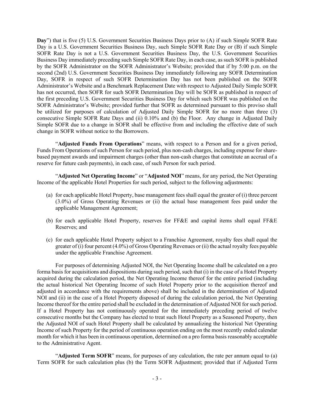 - 3 - Day”) that is five (5) U.S. Government Securities Business Days prior to (A) if such Simple SOFR Rate Day is a U.S. Government Securities Business Day, such Simple SOFR Rate Day or (B) if such Simple SOFR Rate Day is not a U.S. Government Securities Business Day, the U.S. Government Securities Business Day immediately preceding such Simple SOFR Rate Day, in each case, as such SOFR is published by the SOFR Administrator on the SOFR Administrator’s Website; provided that if by 5:00 p.m. on the second (2nd) U.S. Government Securities Business Day immediately following any SOFR Determination Day, SOFR in respect of such SOFR Determination Day has not been published on the SOFR Administrator’s Website and a Benchmark Replacement Date with respect to Adjusted Daily Simple SOFR has not occurred, then SOFR for such SOFR Determination Day will be SOFR as published in respect of the first preceding U.S. Government Securities Business Day for which such SOFR was published on the SOFR Administrator’s Website; provided further that SOFR as determined pursuant to this proviso shall be utilized for purposes of calculation of Adjusted Daily Simple SOFR for no more than three (3) consecutive Simple SOFR Rate Days and (ii) 0.10% and (b) the Floor. Any change in Adjusted Daily Simple SOFR due to a change in SOFR shall be effective from and including the effective date of such change in SOFR without notice to the Borrowers. “Adjusted Funds From Operations” means, with respect to a Person and for a given period, Funds From Operations of such Person for such period, plus non-cash charges, including expense for share- based payment awards and impairment charges (other than non-cash charges that constitute an accrual of a reserve for future cash payments), in each case, of such Person for such period. “Adjusted Net Operating Income” or “Adjusted NOI” means, for any period, the Net Operating Income of the applicable Hotel Properties for such period, subject to the following adjustments: (a) for each applicable Hotel Property, base management fees shall equal the greater of (i) three percent (3.0%) of Gross Operating Revenues or (ii) the actual base management fees paid under the applicable Management Agreement; (b) for each applicable Hotel Property, reserves for FF&E and capital items shall equal FF&E Reserves; and (c) for each applicable Hotel Property subject to a Franchise Agreement, royalty fees shall equal the greater of (i) four percent (4.0%) of Gross Operating Revenues or (ii) the actual royalty fees payable under the applicable Franchise Agreement. For purposes of determining Adjusted NOI, the Net Operating Income shall be calculated on a pro forma basis for acquisitions and dispositions during such period, such that (i) in the case of a Hotel Property acquired during the calculation period, the Net Operating Income thereof for the entire period (including the actual historical Net Operating Income of such Hotel Property prior to the acquisition thereof and adjusted in accordance with the requirements above) shall be included in the determination of Adjusted NOI and (ii) in the case of a Hotel Property disposed of during the calculation period, the Net Operating Income thereof for the entire period shall be excluded in the determination of Adjusted NOI for such period. If a Hotel Property has not continuously operated for the immediately preceding period of twelve consecutive months but the Company has elected to treat such Hotel Property as a Seasoned Property, then the Adjusted NOI of such Hotel Property shall be calculated by annualizing the historical Net Operating Income of such Property for the period of continuous operation ending on the most recently ended calendar month for which it has been in continuous operation, determined on a pro forma basis reasonably acceptable to the Administrative Agent. “Adjusted Term SOFR” means, for purposes of any calculation, the rate per annum equal to (a) Term SOFR for such calculation plus (b) the Term SOFR Adjustment; provided that if Adjusted Term