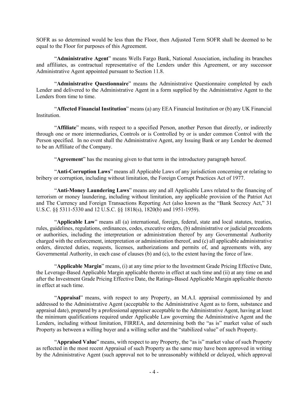 - 4 - SOFR as so determined would be less than the Floor, then Adjusted Term SOFR shall be deemed to be equal to the Floor for purposes of this Agreement. “Administrative Agent” means Wells Fargo Bank, National Association, including its branches and affiliates, as contractual representative of the Lenders under this Agreement, or any successor Administrative Agent appointed pursuant to Section 11.8. “Administrative Questionnaire” means the Administrative Questionnaire completed by each Lender and delivered to the Administrative Agent in a form supplied by the Administrative Agent to the Lenders from time to time. “Affected Financial Institution” means (a) any EEA Financial Institution or (b) any UK Financial Institution. “Affiliate” means, with respect to a specified Person, another Person that directly, or indirectly through one or more intermediaries, Controls or is Controlled by or is under common Control with the Person specified. In no event shall the Administrative Agent, any Issuing Bank or any Lender be deemed to be an Affiliate of the Company. “Agreement” has the meaning given to that term in the introductory paragraph hereof. “Anti-Corruption Laws” means all Applicable Laws of any jurisdiction concerning or relating to bribery or corruption, including without limitation, the Foreign Corrupt Practices Act of 1977. “Anti-Money Laundering Laws” means any and all Applicable Laws related to the financing of terrorism or money laundering, including without limitation, any applicable provision of the Patriot Act and The Currency and Foreign Transactions Reporting Act (also known as the “Bank Secrecy Act,” 31 U.S.C. §§ 5311-5330 and 12 U.S.C. §§ 1818(s), 1820(b) and 1951-1959). “Applicable Law” means all (a) international, foreign, federal, state and local statutes, treaties, rules, guidelines, regulations, ordinances, codes, executive orders, (b) administrative or judicial precedents or authorities, including the interpretation or administration thereof by any Governmental Authority charged with the enforcement, interpretation or administration thereof, and (c) all applicable administrative orders, directed duties, requests, licenses, authorizations and permits of, and agreements with, any Governmental Authority, in each case of clauses (b) and (c), to the extent having the force of law. “Applicable Margin” means, (i) at any time prior to the Investment Grade Pricing Effective Date, the Leverage-Based Applicable Margin applicable thereto in effect at such time and (ii) at any time on and after the Investment Grade Pricing Effective Date, the Ratings-Based Applicable Margin applicable thereto in effect at such time. “Appraisal” means, with respect to any Property, an M.A.I. appraisal commissioned by and addressed to the Administrative Agent (acceptable to the Administrative Agent as to form, substance and appraisal date), prepared by a professional appraiser acceptable to the Administrative Agent, having at least the minimum qualifications required under Applicable Law governing the Administrative Agent and the Lenders, including without limitation, FIRREA, and determining both the “as is” market value of such Property as between a willing buyer and a willing seller and the “stabilized value” of such Property. “Appraised Value” means, with respect to any Property, the “as is” market value of such Property as reflected in the most recent Appraisal of such Property as the same may have been approved in writing by the Administrative Agent (such approval not to be unreasonably withheld or delayed, which approval
