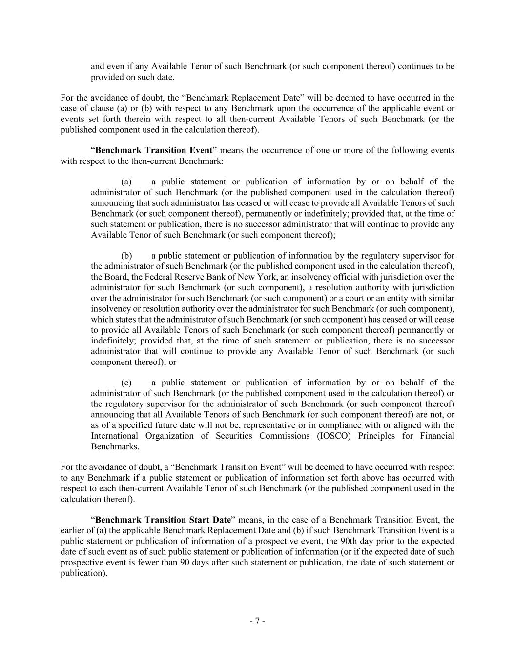 - 7 - and even if any Available Tenor of such Benchmark (or such component thereof) continues to be provided on such date. For the avoidance of doubt, the “Benchmark Replacement Date” will be deemed to have occurred in the case of clause (a) or (b) with respect to any Benchmark upon the occurrence of the applicable event or events set forth therein with respect to all then-current Available Tenors of such Benchmark (or the published component used in the calculation thereof). “Benchmark Transition Event” means the occurrence of one or more of the following events with respect to the then-current Benchmark: (a) a public statement or publication of information by or on behalf of the administrator of such Benchmark (or the published component used in the calculation thereof) announcing that such administrator has ceased or will cease to provide all Available Tenors of such Benchmark (or such component thereof), permanently or indefinitely; provided that, at the time of such statement or publication, there is no successor administrator that will continue to provide any Available Tenor of such Benchmark (or such component thereof); (b) a public statement or publication of information by the regulatory supervisor for the administrator of such Benchmark (or the published component used in the calculation thereof), the Board, the Federal Reserve Bank of New York, an insolvency official with jurisdiction over the administrator for such Benchmark (or such component), a resolution authority with jurisdiction over the administrator for such Benchmark (or such component) or a court or an entity with similar insolvency or resolution authority over the administrator for such Benchmark (or such component), which states that the administrator of such Benchmark (or such component) has ceased or will cease to provide all Available Tenors of such Benchmark (or such component thereof) permanently or indefinitely; provided that, at the time of such statement or publication, there is no successor administrator that will continue to provide any Available Tenor of such Benchmark (or such component thereof); or (c) a public statement or publication of information by or on behalf of the administrator of such Benchmark (or the published component used in the calculation thereof) or the regulatory supervisor for the administrator of such Benchmark (or such component thereof) announcing that all Available Tenors of such Benchmark (or such component thereof) are not, or as of a specified future date will not be, representative or in compliance with or aligned with the International Organization of Securities Commissions (IOSCO) Principles for Financial Benchmarks. For the avoidance of doubt, a “Benchmark Transition Event” will be deemed to have occurred with respect to any Benchmark if a public statement or publication of information set forth above has occurred with respect to each then-current Available Tenor of such Benchmark (or the published component used in the calculation thereof). “Benchmark Transition Start Date” means, in the case of a Benchmark Transition Event, the earlier of (a) the applicable Benchmark Replacement Date and (b) if such Benchmark Transition Event is a public statement or publication of information of a prospective event, the 90th day prior to the expected date of such event as of such public statement or publication of information (or if the expected date of such prospective event is fewer than 90 days after such statement or publication, the date of such statement or publication).