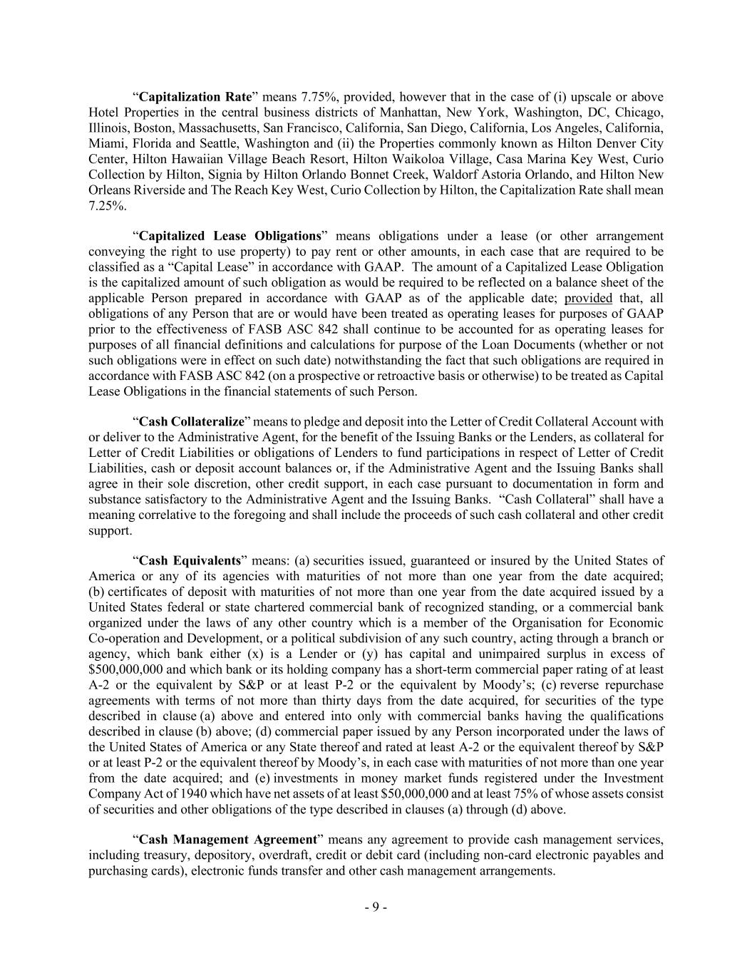 - 9 - “Capitalization Rate” means 7.75%, provided, however that in the case of (i) upscale or above Hotel Properties in the central business districts of Manhattan, New York, Washington, DC, Chicago, Illinois, Boston, Massachusetts, San Francisco, California, San Diego, California, Los Angeles, California, Miami, Florida and Seattle, Washington and (ii) the Properties commonly known as Hilton Denver City Center, Hilton Hawaiian Village Beach Resort, Hilton Waikoloa Village, Casa Marina Key West, Curio Collection by Hilton, Signia by Hilton Orlando Bonnet Creek, Waldorf Astoria Orlando, and Hilton New Orleans Riverside and The Reach Key West, Curio Collection by Hilton, the Capitalization Rate shall mean 7.25%. “Capitalized Lease Obligations” means obligations under a lease (or other arrangement conveying the right to use property) to pay rent or other amounts, in each case that are required to be classified as a “Capital Lease” in accordance with GAAP. The amount of a Capitalized Lease Obligation is the capitalized amount of such obligation as would be required to be reflected on a balance sheet of the applicable Person prepared in accordance with GAAP as of the applicable date; provided that, all obligations of any Person that are or would have been treated as operating leases for purposes of GAAP prior to the effectiveness of FASB ASC 842 shall continue to be accounted for as operating leases for purposes of all financial definitions and calculations for purpose of the Loan Documents (whether or not such obligations were in effect on such date) notwithstanding the fact that such obligations are required in accordance with FASB ASC 842 (on a prospective or retroactive basis or otherwise) to be treated as Capital Lease Obligations in the financial statements of such Person. “Cash Collateralize” means to pledge and deposit into the Letter of Credit Collateral Account with or deliver to the Administrative Agent, for the benefit of the Issuing Banks or the Lenders, as collateral for Letter of Credit Liabilities or obligations of Lenders to fund participations in respect of Letter of Credit Liabilities, cash or deposit account balances or, if the Administrative Agent and the Issuing Banks shall agree in their sole discretion, other credit support, in each case pursuant to documentation in form and substance satisfactory to the Administrative Agent and the Issuing Banks. “Cash Collateral” shall have a meaning correlative to the foregoing and shall include the proceeds of such cash collateral and other credit support. “Cash Equivalents” means: (a) securities issued, guaranteed or insured by the United States of America or any of its agencies with maturities of not more than one year from the date acquired; (b) certificates of deposit with maturities of not more than one year from the date acquired issued by a United States federal or state chartered commercial bank of recognized standing, or a commercial bank organized under the laws of any other country which is a member of the Organisation for Economic Co-operation and Development, or a political subdivision of any such country, acting through a branch or agency, which bank either (x) is a Lender or (y) has capital and unimpaired surplus in excess of $500,000,000 and which bank or its holding company has a short-term commercial paper rating of at least A-2 or the equivalent by S&P or at least P-2 or the equivalent by Moody’s; (c) reverse repurchase agreements with terms of not more than thirty days from the date acquired, for securities of the type described in clause (a) above and entered into only with commercial banks having the qualifications described in clause (b) above; (d) commercial paper issued by any Person incorporated under the laws of the United States of America or any State thereof and rated at least A-2 or the equivalent thereof by S&P or at least P-2 or the equivalent thereof by Moody’s, in each case with maturities of not more than one year from the date acquired; and (e) investments in money market funds registered under the Investment Company Act of 1940 which have net assets of at least $50,000,000 and at least 75% of whose assets consist of securities and other obligations of the type described in clauses (a) through (d) above. “Cash Management Agreement” means any agreement to provide cash management services, including treasury, depository, overdraft, credit or debit card (including non-card electronic payables and purchasing cards), electronic funds transfer and other cash management arrangements.