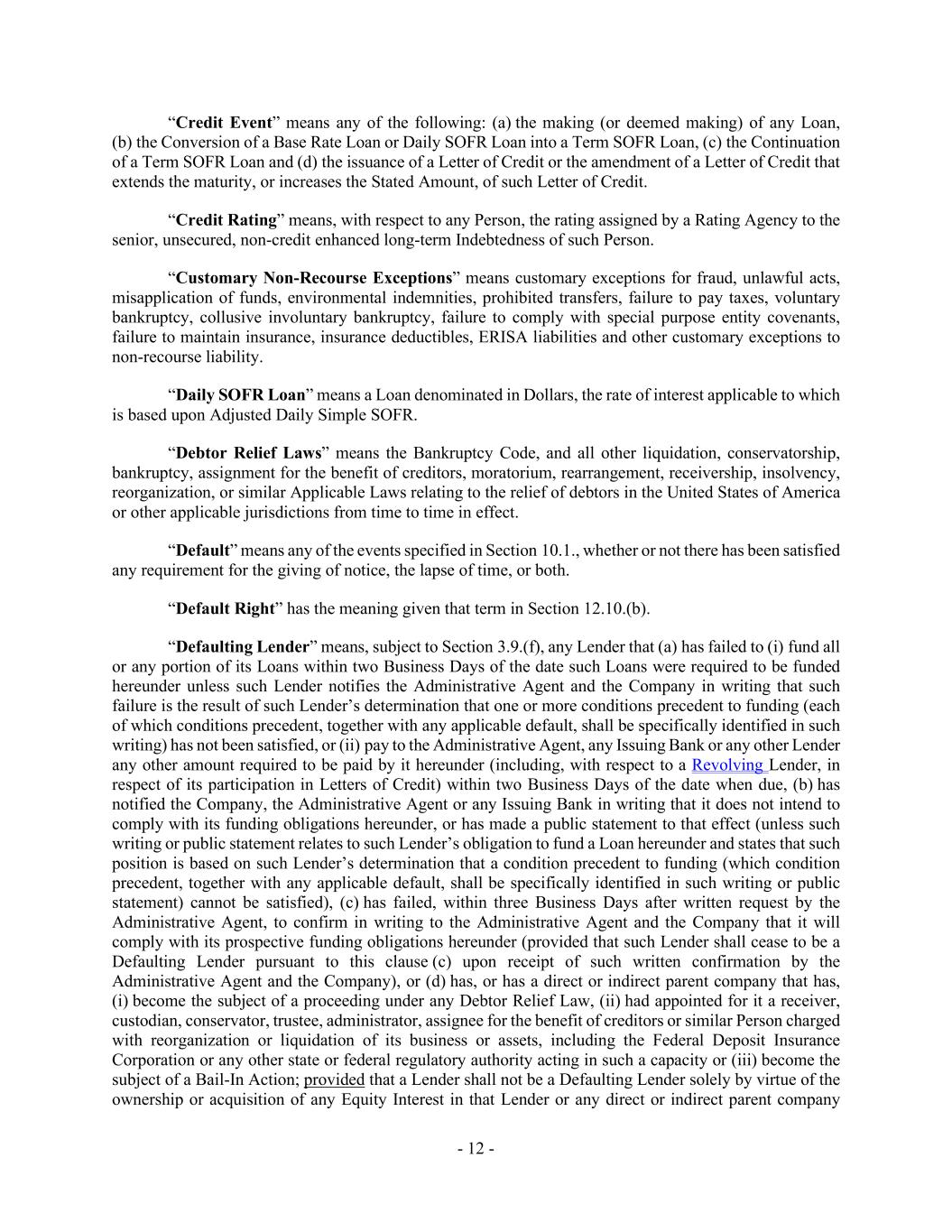 - 12 - “Credit Event” means any of the following: (a) the making (or deemed making) of any Loan, (b) the Conversion of a Base Rate Loan or Daily SOFR Loan into a Term SOFR Loan, (c) the Continuation of a Term SOFR Loan and (d) the issuance of a Letter of Credit or the amendment of a Letter of Credit that extends the maturity, or increases the Stated Amount, of such Letter of Credit. “Credit Rating” means, with respect to any Person, the rating assigned by a Rating Agency to the senior, unsecured, non-credit enhanced long-term Indebtedness of such Person. “Customary Non-Recourse Exceptions” means customary exceptions for fraud, unlawful acts, misapplication of funds, environmental indemnities, prohibited transfers, failure to pay taxes, voluntary bankruptcy, collusive involuntary bankruptcy, failure to comply with special purpose entity covenants, failure to maintain insurance, insurance deductibles, ERISA liabilities and other customary exceptions to non-recourse liability. “Daily SOFR Loan” means a Loan denominated in Dollars, the rate of interest applicable to which is based upon Adjusted Daily Simple SOFR. “Debtor Relief Laws” means the Bankruptcy Code, and all other liquidation, conservatorship, bankruptcy, assignment for the benefit of creditors, moratorium, rearrangement, receivership, insolvency, reorganization, or similar Applicable Laws relating to the relief of debtors in the United States of America or other applicable jurisdictions from time to time in effect. “Default” means any of the events specified in Section 10.1., whether or not there has been satisfied any requirement for the giving of notice, the lapse of time, or both. “Default Right” has the meaning given that term in Section 12.10.(b). “Defaulting Lender” means, subject to Section 3.9.(f), any Lender that (a) has failed to (i) fund all or any portion of its Loans within two Business Days of the date such Loans were required to be funded hereunder unless such Lender notifies the Administrative Agent and the Company in writing that such failure is the result of such Lender’s determination that one or more conditions precedent to funding (each of which conditions precedent, together with any applicable default, shall be specifically identified in such writing) has not been satisfied, or (ii) pay to the Administrative Agent, any Issuing Bank or any other Lender any other amount required to be paid by it hereunder (including, with respect to a Revolving Lender, in respect of its participation in Letters of Credit) within two Business Days of the date when due, (b) has notified the Company, the Administrative Agent or any Issuing Bank in writing that it does not intend to comply with its funding obligations hereunder, or has made a public statement to that effect (unless such writing or public statement relates to such Lender’s obligation to fund a Loan hereunder and states that such position is based on such Lender’s determination that a condition precedent to funding (which condition precedent, together with any applicable default, shall be specifically identified in such writing or public statement) cannot be satisfied), (c) has failed, within three Business Days after written request by the Administrative Agent, to confirm in writing to the Administrative Agent and the Company that it will comply with its prospective funding obligations hereunder (provided that such Lender shall cease to be a Defaulting Lender pursuant to this clause (c) upon receipt of such written confirmation by the Administrative Agent and the Company), or (d) has, or has a direct or indirect parent company that has, (i) become the subject of a proceeding under any Debtor Relief Law, (ii) had appointed for it a receiver, custodian, conservator, trustee, administrator, assignee for the benefit of creditors or similar Person charged with reorganization or liquidation of its business or assets, including the Federal Deposit Insurance Corporation or any other state or federal regulatory authority acting in such a capacity or (iii) become the subject of a Bail-In Action; provided that a Lender shall not be a Defaulting Lender solely by virtue of the ownership or acquisition of any Equity Interest in that Lender or any direct or indirect parent company
