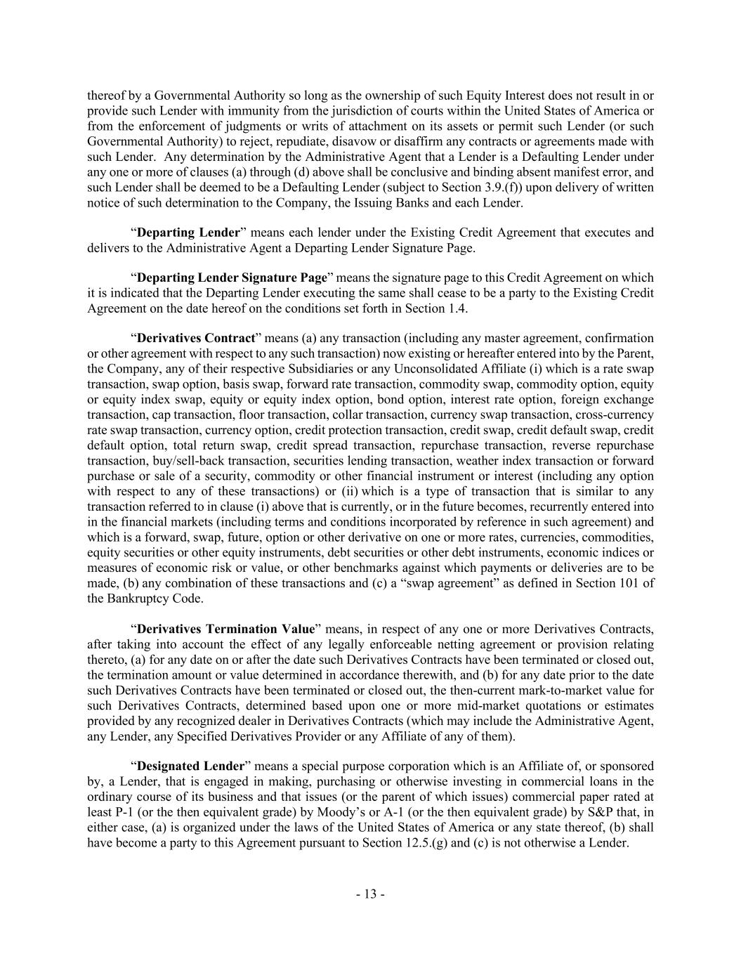 - 13 - thereof by a Governmental Authority so long as the ownership of such Equity Interest does not result in or provide such Lender with immunity from the jurisdiction of courts within the United States of America or from the enforcement of judgments or writs of attachment on its assets or permit such Lender (or such Governmental Authority) to reject, repudiate, disavow or disaffirm any contracts or agreements made with such Lender. Any determination by the Administrative Agent that a Lender is a Defaulting Lender under any one or more of clauses (a) through (d) above shall be conclusive and binding absent manifest error, and such Lender shall be deemed to be a Defaulting Lender (subject to Section 3.9.(f)) upon delivery of written notice of such determination to the Company, the Issuing Banks and each Lender. “Departing Lender” means each lender under the Existing Credit Agreement that executes and delivers to the Administrative Agent a Departing Lender Signature Page. “Departing Lender Signature Page” means the signature page to this Credit Agreement on which it is indicated that the Departing Lender executing the same shall cease to be a party to the Existing Credit Agreement on the date hereof on the conditions set forth in Section 1.4. “Derivatives Contract” means (a) any transaction (including any master agreement, confirmation or other agreement with respect to any such transaction) now existing or hereafter entered into by the Parent, the Company, any of their respective Subsidiaries or any Unconsolidated Affiliate (i) which is a rate swap transaction, swap option, basis swap, forward rate transaction, commodity swap, commodity option, equity or equity index swap, equity or equity index option, bond option, interest rate option, foreign exchange transaction, cap transaction, floor transaction, collar transaction, currency swap transaction, cross-currency rate swap transaction, currency option, credit protection transaction, credit swap, credit default swap, credit default option, total return swap, credit spread transaction, repurchase transaction, reverse repurchase transaction, buy/sell-back transaction, securities lending transaction, weather index transaction or forward purchase or sale of a security, commodity or other financial instrument or interest (including any option with respect to any of these transactions) or (ii) which is a type of transaction that is similar to any transaction referred to in clause (i) above that is currently, or in the future becomes, recurrently entered into in the financial markets (including terms and conditions incorporated by reference in such agreement) and which is a forward, swap, future, option or other derivative on one or more rates, currencies, commodities, equity securities or other equity instruments, debt securities or other debt instruments, economic indices or measures of economic risk or value, or other benchmarks against which payments or deliveries are to be made, (b) any combination of these transactions and (c) a “swap agreement” as defined in Section 101 of the Bankruptcy Code. “Derivatives Termination Value” means, in respect of any one or more Derivatives Contracts, after taking into account the effect of any legally enforceable netting agreement or provision relating thereto, (a) for any date on or after the date such Derivatives Contracts have been terminated or closed out, the termination amount or value determined in accordance therewith, and (b) for any date prior to the date such Derivatives Contracts have been terminated or closed out, the then-current mark-to-market value for such Derivatives Contracts, determined based upon one or more mid-market quotations or estimates provided by any recognized dealer in Derivatives Contracts (which may include the Administrative Agent, any Lender, any Specified Derivatives Provider or any Affiliate of any of them). “Designated Lender” means a special purpose corporation which is an Affiliate of, or sponsored by, a Lender, that is engaged in making, purchasing or otherwise investing in commercial loans in the ordinary course of its business and that issues (or the parent of which issues) commercial paper rated at least P-1 (or the then equivalent grade) by Moody’s or A-1 (or the then equivalent grade) by S&P that, in either case, (a) is organized under the laws of the United States of America or any state thereof, (b) shall have become a party to this Agreement pursuant to Section 12.5.(g) and (c) is not otherwise a Lender.