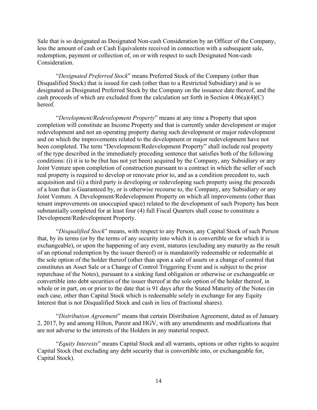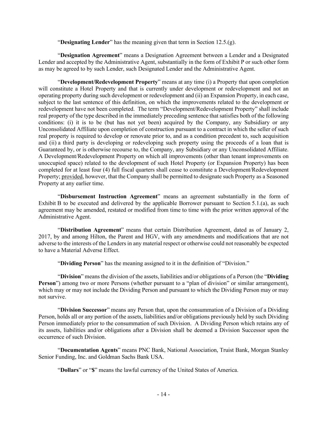 - 14 - “Designating Lender” has the meaning given that term in Section 12.5.(g). “Designation Agreement” means a Designation Agreement between a Lender and a Designated Lender and accepted by the Administrative Agent, substantially in the form of Exhibit P or such other form as may be agreed to by such Lender, such Designated Lender and the Administrative Agent. “Development/Redevelopment Property” means at any time (i) a Property that upon completion will constitute a Hotel Property and that is currently under development or redevelopment and not an operating property during such development or redevelopment and (ii) an Expansion Property, in each case, subject to the last sentence of this definition, on which the improvements related to the development or redevelopment have not been completed. The term “Development/Redevelopment Property” shall include real property of the type described in the immediately preceding sentence that satisfies both of the following conditions: (i) it is to be (but has not yet been) acquired by the Company, any Subsidiary or any Unconsolidated Affiliate upon completion of construction pursuant to a contract in which the seller of such real property is required to develop or renovate prior to, and as a condition precedent to, such acquisition and (ii) a third party is developing or redeveloping such property using the proceeds of a loan that is Guaranteed by, or is otherwise recourse to, the Company, any Subsidiary or any Unconsolidated Affiliate. A Development/Redevelopment Property on which all improvements (other than tenant improvements on unoccupied space) related to the development of such Hotel Property (or Expansion Property) has been completed for at least four (4) full fiscal quarters shall cease to constitute a Development/Redevelopment Property; provided, however, that the Company shall be permitted to designate such Property as a Seasoned Property at any earlier time. “Disbursement Instruction Agreement” means an agreement substantially in the form of Exhibit B to be executed and delivered by the applicable Borrower pursuant to Section 5.1.(a), as such agreement may be amended, restated or modified from time to time with the prior written approval of the Administrative Agent. “Distribution Agreement” means that certain Distribution Agreement, dated as of January 2, 2017, by and among Hilton, the Parent and HGV, with any amendments and modifications that are not adverse to the interests of the Lenders in any material respect or otherwise could not reasonably be expected to have a Material Adverse Effect. “Dividing Person” has the meaning assigned to it in the definition of “Division.” “Division” means the division of the assets, liabilities and/or obligations of a Person (the “Dividing Person”) among two or more Persons (whether pursuant to a “plan of division” or similar arrangement), which may or may not include the Dividing Person and pursuant to which the Dividing Person may or may not survive. “Division Successor” means any Person that, upon the consummation of a Division of a Dividing Person, holds all or any portion of the assets, liabilities and/or obligations previously held by such Dividing Person immediately prior to the consummation of such Division. A Dividing Person which retains any of its assets, liabilities and/or obligations after a Division shall be deemed a Division Successor upon the occurrence of such Division. “Documentation Agents” means PNC Bank, National Association, Truist Bank, Morgan Stanley Senior Funding, Inc. and Goldman Sachs Bank USA. “Dollars” or “$” means the lawful currency of the United States of America.