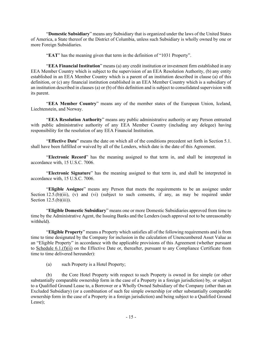 - 15 - “Domestic Subsidiary” means any Subsidiary that is organized under the laws of the United States of America, a State thereof or the District of Columbia, unless such Subsidiary is wholly owned by one or more Foreign Subsidiaries. “EAT” has the meaning given that term in the definition of “1031 Property”. “EEA Financial Institution” means (a) any credit institution or investment firm established in any EEA Member Country which is subject to the supervision of an EEA Resolution Authority, (b) any entity established in an EEA Member Country which is a parent of an institution described in clause (a) of this definition, or (c) any financial institution established in an EEA Member Country which is a subsidiary of an institution described in clauses (a) or (b) of this definition and is subject to consolidated supervision with its parent. “EEA Member Country” means any of the member states of the European Union, Iceland, Liechtenstein, and Norway. “EEA Resolution Authority” means any public administrative authority or any Person entrusted with public administrative authority of any EEA Member Country (including any delegee) having responsibility for the resolution of any EEA Financial Institution. “Effective Date” means the date on which all of the conditions precedent set forth in Section 5.1. shall have been fulfilled or waived by all of the Lenders, which date is the date of this Agreement. “Electronic Record” has the meaning assigned to that term in, and shall be interpreted in accordance with, 15 U.S.C. 7006. “Electronic Signature” has the meaning assigned to that term in, and shall be interpreted in accordance with, 15 U.S.C. 7006. “Eligible Assignee” means any Person that meets the requirements to be an assignee under Section 12.5.(b)(iii), (v) and (vi) (subject to such consents, if any, as may be required under Section 12.5.(b)(iii)). “Eligible Domestic Subsidiary” means one or more Domestic Subsidiaries approved from time to time by the Administrative Agent, the Issuing Banks and the Lenders (such approval not to be unreasonably withheld). “Eligible Property” means a Property which satisfies all of the following requirements and is from time to time designated by the Company for inclusion in the calculation of Unencumbered Asset Value as an “Eligible Property” in accordance with the applicable provisions of this Agreement (whether pursuant to Schedule 6.1.(f)(ii) on the Effective Date or, thereafter, pursuant to any Compliance Certificate from time to time delivered hereunder): (a) such Property is a Hotel Property; (b) the Core Hotel Property with respect to such Property is owned in fee simple (or other substantially comparable ownership form in the case of a Property in a foreign jurisdiction) by, or subject to a Qualified Ground Lease to, a Borrower or a Wholly Owned Subsidiary of the Company (other than an Excluded Subsidiary) (or a combination of such fee simple ownership (or other substantially comparable ownership form in the case of a Property in a foreign jurisdiction) and being subject to a Qualified Ground Lease);