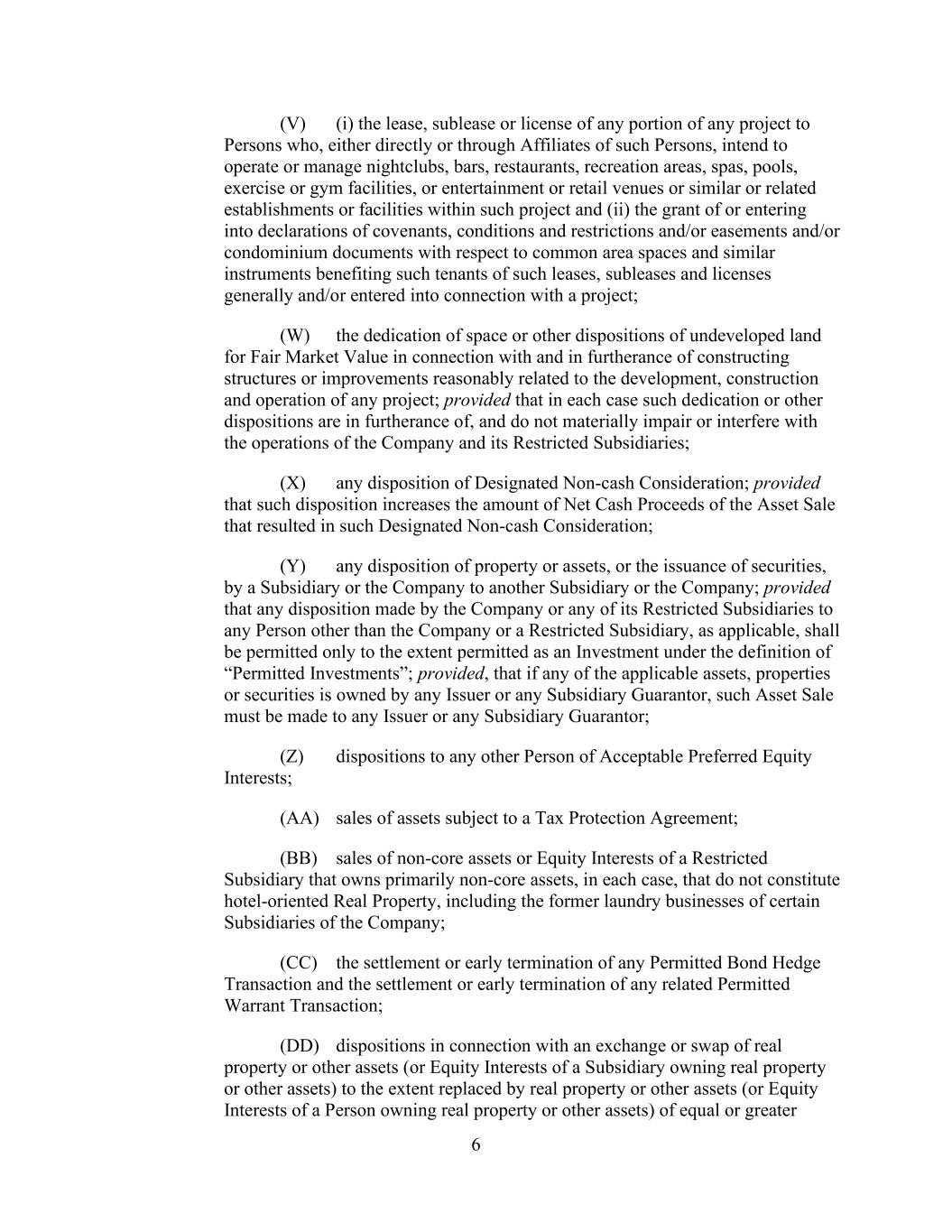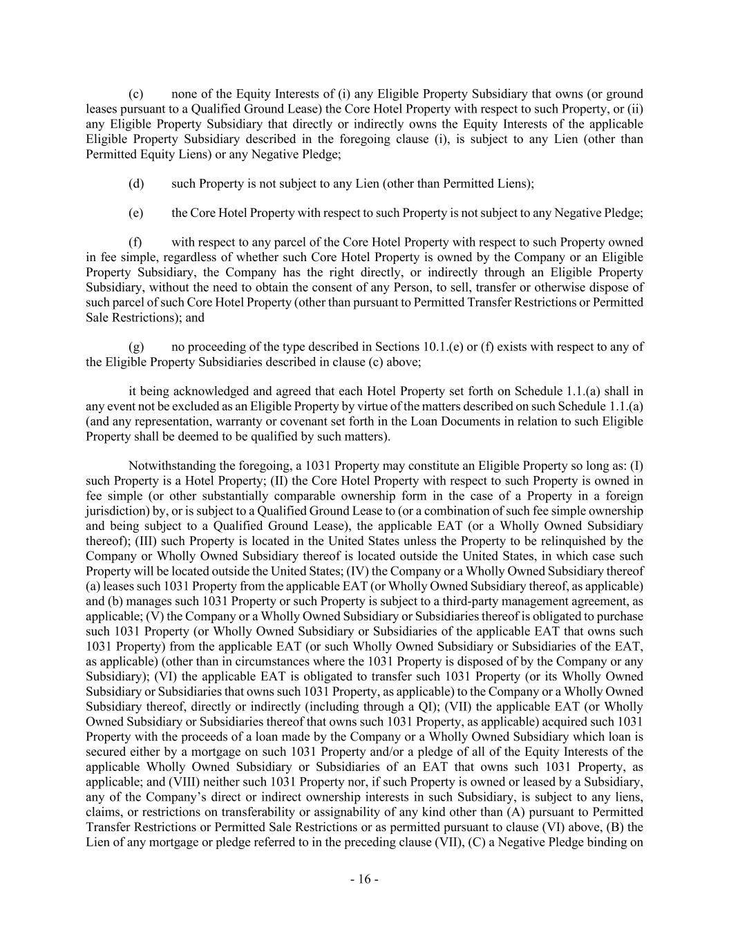 - 16 - (c) none of the Equity Interests of (i) any Eligible Property Subsidiary that owns (or ground leases pursuant to a Qualified Ground Lease) the Core Hotel Property with respect to such Property, or (ii) any Eligible Property Subsidiary that directly or indirectly owns the Equity Interests of the applicable Eligible Property Subsidiary described in the foregoing clause (i), is subject to any Lien (other than Permitted Equity Liens) or any Negative Pledge; (d) such Property is not subject to any Lien (other than Permitted Liens); (e) the Core Hotel Property with respect to such Property is not subject to any Negative Pledge; (f) with respect to any parcel of the Core Hotel Property with respect to such Property owned in fee simple, regardless of whether such Core Hotel Property is owned by the Company or an Eligible Property Subsidiary, the Company has the right directly, or indirectly through an Eligible Property Subsidiary, without the need to obtain the consent of any Person, to sell, transfer or otherwise dispose of such parcel of such Core Hotel Property (other than pursuant to Permitted Transfer Restrictions or Permitted Sale Restrictions); and (g) no proceeding of the type described in Sections 10.1.(e) or (f) exists with respect to any of the Eligible Property Subsidiaries described in clause (c) above; it being acknowledged and agreed that each Hotel Property set forth on Schedule 1.1.(a) shall in any event not be excluded as an Eligible Property by virtue of the matters described on such Schedule 1.1.(a) (and any representation, warranty or covenant set forth in the Loan Documents in relation to such Eligible Property shall be deemed to be qualified by such matters). Notwithstanding the foregoing, a 1031 Property may constitute an Eligible Property so long as: (I) such Property is a Hotel Property; (II) the Core Hotel Property with respect to such Property is owned in fee simple (or other substantially comparable ownership form in the case of a Property in a foreign jurisdiction) by, or is subject to a Qualified Ground Lease to (or a combination of such fee simple ownership and being subject to a Qualified Ground Lease), the applicable EAT (or a Wholly Owned Subsidiary thereof); (III) such Property is located in the United States unless the Property to be relinquished by the Company or Wholly Owned Subsidiary thereof is located outside the United States, in which case such Property will be located outside the United States; (IV) the Company or a Wholly Owned Subsidiary thereof (a) leases such 1031 Property from the applicable EAT (or Wholly Owned Subsidiary thereof, as applicable) and (b) manages such 1031 Property or such Property is subject to a third-party management agreement, as applicable; (V) the Company or a Wholly Owned Subsidiary or Subsidiaries thereof is obligated to purchase such 1031 Property (or Wholly Owned Subsidiary or Subsidiaries of the applicable EAT that owns such 1031 Property) from the applicable EAT (or such Wholly Owned Subsidiary or Subsidiaries of the EAT, as applicable) (other than in circumstances where the 1031 Property is disposed of by the Company or any Subsidiary); (VI) the applicable EAT is obligated to transfer such 1031 Property (or its Wholly Owned Subsidiary or Subsidiaries that owns such 1031 Property, as applicable) to the Company or a Wholly Owned Subsidiary thereof, directly or indirectly (including through a QI); (VII) the applicable EAT (or Wholly Owned Subsidiary or Subsidiaries thereof that owns such 1031 Property, as applicable) acquired such 1031 Property with the proceeds of a loan made by the Company or a Wholly Owned Subsidiary which loan is secured either by a mortgage on such 1031 Property and/or a pledge of all of the Equity Interests of the applicable Wholly Owned Subsidiary or Subsidiaries of an EAT that owns such 1031 Property, as applicable; and (VIII) neither such 1031 Property nor, if such Property is owned or leased by a Subsidiary, any of the Company’s direct or indirect ownership interests in such Subsidiary, is subject to any liens, claims, or restrictions on transferability or assignability of any kind other than (A) pursuant to Permitted Transfer Restrictions or Permitted Sale Restrictions or as permitted pursuant to clause (VI) above, (B) the Lien of any mortgage or pledge referred to in the preceding clause (VII), (C) a Negative Pledge binding on