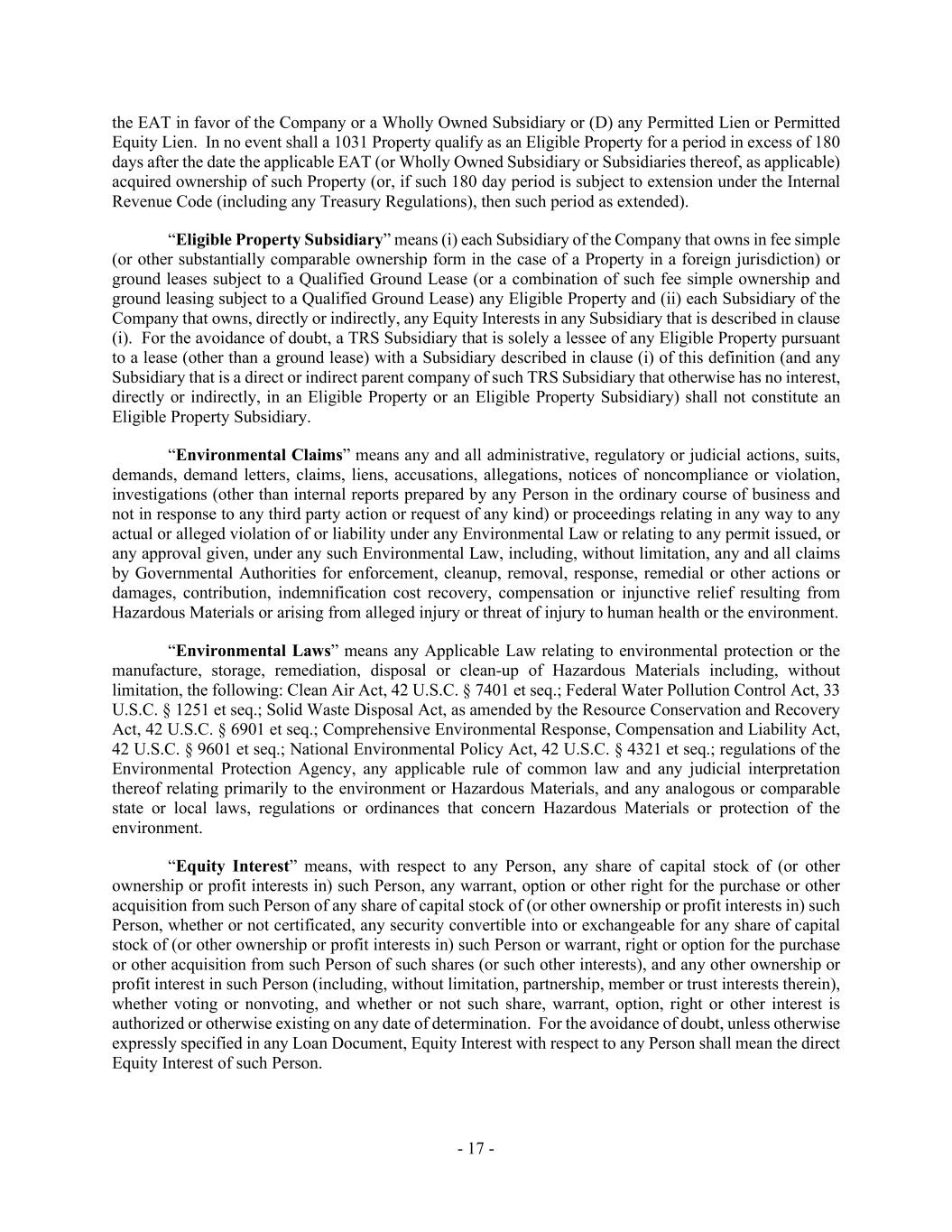 - 17 - the EAT in favor of the Company or a Wholly Owned Subsidiary or (D) any Permitted Lien or Permitted Equity Lien. In no event shall a 1031 Property qualify as an Eligible Property for a period in excess of 180 days after the date the applicable EAT (or Wholly Owned Subsidiary or Subsidiaries thereof, as applicable) acquired ownership of such Property (or, if such 180 day period is subject to extension under the Internal Revenue Code (including any Treasury Regulations), then such period as extended). “Eligible Property Subsidiary” means (i) each Subsidiary of the Company that owns in fee simple (or other substantially comparable ownership form in the case of a Property in a foreign jurisdiction) or ground leases subject to a Qualified Ground Lease (or a combination of such fee simple ownership and ground leasing subject to a Qualified Ground Lease) any Eligible Property and (ii) each Subsidiary of the Company that owns, directly or indirectly, any Equity Interests in any Subsidiary that is described in clause (i). For the avoidance of doubt, a TRS Subsidiary that is solely a lessee of any Eligible Property pursuant to a lease (other than a ground lease) with a Subsidiary described in clause (i) of this definition (and any Subsidiary that is a direct or indirect parent company of such TRS Subsidiary that otherwise has no interest, directly or indirectly, in an Eligible Property or an Eligible Property Subsidiary) shall not constitute an Eligible Property Subsidiary. “Environmental Claims” means any and all administrative, regulatory or judicial actions, suits, demands, demand letters, claims, liens, accusations, allegations, notices of noncompliance or violation, investigations (other than internal reports prepared by any Person in the ordinary course of business and not in response to any third party action or request of any kind) or proceedings relating in any way to any actual or alleged violation of or liability under any Environmental Law or relating to any permit issued, or any approval given, under any such Environmental Law, including, without limitation, any and all claims by Governmental Authorities for enforcement, cleanup, removal, response, remedial or other actions or damages, contribution, indemnification cost recovery, compensation or injunctive relief resulting from Hazardous Materials or arising from alleged injury or threat of injury to human health or the environment. “Environmental Laws” means any Applicable Law relating to environmental protection or the manufacture, storage, remediation, disposal or clean-up of Hazardous Materials including, without limitation, the following: Clean Air Act, 42 U.S.C. § 7401 et seq.; Federal Water Pollution Control Act, 33 U.S.C. § 1251 et seq.; Solid Waste Disposal Act, as amended by the Resource Conservation and Recovery Act, 42 U.S.C. § 6901 et seq.; Comprehensive Environmental Response, Compensation and Liability Act, 42 U.S.C. § 9601 et seq.; National Environmental Policy Act, 42 U.S.C. § 4321 et seq.; regulations of the Environmental Protection Agency, any applicable rule of common law and any judicial interpretation thereof relating primarily to the environment or Hazardous Materials, and any analogous or comparable state or local laws, regulations or ordinances that concern Hazardous Materials or protection of the environment. “Equity Interest” means, with respect to any Person, any share of capital stock of (or other ownership or profit interests in) such Person, any warrant, option or other right for the purchase or other acquisition from such Person of any share of capital stock of (or other ownership or profit interests in) such Person, whether or not certificated, any security convertible into or exchangeable for any share of capital stock of (or other ownership or profit interests in) such Person or warrant, right or option for the purchase or other acquisition from such Person of such shares (or such other interests), and any other ownership or profit interest in such Person (including, without limitation, partnership, member or trust interests therein), whether voting or nonvoting, and whether or not such share, warrant, option, right or other interest is authorized or otherwise existing on any date of determination. For the avoidance of doubt, unless otherwise expressly specified in any Loan Document, Equity Interest with respect to any Person shall mean the direct Equity Interest of such Person.