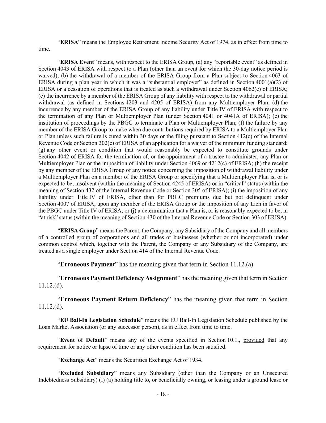 - 18 - “ERISA” means the Employee Retirement Income Security Act of 1974, as in effect from time to time. “ERISA Event” means, with respect to the ERISA Group, (a) any “reportable event” as defined in Section 4043 of ERISA with respect to a Plan (other than an event for which the 30-day notice period is waived); (b) the withdrawal of a member of the ERISA Group from a Plan subject to Section 4063 of ERISA during a plan year in which it was a “substantial employer” as defined in Section 4001(a)(2) of ERISA or a cessation of operations that is treated as such a withdrawal under Section 4062(e) of ERISA; (c) the incurrence by a member of the ERISA Group of any liability with respect to the withdrawal or partial withdrawal (as defined in Sections 4203 and 4205 of ERISA) from any Multiemployer Plan; (d) the incurrence by any member of the ERISA Group of any liability under Title IV of ERISA with respect to the termination of any Plan or Multiemployer Plan (under Section 4041 or 4041A of ERISA); (e) the institution of proceedings by the PBGC to terminate a Plan or Multiemployer Plan; (f) the failure by any member of the ERISA Group to make when due contributions required by ERISA to a Multiemployer Plan or Plan unless such failure is cured within 30 days or the filing pursuant to Section 412(c) of the Internal Revenue Code or Section 302(c) of ERISA of an application for a waiver of the minimum funding standard; (g) any other event or condition that would reasonably be expected to constitute grounds under Section 4042 of ERISA for the termination of, or the appointment of a trustee to administer, any Plan or Multiemployer Plan or the imposition of liability under Section 4069 or 4212(c) of ERISA; (h) the receipt by any member of the ERISA Group of any notice concerning the imposition of withdrawal liability under a Multiemployer Plan on a member of the ERISA Group or specifying that a Multiemployer Plan is, or is expected to be, insolvent (within the meaning of Section 4245 of ERISA) or in “critical” status (within the meaning of Section 432 of the Internal Revenue Code or Section 305 of ERISA); (i) the imposition of any liability under Title IV of ERISA, other than for PBGC premiums due but not delinquent under Section 4007 of ERISA, upon any member of the ERISA Group or the imposition of any Lien in favor of the PBGC under Title IV of ERISA; or (j) a determination that a Plan is, or is reasonably expected to be, in “at risk” status (within the meaning of Section 430 of the Internal Revenue Code or Section 303 of ERISA). “ERISA Group” means the Parent, the Company, any Subsidiary of the Company and all members of a controlled group of corporations and all trades or businesses (whether or not incorporated) under common control which, together with the Parent, the Company or any Subsidiary of the Company, are treated as a single employer under Section 414 of the Internal Revenue Code. “Erroneous Payment” has the meaning given that term in Section 11.12.(a). “Erroneous Payment Deficiency Assignment” has the meaning given that term in Section 11.12.(d). “Erroneous Payment Return Deficiency” has the meaning given that term in Section 11.12.(d). “EU Bail-In Legislation Schedule” means the EU Bail-In Legislation Schedule published by the Loan Market Association (or any successor person), as in effect from time to time. “Event of Default” means any of the events specified in Section 10.1., provided that any requirement for notice or lapse of time or any other condition has been satisfied. “Exchange Act” means the Securities Exchange Act of 1934. “Excluded Subsidiary” means any Subsidiary (other than the Company or an Unsecured Indebtedness Subsidiary) (I) (a) holding title to, or beneficially owning, or leasing under a ground lease or