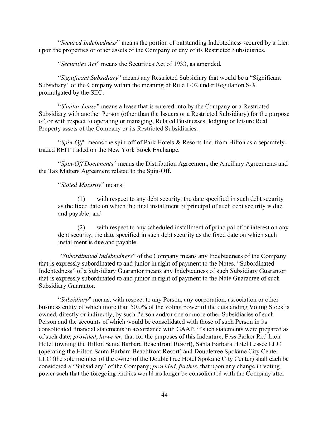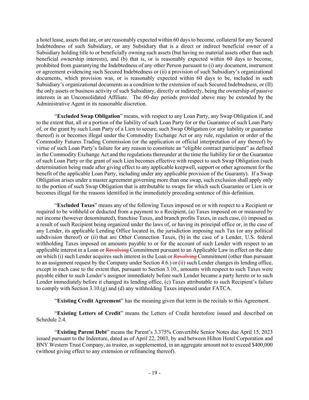 - 19 - a hotel lease, assets that are, or are reasonably expected within 60 days to become, collateral for any Secured Indebtedness of such Subsidiary, or any Subsidiary that is a direct or indirect beneficial owner of a Subsidiary holding title to or beneficially owning such assets (but having no material assets other than such beneficial ownership interests), and (b) that is, or is reasonably expected within 60 days to become, prohibited from guarantying the Indebtedness of any other Person pursuant to (i) any document, instrument or agreement evidencing such Secured Indebtedness or (ii) a provision of such Subsidiary’s organizational documents, which provision was, or is reasonably expected within 60 days to be, included in such Subsidiary’s organizational documents as a condition to the extension of such Secured Indebtedness, or (II) the only assets or business activity of such Subsidiary, directly or indirectly, being the ownership of passive interests in an Unconsolidated Affiliate. The 60-day periods provided above may be extended by the Administrative Agent in its reasonable discretion. “Excluded Swap Obligation” means, with respect to any Loan Party, any Swap Obligation if, and to the extent that, all or a portion of the liability of such Loan Party for or the Guarantee of such Loan Party of, or the grant by such Loan Party of a Lien to secure, such Swap Obligation (or any liability or guarantee thereof) is or becomes illegal under the Commodity Exchange Act or any rule, regulation or order of the Commodity Futures Trading Commission (or the application or official interpretation of any thereof) by virtue of such Loan Party’s failure for any reason to constitute an “eligible contract participant” as defined in the Commodity Exchange Act and the regulations thereunder at the time the liability for or the Guarantee of such Loan Party or the grant of such Lien becomes effective with respect to such Swap Obligation (such determination being made after giving effect to any applicable keepwell, support or other agreement for the benefit of the applicable Loan Party, including under any applicable provision of the Guaranty). If a Swap Obligation arises under a master agreement governing more than one swap, such exclusion shall apply only to the portion of such Swap Obligation that is attributable to swaps for which such Guarantee or Lien is or becomes illegal for the reasons identified in the immediately preceding sentence of this definition. “Excluded Taxes” means any of the following Taxes imposed on or with respect to a Recipient or required to be withheld or deducted from a payment to a Recipient, (a) Taxes imposed on or measured by net income (however denominated), franchise Taxes, and branch profits Taxes, in each case, (i) imposed as a result of such Recipient being organized under the laws of, or having its principal office or, in the case of any Lender, its applicable Lending Office located in, the jurisdiction imposing such Tax (or any political subdivision thereof) or (ii) that are Other Connection Taxes, (b) in the case of a Lender, U.S. federal withholding Taxes imposed on amounts payable to or for the account of such Lender with respect to an applicable interest in a Loan or Revolving Commitment pursuant to an Applicable Law in effect on the date on which (i) such Lender acquires such interest in the Loan or Revolving Commitment (other than pursuant to an assignment request by the Company under Section 4.6.) or (ii) such Lender changes its lending office, except in each case to the extent that, pursuant to Section 3.10., amounts with respect to such Taxes were payable either to such Lender’s assignor immediately before such Lender became a party hereto or to such Lender immediately before it changed its lending office, (c) Taxes attributable to such Recipient’s failure to comply with Section 3.10.(g) and (d) any withholding Taxes imposed under FATCA. “Existing Credit Agreement” has the meaning given that term in the recitals to this Agreement. “Existing Letters of Credit” means the Letters of Credit heretofore issued and described on Schedule 2.4. “Existing Parent Debt” means the Parent’s 3.375% Convertible Senior Notes due April 15, 2023 issued pursuant to the Indenture, dated as of April 22, 2003, by and between Hilton Hotel Corporation and BNY Western Trust Company, as trustee, as supplemented, in an aggregate amount not to exceed $400,000 (without giving effect to any extension or refinancing thereof).