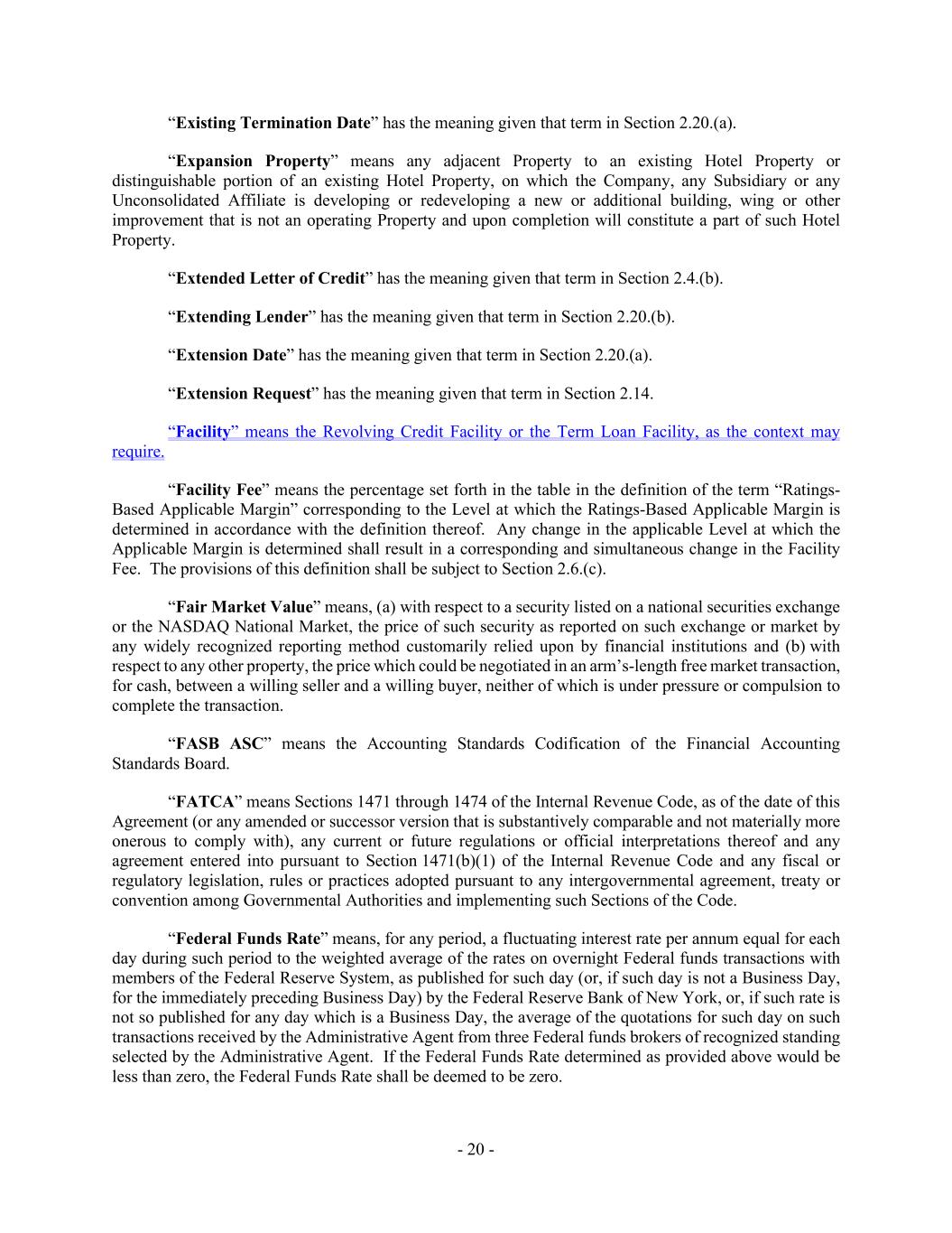 - 20 - “Existing Termination Date” has the meaning given that term in Section 2.20.(a). “Expansion Property” means any adjacent Property to an existing Hotel Property or distinguishable portion of an existing Hotel Property, on which the Company, any Subsidiary or any Unconsolidated Affiliate is developing or redeveloping a new or additional building, wing or other improvement that is not an operating Property and upon completion will constitute a part of such Hotel Property. “Extended Letter of Credit” has the meaning given that term in Section 2.4.(b). “Extending Lender” has the meaning given that term in Section 2.20.(b). “Extension Date” has the meaning given that term in Section 2.20.(a). “Extension Request” has the meaning given that term in Section 2.14. “Facility” means the Revolving Credit Facility or the Term Loan Facility, as the context may require. “Facility Fee” means the percentage set forth in the table in the definition of the term “Ratings- Based Applicable Margin” corresponding to the Level at which the Ratings-Based Applicable Margin is determined in accordance with the definition thereof. Any change in the applicable Level at which the Applicable Margin is determined shall result in a corresponding and simultaneous change in the Facility Fee. The provisions of this definition shall be subject to Section 2.6.(c). “Fair Market Value” means, (a) with respect to a security listed on a national securities exchange or the NASDAQ National Market, the price of such security as reported on such exchange or market by any widely recognized reporting method customarily relied upon by financial institutions and (b) with respect to any other property, the price which could be negotiated in an arm’s-length free market transaction, for cash, between a willing seller and a willing buyer, neither of which is under pressure or compulsion to complete the transaction. “FASB ASC” means the Accounting Standards Codification of the Financial Accounting Standards Board. “FATCA” means Sections 1471 through 1474 of the Internal Revenue Code, as of the date of this Agreement (or any amended or successor version that is substantively comparable and not materially more onerous to comply with), any current or future regulations or official interpretations thereof and any agreement entered into pursuant to Section 1471(b)(1) of the Internal Revenue Code and any fiscal or regulatory legislation, rules or practices adopted pursuant to any intergovernmental agreement, treaty or convention among Governmental Authorities and implementing such Sections of the Code. “Federal Funds Rate” means, for any period, a fluctuating interest rate per annum equal for each day during such period to the weighted average of the rates on overnight Federal funds transactions with members of the Federal Reserve System, as published for such day (or, if such day is not a Business Day, for the immediately preceding Business Day) by the Federal Reserve Bank of New York, or, if such rate is not so published for any day which is a Business Day, the average of the quotations for such day on such transactions received by the Administrative Agent from three Federal funds brokers of recognized standing selected by the Administrative Agent. If the Federal Funds Rate determined as provided above would be less than zero, the Federal Funds Rate shall be deemed to be zero.