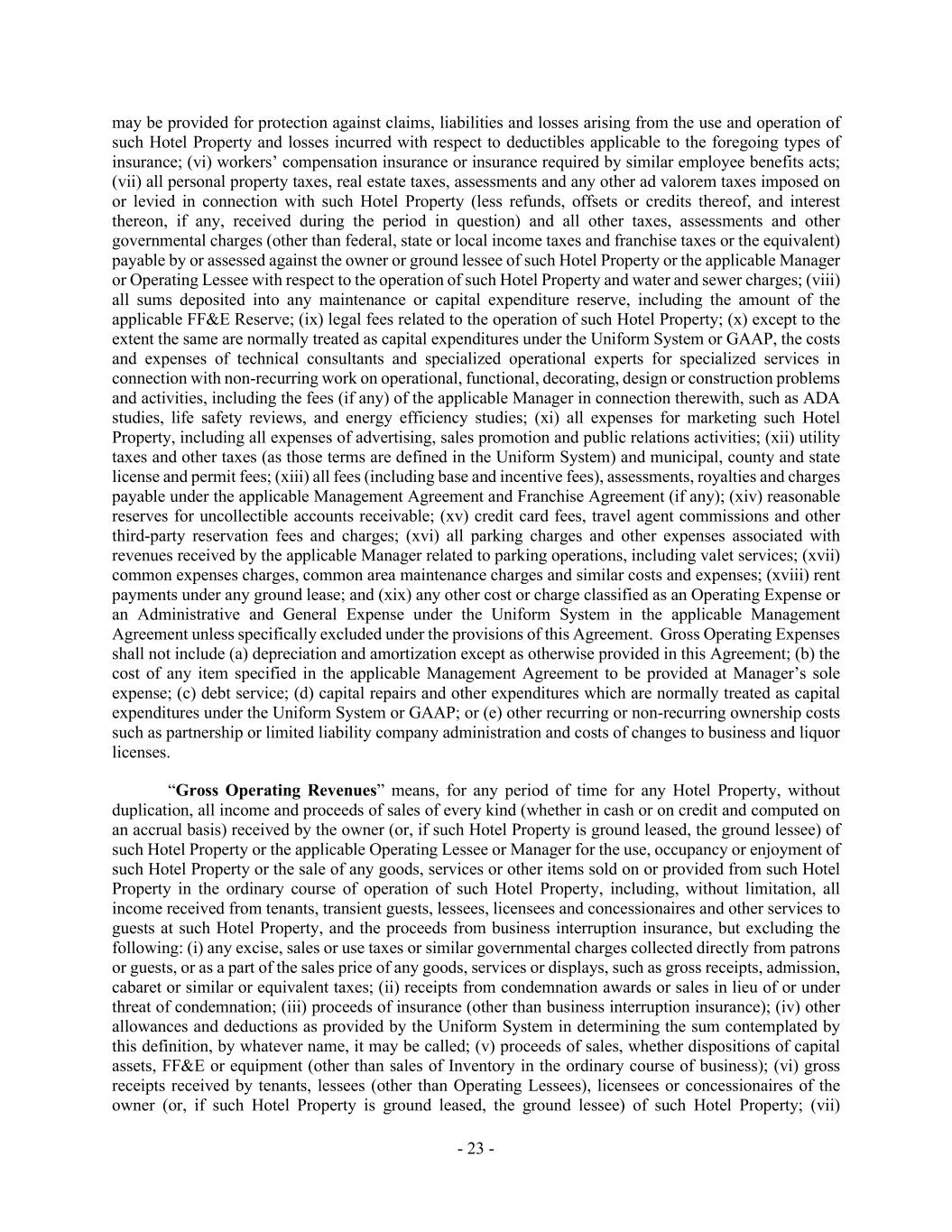 - 23 - may be provided for protection against claims, liabilities and losses arising from the use and operation of such Hotel Property and losses incurred with respect to deductibles applicable to the foregoing types of insurance; (vi) workers’ compensation insurance or insurance required by similar employee benefits acts; (vii) all personal property taxes, real estate taxes, assessments and any other ad valorem taxes imposed on or levied in connection with such Hotel Property (less refunds, offsets or credits thereof, and interest thereon, if any, received during the period in question) and all other taxes, assessments and other governmental charges (other than federal, state or local income taxes and franchise taxes or the equivalent) payable by or assessed against the owner or ground lessee of such Hotel Property or the applicable Manager or Operating Lessee with respect to the operation of such Hotel Property and water and sewer charges; (viii) all sums deposited into any maintenance or capital expenditure reserve, including the amount of the applicable FF&E Reserve; (ix) legal fees related to the operation of such Hotel Property; (x) except to the extent the same are normally treated as capital expenditures under the Uniform System or GAAP, the costs and expenses of technical consultants and specialized operational experts for specialized services in connection with non-recurring work on operational, functional, decorating, design or construction problems and activities, including the fees (if any) of the applicable Manager in connection therewith, such as ADA studies, life safety reviews, and energy efficiency studies; (xi) all expenses for marketing such Hotel Property, including all expenses of advertising, sales promotion and public relations activities; (xii) utility taxes and other taxes (as those terms are defined in the Uniform System) and municipal, county and state license and permit fees; (xiii) all fees (including base and incentive fees), assessments, royalties and charges payable under the applicable Management Agreement and Franchise Agreement (if any); (xiv) reasonable reserves for uncollectible accounts receivable; (xv) credit card fees, travel agent commissions and other third-party reservation fees and charges; (xvi) all parking charges and other expenses associated with revenues received by the applicable Manager related to parking operations, including valet services; (xvii) common expenses charges, common area maintenance charges and similar costs and expenses; (xviii) rent payments under any ground lease; and (xix) any other cost or charge classified as an Operating Expense or an Administrative and General Expense under the Uniform System in the applicable Management Agreement unless specifically excluded under the provisions of this Agreement. Gross Operating Expenses shall not include (a) depreciation and amortization except as otherwise provided in this Agreement; (b) the cost of any item specified in the applicable Management Agreement to be provided at Manager’s sole expense; (c) debt service; (d) capital repairs and other expenditures which are normally treated as capital expenditures under the Uniform System or GAAP; or (e) other recurring or non-recurring ownership costs such as partnership or limited liability company administration and costs of changes to business and liquor licenses. “Gross Operating Revenues” means, for any period of time for any Hotel Property, without duplication, all income and proceeds of sales of every kind (whether in cash or on credit and computed on an accrual basis) received by the owner (or, if such Hotel Property is ground leased, the ground lessee) of such Hotel Property or the applicable Operating Lessee or Manager for the use, occupancy or enjoyment of such Hotel Property or the sale of any goods, services or other items sold on or provided from such Hotel Property in the ordinary course of operation of such Hotel Property, including, without limitation, all income received from tenants, transient guests, lessees, licensees and concessionaires and other services to guests at such Hotel Property, and the proceeds from business interruption insurance, but excluding the following: (i) any excise, sales or use taxes or similar governmental charges collected directly from patrons or guests, or as a part of the sales price of any goods, services or displays, such as gross receipts, admission, cabaret or similar or equivalent taxes; (ii) receipts from condemnation awards or sales in lieu of or under threat of condemnation; (iii) proceeds of insurance (other than business interruption insurance); (iv) other allowances and deductions as provided by the Uniform System in determining the sum contemplated by this definition, by whatever name, it may be called; (v) proceeds of sales, whether dispositions of capital assets, FF&E or equipment (other than sales of Inventory in the ordinary course of business); (vi) gross receipts received by tenants, lessees (other than Operating Lessees), licensees or concessionaires of the owner (or, if such Hotel Property is ground leased, the ground lessee) of such Hotel Property; (vii)