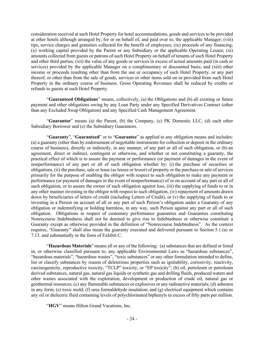 - 24 - consideration received at such Hotel Property for hotel accommodations, goods and services to be provided at other hotels although arranged by, for or on behalf of, and paid over to, the applicable Manager; (viii) tips, service charges and gratuities collected for the benefit of employees; (ix) proceeds of any financing; (x) working capital provided by the Parent or any Subsidiary or the applicable Operating Lessee; (xi) amounts collected from guests or patrons of such Hotel Property on behalf of tenants of such Hotel Property and other third parties; (xii) the value of any goods or services in excess of actual amounts paid (in cash or services) provided by the applicable Manager on a complimentary or discounted basis; and (xiii) other income or proceeds resulting other than from the use or occupancy of such Hotel Property, or any part thereof, or other than from the sale of goods, services or other items sold on or provided from such Hotel Property in the ordinary course of business. Gross Operating Revenues shall be reduced by credits or refunds to guests at such Hotel Property. “Guaranteed Obligations” means, collectively, (a) the Obligations and (b) all existing or future payment and other obligations owing by any Loan Party under any Specified Derivatives Contract (other than any Excluded Swap Obligation) and any Specified Cash Management Agreement. “Guarantor” means (a) the Parent, (b) the Company, (c) PK Domestic LLC, (d) each other Subsidiary Borrower and (e) the Subsidiary Guarantors. “Guaranty”, “Guaranteed” or to “Guarantee” as applied to any obligation means and includes: (a) a guaranty (other than by endorsement of negotiable instruments for collection or deposit in the ordinary course of business), directly or indirectly, in any manner, of any part or all of such obligation, or (b) an agreement, direct or indirect, contingent or otherwise, and whether or not constituting a guaranty, the practical effect of which is to assure the payment or performance (or payment of damages in the event of nonperformance) of any part or all of such obligation whether by: (i) the purchase of securities or obligations, (ii) the purchase, sale or lease (as lessee or lessor) of property or the purchase or sale of services primarily for the purpose of enabling the obligor with respect to such obligation to make any payment or performance (or payment of damages in the event of nonperformance) of or on account of any part or all of such obligation, or to assure the owner of such obligation against loss, (iii) the supplying of funds to or in any other manner investing in the obligor with respect to such obligation, (iv) repayment of amounts drawn down by beneficiaries of letters of credit (including Letters of Credit), or (v) the supplying of funds to or investing in a Person on account of all or any part of such Person’s obligation under a Guaranty of any obligation or indemnifying or holding harmless, in any way, such Person against any part or all of such obligation. Obligations in respect of customary performance guaranties and Guaranties constituting Nonrecourse Indebtedness shall not be deemed to give rise to Indebtedness or otherwise constitute a Guaranty except as otherwise provided in the definition of “Nonrecourse Indebtedness”. As the context requires, “Guaranty” shall also mean the guaranty executed and delivered pursuant to Section 5.1.(a) or 7.13. and substantially in the form of Exhibit C. “Hazardous Materials” means all or any of the following: (a) substances that are defined or listed in, or otherwise classified pursuant to, any applicable Environmental Laws as “hazardous substances”, “hazardous materials”, “hazardous wastes”, “toxic substances” or any other formulation intended to define, list or classify substances by reason of deleterious properties such as ignitability, corrosivity, reactivity, carcinogenicity, reproductive toxicity, “TCLP” toxicity, or “EP toxicity”; (b) oil, petroleum or petroleum derived substances, natural gas, natural gas liquids or synthetic gas and drilling fluids, produced waters and other wastes associated with the exploration, development or production of crude oil, natural gas or geothermal resources; (c) any flammable substances or explosives or any radioactive materials; (d) asbestos in any form; (e) toxic mold; (f) urea formaldehyde insulation; and (g) electrical equipment which contains any oil or dielectric fluid containing levels of polychlorinated biphenyls in excess of fifty parts per million. “HGV” means Hilton Grand Vacations, Inc.