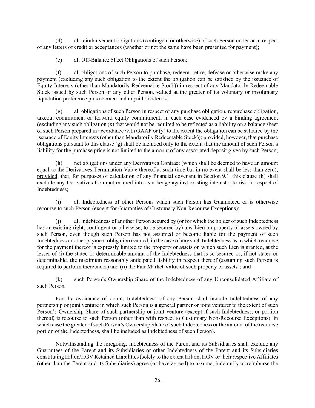 - 26 - (d) all reimbursement obligations (contingent or otherwise) of such Person under or in respect of any letters of credit or acceptances (whether or not the same have been presented for payment); (e) all Off-Balance Sheet Obligations of such Person; (f) all obligations of such Person to purchase, redeem, retire, defease or otherwise make any payment (excluding any such obligation to the extent the obligation can be satisfied by the issuance of Equity Interests (other than Mandatorily Redeemable Stock)) in respect of any Mandatorily Redeemable Stock issued by such Person or any other Person, valued at the greater of its voluntary or involuntary liquidation preference plus accrued and unpaid dividends; (g) all obligations of such Person in respect of any purchase obligation, repurchase obligation, takeout commitment or forward equity commitment, in each case evidenced by a binding agreement (excluding any such obligation (x) that would not be required to be reflected as a liability on a balance sheet of such Person prepared in accordance with GAAP or (y) to the extent the obligation can be satisfied by the issuance of Equity Interests (other than Mandatorily Redeemable Stock)); provided, however, that purchase obligations pursuant to this clause (g) shall be included only to the extent that the amount of such Person’s liability for the purchase price is not limited to the amount of any associated deposit given by such Person; (h) net obligations under any Derivatives Contract (which shall be deemed to have an amount equal to the Derivatives Termination Value thereof at such time but in no event shall be less than zero); provided, that, for purposes of calculation of any financial covenant in Section 9.1. this clause (h) shall exclude any Derivatives Contract entered into as a hedge against existing interest rate risk in respect of Indebtedness; (i) all Indebtedness of other Persons which such Person has Guaranteed or is otherwise recourse to such Person (except for Guaranties of Customary Non-Recourse Exceptions); (j) all Indebtedness of another Person secured by (or for which the holder of such Indebtedness has an existing right, contingent or otherwise, to be secured by) any Lien on property or assets owned by such Person, even though such Person has not assumed or become liable for the payment of such Indebtedness or other payment obligation (valued, in the case of any such Indebtedness as to which recourse for the payment thereof is expressly limited to the property or assets on which such Lien is granted, at the lesser of (i) the stated or determinable amount of the Indebtedness that is so secured or, if not stated or determinable, the maximum reasonably anticipated liability in respect thereof (assuming such Person is required to perform thereunder) and (ii) the Fair Market Value of such property or assets); and (k) such Person’s Ownership Share of the Indebtedness of any Unconsolidated Affiliate of such Person. For the avoidance of doubt, Indebtedness of any Person shall include Indebtedness of any partnership or joint venture in which such Person is a general partner or joint venturer to the extent of such Person’s Ownership Share of such partnership or joint venture (except if such Indebtedness, or portion thereof, is recourse to such Person (other than with respect to Customary Non-Recourse Exceptions), in which case the greater of such Person’s Ownership Share of such Indebtedness or the amount of the recourse portion of the Indebtedness, shall be included as Indebtedness of such Person). Notwithstanding the foregoing, Indebtedness of the Parent and its Subsidiaries shall exclude any Guarantees of the Parent and its Subsidiaries or other Indebtedness of the Parent and its Subsidiaries constituting Hilton/HGV Retained Liabilities (solely to the extent Hilton, HGV or their respective Affiliates (other than the Parent and its Subsidiaries) agree (or have agreed) to assume, indemnify or reimburse the