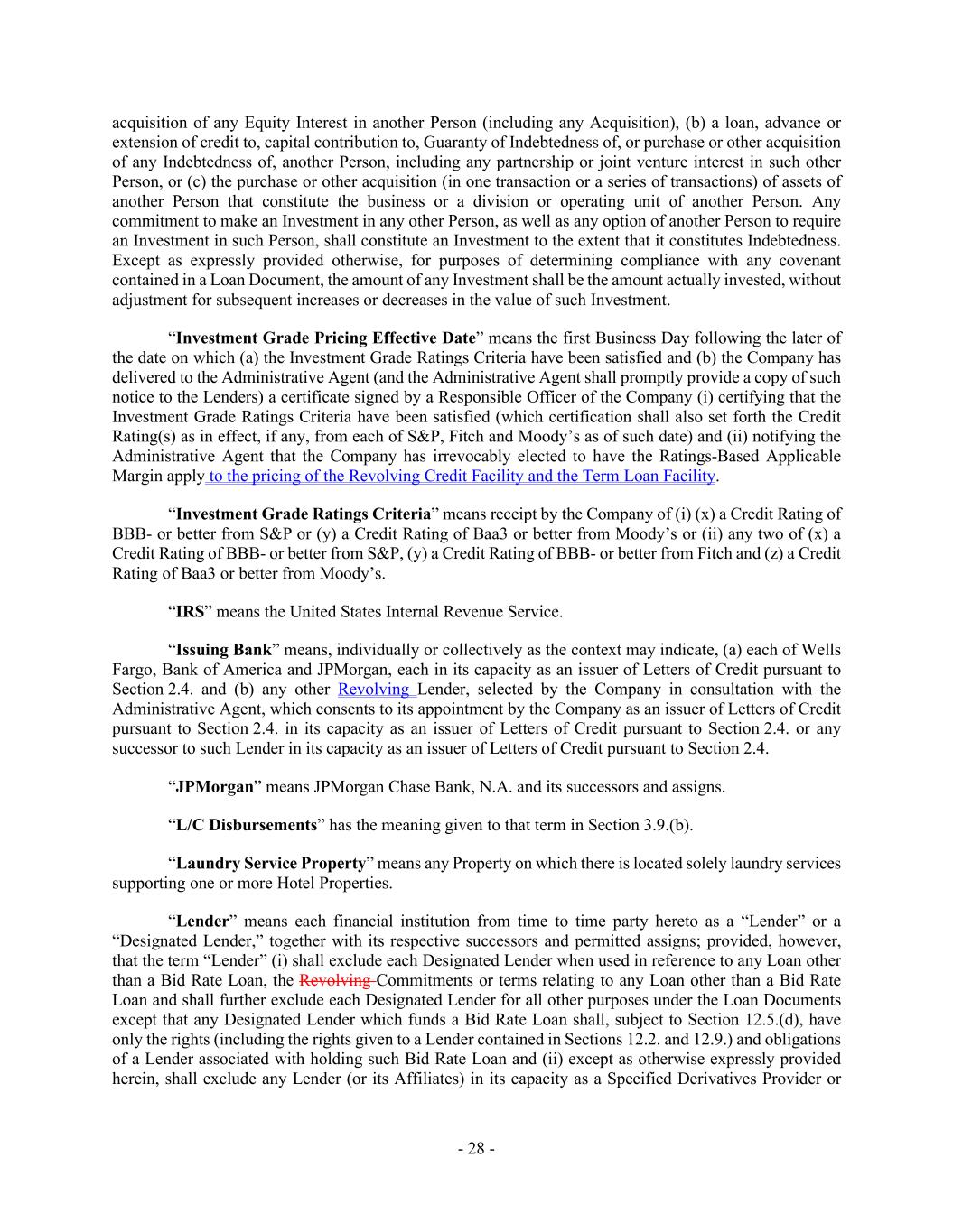 - 28 - acquisition of any Equity Interest in another Person (including any Acquisition), (b) a loan, advance or extension of credit to, capital contribution to, Guaranty of Indebtedness of, or purchase or other acquisition of any Indebtedness of, another Person, including any partnership or joint venture interest in such other Person, or (c) the purchase or other acquisition (in one transaction or a series of transactions) of assets of another Person that constitute the business or a division or operating unit of another Person. Any commitment to make an Investment in any other Person, as well as any option of another Person to require an Investment in such Person, shall constitute an Investment to the extent that it constitutes Indebtedness. Except as expressly provided otherwise, for purposes of determining compliance with any covenant contained in a Loan Document, the amount of any Investment shall be the amount actually invested, without adjustment for subsequent increases or decreases in the value of such Investment. “Investment Grade Pricing Effective Date” means the first Business Day following the later of the date on which (a) the Investment Grade Ratings Criteria have been satisfied and (b) the Company has delivered to the Administrative Agent (and the Administrative Agent shall promptly provide a copy of such notice to the Lenders) a certificate signed by a Responsible Officer of the Company (i) certifying that the Investment Grade Ratings Criteria have been satisfied (which certification shall also set forth the Credit Rating(s) as in effect, if any, from each of S&P, Fitch and Moody’s as of such date) and (ii) notifying the Administrative Agent that the Company has irrevocably elected to have the Ratings-Based Applicable Margin apply to the pricing of the Revolving Credit Facility and the Term Loan Facility. “Investment Grade Ratings Criteria” means receipt by the Company of (i) (x) a Credit Rating of BBB- or better from S&P or (y) a Credit Rating of Baa3 or better from Moody’s or (ii) any two of (x) a Credit Rating of BBB- or better from S&P, (y) a Credit Rating of BBB- or better from Fitch and (z) a Credit Rating of Baa3 or better from Moody’s. “IRS” means the United States Internal Revenue Service. “Issuing Bank” means, individually or collectively as the context may indicate, (a) each of Wells Fargo, Bank of America and JPMorgan, each in its capacity as an issuer of Letters of Credit pursuant to Section 2.4. and (b) any other Revolving Lender, selected by the Company in consultation with the Administrative Agent, which consents to its appointment by the Company as an issuer of Letters of Credit pursuant to Section 2.4. in its capacity as an issuer of Letters of Credit pursuant to Section 2.4. or any successor to such Lender in its capacity as an issuer of Letters of Credit pursuant to Section 2.4. “JPMorgan” means JPMorgan Chase Bank, N.A. and its successors and assigns. “L/C Disbursements” has the meaning given to that term in Section 3.9.(b). “Laundry Service Property” means any Property on which there is located solely laundry services supporting one or more Hotel Properties. “Lender” means each financial institution from time to time party hereto as a “Lender” or a “Designated Lender,” together with its respective successors and permitted assigns; provided, however, that the term “Lender” (i) shall exclude each Designated Lender when used in reference to any Loan other than a Bid Rate Loan, the Revolving Commitments or terms relating to any Loan other than a Bid Rate Loan and shall further exclude each Designated Lender for all other purposes under the Loan Documents except that any Designated Lender which funds a Bid Rate Loan shall, subject to Section 12.5.(d), have only the rights (including the rights given to a Lender contained in Sections 12.2. and 12.9.) and obligations of a Lender associated with holding such Bid Rate Loan and (ii) except as otherwise expressly provided herein, shall exclude any Lender (or its Affiliates) in its capacity as a Specified Derivatives Provider or