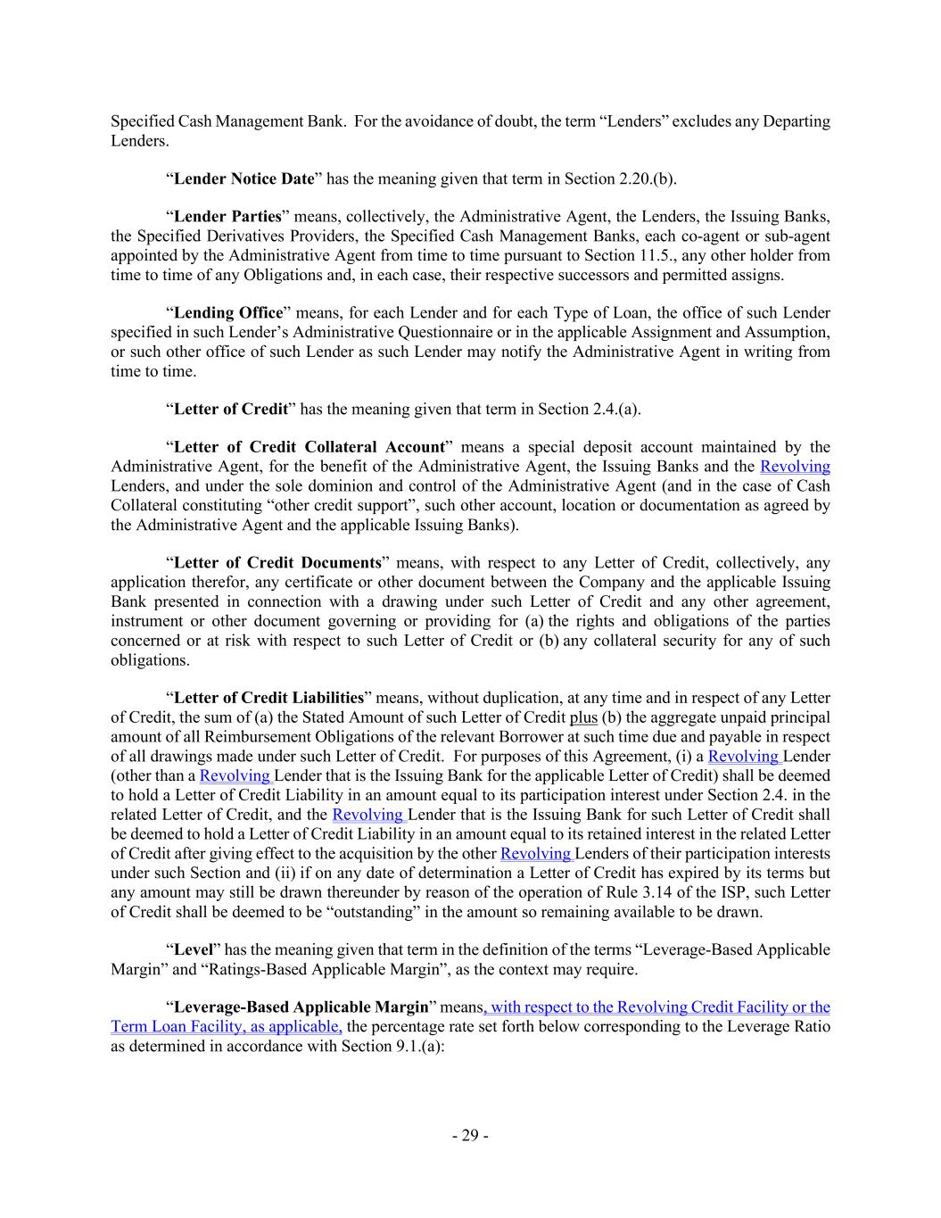 - 29 - Specified Cash Management Bank. For the avoidance of doubt, the term “Lenders” excludes any Departing Lenders. “Lender Notice Date” has the meaning given that term in Section 2.20.(b). “Lender Parties” means, collectively, the Administrative Agent, the Lenders, the Issuing Banks, the Specified Derivatives Providers, the Specified Cash Management Banks, each co-agent or sub-agent appointed by the Administrative Agent from time to time pursuant to Section 11.5., any other holder from time to time of any Obligations and, in each case, their respective successors and permitted assigns. “Lending Office” means, for each Lender and for each Type of Loan, the office of such Lender specified in such Lender’s Administrative Questionnaire or in the applicable Assignment and Assumption, or such other office of such Lender as such Lender may notify the Administrative Agent in writing from time to time. “Letter of Credit” has the meaning given that term in Section 2.4.(a). “Letter of Credit Collateral Account” means a special deposit account maintained by the Administrative Agent, for the benefit of the Administrative Agent, the Issuing Banks and the Revolving Lenders, and under the sole dominion and control of the Administrative Agent (and in the case of Cash Collateral constituting “other credit support”, such other account, location or documentation as agreed by the Administrative Agent and the applicable Issuing Banks). “Letter of Credit Documents” means, with respect to any Letter of Credit, collectively, any application therefor, any certificate or other document between the Company and the applicable Issuing Bank presented in connection with a drawing under such Letter of Credit and any other agreement, instrument or other document governing or providing for (a) the rights and obligations of the parties concerned or at risk with respect to such Letter of Credit or (b) any collateral security for any of such obligations. “Letter of Credit Liabilities” means, without duplication, at any time and in respect of any Letter of Credit, the sum of (a) the Stated Amount of such Letter of Credit plus (b) the aggregate unpaid principal amount of all Reimbursement Obligations of the relevant Borrower at such time due and payable in respect of all drawings made under such Letter of Credit. For purposes of this Agreement, (i) a Revolving Lender (other than a Revolving Lender that is the Issuing Bank for the applicable Letter of Credit) shall be deemed to hold a Letter of Credit Liability in an amount equal to its participation interest under Section 2.4. in the related Letter of Credit, and the Revolving Lender that is the Issuing Bank for such Letter of Credit shall be deemed to hold a Letter of Credit Liability in an amount equal to its retained interest in the related Letter of Credit after giving effect to the acquisition by the other Revolving Lenders of their participation interests under such Section and (ii) if on any date of determination a Letter of Credit has expired by its terms but any amount may still be drawn thereunder by reason of the operation of Rule 3.14 of the ISP, such Letter of Credit shall be deemed to be “outstanding” in the amount so remaining available to be drawn. “Level” has the meaning given that term in the definition of the terms “Leverage-Based Applicable Margin” and “Ratings-Based Applicable Margin”, as the context may require. “Leverage-Based Applicable Margin” means, with respect to the Revolving Credit Facility or the Term Loan Facility, as applicable, the percentage rate set forth below corresponding to the Leverage Ratio as determined in accordance with Section 9.1.(a):