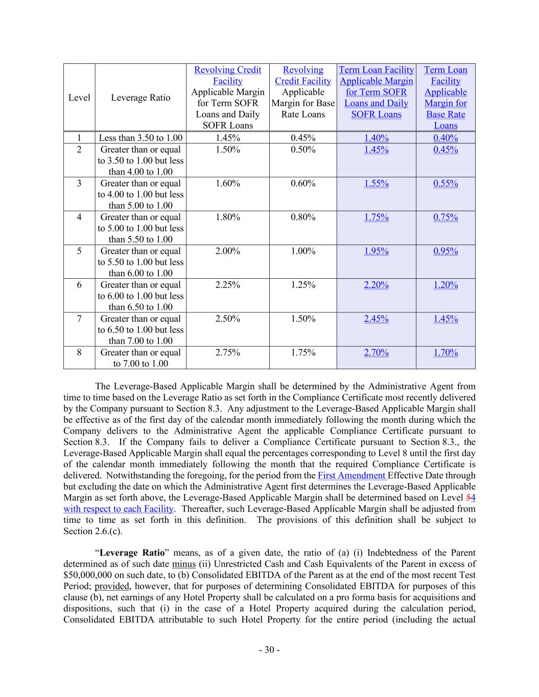 - 30 - Level Leverage Ratio Revolving Credit Facility Applicable Margin for Term SOFR Loans and Daily SOFR Loans Revolving Credit Facility Applicable Margin for Base Rate Loans Term Loan Facility Applicable Margin for Term SOFR Loans and Daily SOFR Loans Term Loan Facility Applicable Margin for Base Rate Loans 1 Less than 3.50 to 1.00 1.45% 0.45% 1.40% 0.40% 2 Greater than or equal to 3.50 to 1.00 but less than 4.00 to 1.00 1.50% 0.50% 1.45% 0.45% 3 Greater than or equal to 4.00 to 1.00 but less than 5.00 to 1.00 1.60% 0.60% 1.55% 0.55% 4 Greater than or equal to 5.00 to 1.00 but less than 5.50 to 1.00 1.80% 0.80% 1.75% 0.75% 5 Greater than or equal to 5.50 to 1.00 but less than 6.00 to 1.00 2.00% 1.00% 1.95% 0.95% 6 Greater than or equal to 6.00 to 1.00 but less than 6.50 to 1.00 2.25% 1.25% 2.20% 1.20% 7 Greater than or equal to 6.50 to 1.00 but less than 7.00 to 1.00 2.50% 1.50% 2.45% 1.45% 8 Greater than or equal to 7.00 to 1.00 2.75% 1.75% 2.70% 1.70% The Leverage-Based Applicable Margin shall be determined by the Administrative Agent from time to time based on the Leverage Ratio as set forth in the Compliance Certificate most recently delivered by the Company pursuant to Section 8.3. Any adjustment to the Leverage-Based Applicable Margin shall be effective as of the first day of the calendar month immediately following the month during which the Company delivers to the Administrative Agent the applicable Compliance Certificate pursuant to Section 8.3. If the Company fails to deliver a Compliance Certificate pursuant to Section 8.3., the Leverage-Based Applicable Margin shall equal the percentages corresponding to Level 8 until the first day of the calendar month immediately following the month that the required Compliance Certificate is delivered. Notwithstanding the foregoing, for the period from the First Amendment Effective Date through but excluding the date on which the Administrative Agent first determines the Leverage-Based Applicable Margin as set forth above, the Leverage-Based Applicable Margin shall be determined based on Level 54 with respect to each Facility. Thereafter, such Leverage-Based Applicable Margin shall be adjusted from time to time as set forth in this definition. The provisions of this definition shall be subject to Section 2.6.(c). “Leverage Ratio” means, as of a given date, the ratio of (a) (i) Indebtedness of the Parent determined as of such date minus (ii) Unrestricted Cash and Cash Equivalents of the Parent in excess of $50,000,000 on such date, to (b) Consolidated EBITDA of the Parent as at the end of the most recent Test Period; provided, however, that for purposes of determining Consolidated EBITDA for purposes of this clause (b), net earnings of any Hotel Property shall be calculated on a pro forma basis for acquisitions and dispositions, such that (i) in the case of a Hotel Property acquired during the calculation period, Consolidated EBITDA attributable to such Hotel Property for the entire period (including the actual