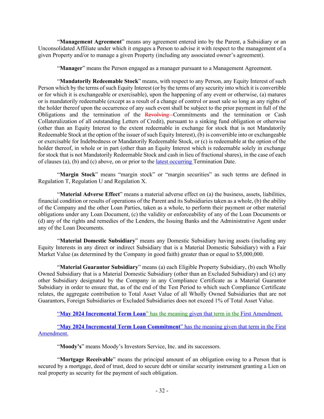 - 32 - “Management Agreement” means any agreement entered into by the Parent, a Subsidiary or an Unconsolidated Affiliate under which it engages a Person to advise it with respect to the management of a given Property and/or to manage a given Property (including any associated owner’s agreement). “Manager” means the Person engaged as a manager pursuant to a Management Agreement. “Mandatorily Redeemable Stock” means, with respect to any Person, any Equity Interest of such Person which by the terms of such Equity Interest (or by the terms of any security into which it is convertible or for which it is exchangeable or exercisable), upon the happening of any event or otherwise, (a) matures or is mandatorily redeemable (except as a result of a change of control or asset sale so long as any rights of the holder thereof upon the occurrence of any such event shall be subject to the prior payment in full of the Obligations and the termination of the Revolving Commitments and the termination or Cash Collateralization of all outstanding Letters of Credit), pursuant to a sinking fund obligation or otherwise (other than an Equity Interest to the extent redeemable in exchange for stock that is not Mandatorily Redeemable Stock at the option of the issuer of such Equity Interest), (b) is convertible into or exchangeable or exercisable for Indebtedness or Mandatorily Redeemable Stock, or (c) is redeemable at the option of the holder thereof, in whole or in part (other than an Equity Interest which is redeemable solely in exchange for stock that is not Mandatorily Redeemable Stock and cash in lieu of fractional shares), in the case of each of clauses (a), (b) and (c) above, on or prior to the latest occurring Termination Date. “Margin Stock” means “margin stock” or “margin securities” as such terms are defined in Regulation T, Regulation U and Regulation X. “Material Adverse Effect” means a material adverse effect on (a) the business, assets, liabilities, financial condition or results of operations of the Parent and its Subsidiaries taken as a whole, (b) the ability of the Company and the other Loan Parties, taken as a whole, to perform their payment or other material obligations under any Loan Document, (c) the validity or enforceability of any of the Loan Documents or (d) any of the rights and remedies of the Lenders, the Issuing Banks and the Administrative Agent under any of the Loan Documents. “Material Domestic Subsidiary” means any Domestic Subsidiary having assets (including any Equity Interests in any direct or indirect Subsidiary that is a Material Domestic Subsidiary) with a Fair Market Value (as determined by the Company in good faith) greater than or equal to $5,000,000. “Material Guarantor Subsidiary” means (a) each Eligible Property Subsidiary, (b) each Wholly Owned Subsidiary that is a Material Domestic Subsidiary (other than an Excluded Subsidiary) and (c) any other Subsidiary designated by the Company in any Compliance Certificate as a Material Guarantor Subsidiary in order to ensure that, as of the end of the Test Period to which such Compliance Certificate relates, the aggregate contribution to Total Asset Value of all Wholly Owned Subsidiaries that are not Guarantors, Foreign Subsidiaries or Excluded Subsidiaries does not exceed 1% of Total Asset Value. “May 2024 Incremental Term Loan” has the meaning given that term in the First Amendment. “May 2024 Incremental Term Loan Commitment” has the meaning given that term in the First Amendment. “Moody’s” means Moody’s Investors Service, Inc. and its successors. “Mortgage Receivable” means the principal amount of an obligation owing to a Person that is secured by a mortgage, deed of trust, deed to secure debt or similar security instrument granting a Lien on real property as security for the payment of such obligation.