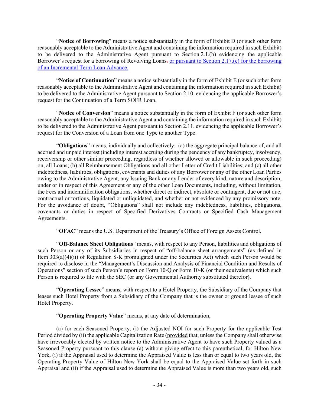 - 34 - “Notice of Borrowing” means a notice substantially in the form of Exhibit D (or such other form reasonably acceptable to the Administrative Agent and containing the information required in such Exhibit) to be delivered to the Administrative Agent pursuant to Section 2.1.(b) evidencing the applicable Borrower’s request for a borrowing of Revolving Loans. or pursuant to Section 2.17.(c) for the borrowing of an Incremental Term Loan Advance. “Notice of Continuation” means a notice substantially in the form of Exhibit E (or such other form reasonably acceptable to the Administrative Agent and containing the information required in such Exhibit) to be delivered to the Administrative Agent pursuant to Section 2.10. evidencing the applicable Borrower’s request for the Continuation of a Term SOFR Loan. “Notice of Conversion” means a notice substantially in the form of Exhibit F (or such other form reasonably acceptable to the Administrative Agent and containing the information required in such Exhibit) to be delivered to the Administrative Agent pursuant to Section 2.11. evidencing the applicable Borrower’s request for the Conversion of a Loan from one Type to another Type. “Obligations” means, individually and collectively: (a) the aggregate principal balance of, and all accrued and unpaid interest (including interest accruing during the pendency of any bankruptcy, insolvency, receivership or other similar proceeding, regardless of whether allowed or allowable in such proceeding) on, all Loans; (b) all Reimbursement Obligations and all other Letter of Credit Liabilities; and (c) all other indebtedness, liabilities, obligations, covenants and duties of any Borrower or any of the other Loan Parties owing to the Administrative Agent, any Issuing Bank or any Lender of every kind, nature and description, under or in respect of this Agreement or any of the other Loan Documents, including, without limitation, the Fees and indemnification obligations, whether direct or indirect, absolute or contingent, due or not due, contractual or tortious, liquidated or unliquidated, and whether or not evidenced by any promissory note. For the avoidance of doubt, “Obligations” shall not include any indebtedness, liabilities, obligations, covenants or duties in respect of Specified Derivatives Contracts or Specified Cash Management Agreements. “OFAC” means the U.S. Department of the Treasury’s Office of Foreign Assets Control. “Off-Balance Sheet Obligations” means, with respect to any Person, liabilities and obligations of such Person or any of its Subsidiaries in respect of “off-balance sheet arrangements” (as defined in Item 303(a)(4)(ii) of Regulation S-K promulgated under the Securities Act) which such Person would be required to disclose in the “Management’s Discussion and Analysis of Financial Condition and Results of Operations” section of such Person’s report on Form 10-Q or Form 10-K (or their equivalents) which such Person is required to file with the SEC (or any Governmental Authority substituted therefor). “Operating Lessee” means, with respect to a Hotel Property, the Subsidiary of the Company that leases such Hotel Property from a Subsidiary of the Company that is the owner or ground lessee of such Hotel Property. “Operating Property Value” means, at any date of determination, (a) for each Seasoned Property, (i) the Adjusted NOI for such Property for the applicable Test Period divided by (ii) the applicable Capitalization Rate (provided that, unless the Company shall otherwise have irrevocably elected by written notice to the Administrative Agent to have such Property valued as a Seasoned Property pursuant to this clause (a) without giving effect to this parenthetical, for Hilton New York, (i) if the Appraisal used to determine the Appraised Value is less than or equal to two years old, the Operating Property Value of Hilton New York shall be equal to the Appraised Value set forth in such Appraisal and (ii) if the Appraisal used to determine the Appraised Value is more than two years old, such