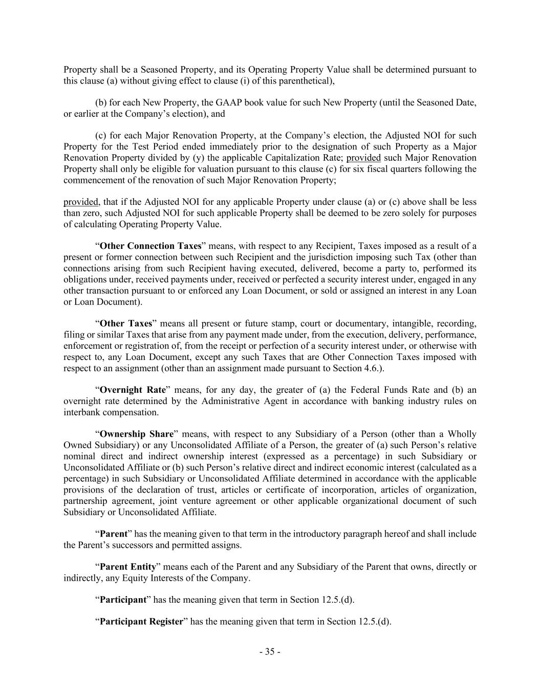 - 35 - Property shall be a Seasoned Property, and its Operating Property Value shall be determined pursuant to this clause (a) without giving effect to clause (i) of this parenthetical), (b) for each New Property, the GAAP book value for such New Property (until the Seasoned Date, or earlier at the Company’s election), and (c) for each Major Renovation Property, at the Company’s election, the Adjusted NOI for such Property for the Test Period ended immediately prior to the designation of such Property as a Major Renovation Property divided by (y) the applicable Capitalization Rate; provided such Major Renovation Property shall only be eligible for valuation pursuant to this clause (c) for six fiscal quarters following the commencement of the renovation of such Major Renovation Property; provided, that if the Adjusted NOI for any applicable Property under clause (a) or (c) above shall be less than zero, such Adjusted NOI for such applicable Property shall be deemed to be zero solely for purposes of calculating Operating Property Value. “Other Connection Taxes” means, with respect to any Recipient, Taxes imposed as a result of a present or former connection between such Recipient and the jurisdiction imposing such Tax (other than connections arising from such Recipient having executed, delivered, become a party to, performed its obligations under, received payments under, received or perfected a security interest under, engaged in any other transaction pursuant to or enforced any Loan Document, or sold or assigned an interest in any Loan or Loan Document). “Other Taxes” means all present or future stamp, court or documentary, intangible, recording, filing or similar Taxes that arise from any payment made under, from the execution, delivery, performance, enforcement or registration of, from the receipt or perfection of a security interest under, or otherwise with respect to, any Loan Document, except any such Taxes that are Other Connection Taxes imposed with respect to an assignment (other than an assignment made pursuant to Section 4.6.). “Overnight Rate” means, for any day, the greater of (a) the Federal Funds Rate and (b) an overnight rate determined by the Administrative Agent in accordance with banking industry rules on interbank compensation. “Ownership Share” means, with respect to any Subsidiary of a Person (other than a Wholly Owned Subsidiary) or any Unconsolidated Affiliate of a Person, the greater of (a) such Person’s relative nominal direct and indirect ownership interest (expressed as a percentage) in such Subsidiary or Unconsolidated Affiliate or (b) such Person’s relative direct and indirect economic interest (calculated as a percentage) in such Subsidiary or Unconsolidated Affiliate determined in accordance with the applicable provisions of the declaration of trust, articles or certificate of incorporation, articles of organization, partnership agreement, joint venture agreement or other applicable organizational document of such Subsidiary or Unconsolidated Affiliate. “Parent” has the meaning given to that term in the introductory paragraph hereof and shall include the Parent’s successors and permitted assigns. “Parent Entity” means each of the Parent and any Subsidiary of the Parent that owns, directly or indirectly, any Equity Interests of the Company. “Participant” has the meaning given that term in Section 12.5.(d). “Participant Register” has the meaning given that term in Section 12.5.(d).