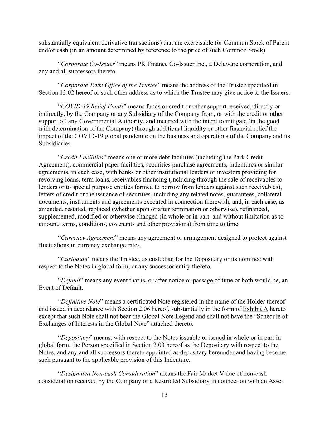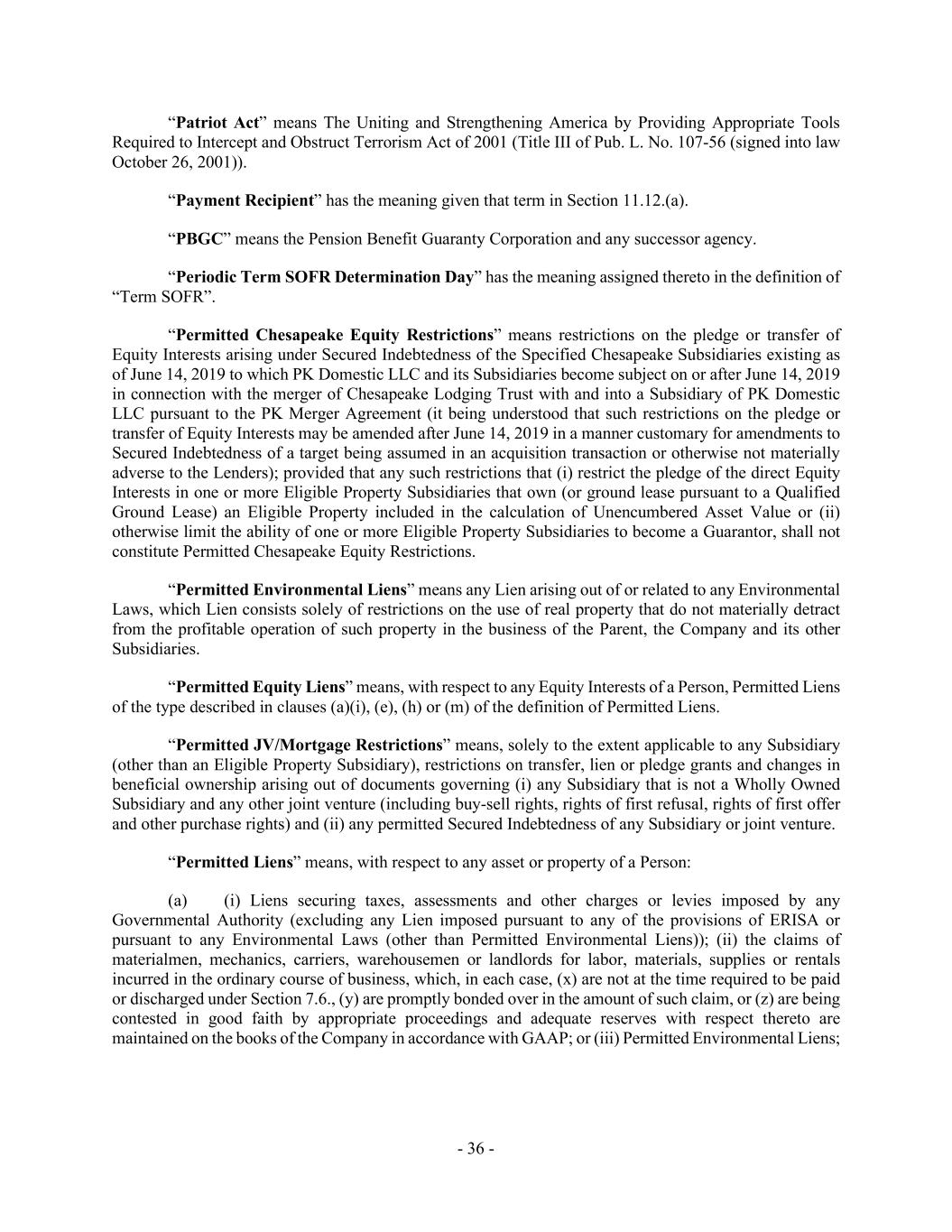 - 36 - “Patriot Act” means The Uniting and Strengthening America by Providing Appropriate Tools Required to Intercept and Obstruct Terrorism Act of 2001 (Title III of Pub. L. No. 107-56 (signed into law October 26, 2001)). “Payment Recipient” has the meaning given that term in Section 11.12.(a). “PBGC” means the Pension Benefit Guaranty Corporation and any successor agency. “Periodic Term SOFR Determination Day” has the meaning assigned thereto in the definition of “Term SOFR”. “Permitted Chesapeake Equity Restrictions” means restrictions on the pledge or transfer of Equity Interests arising under Secured Indebtedness of the Specified Chesapeake Subsidiaries existing as of June 14, 2019 to which PK Domestic LLC and its Subsidiaries become subject on or after June 14, 2019 in connection with the merger of Chesapeake Lodging Trust with and into a Subsidiary of PK Domestic LLC pursuant to the PK Merger Agreement (it being understood that such restrictions on the pledge or transfer of Equity Interests may be amended after June 14, 2019 in a manner customary for amendments to Secured Indebtedness of a target being assumed in an acquisition transaction or otherwise not materially adverse to the Lenders); provided that any such restrictions that (i) restrict the pledge of the direct Equity Interests in one or more Eligible Property Subsidiaries that own (or ground lease pursuant to a Qualified Ground Lease) an Eligible Property included in the calculation of Unencumbered Asset Value or (ii) otherwise limit the ability of one or more Eligible Property Subsidiaries to become a Guarantor, shall not constitute Permitted Chesapeake Equity Restrictions. “Permitted Environmental Liens” means any Lien arising out of or related to any Environmental Laws, which Lien consists solely of restrictions on the use of real property that do not materially detract from the profitable operation of such property in the business of the Parent, the Company and its other Subsidiaries. “Permitted Equity Liens” means, with respect to any Equity Interests of a Person, Permitted Liens of the type described in clauses (a)(i), (e), (h) or (m) of the definition of Permitted Liens. “Permitted JV/Mortgage Restrictions” means, solely to the extent applicable to any Subsidiary (other than an Eligible Property Subsidiary), restrictions on transfer, lien or pledge grants and changes in beneficial ownership arising out of documents governing (i) any Subsidiary that is not a Wholly Owned Subsidiary and any other joint venture (including buy-sell rights, rights of first refusal, rights of first offer and other purchase rights) and (ii) any permitted Secured Indebtedness of any Subsidiary or joint venture. “Permitted Liens” means, with respect to any asset or property of a Person: (a) (i) Liens securing taxes, assessments and other charges or levies imposed by any Governmental Authority (excluding any Lien imposed pursuant to any of the provisions of ERISA or pursuant to any Environmental Laws (other than Permitted Environmental Liens)); (ii) the claims of materialmen, mechanics, carriers, warehousemen or landlords for labor, materials, supplies or rentals incurred in the ordinary course of business, which, in each case, (x) are not at the time required to be paid or discharged under Section 7.6., (y) are promptly bonded over in the amount of such claim, or (z) are being contested in good faith by appropriate proceedings and adequate reserves with respect thereto are maintained on the books of the Company in accordance with GAAP; or (iii) Permitted Environmental Liens;