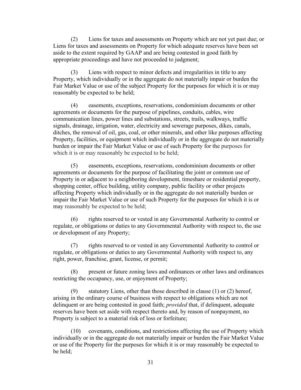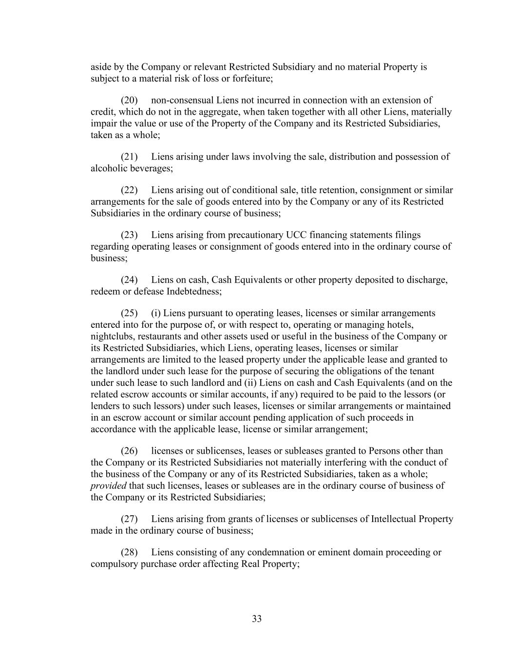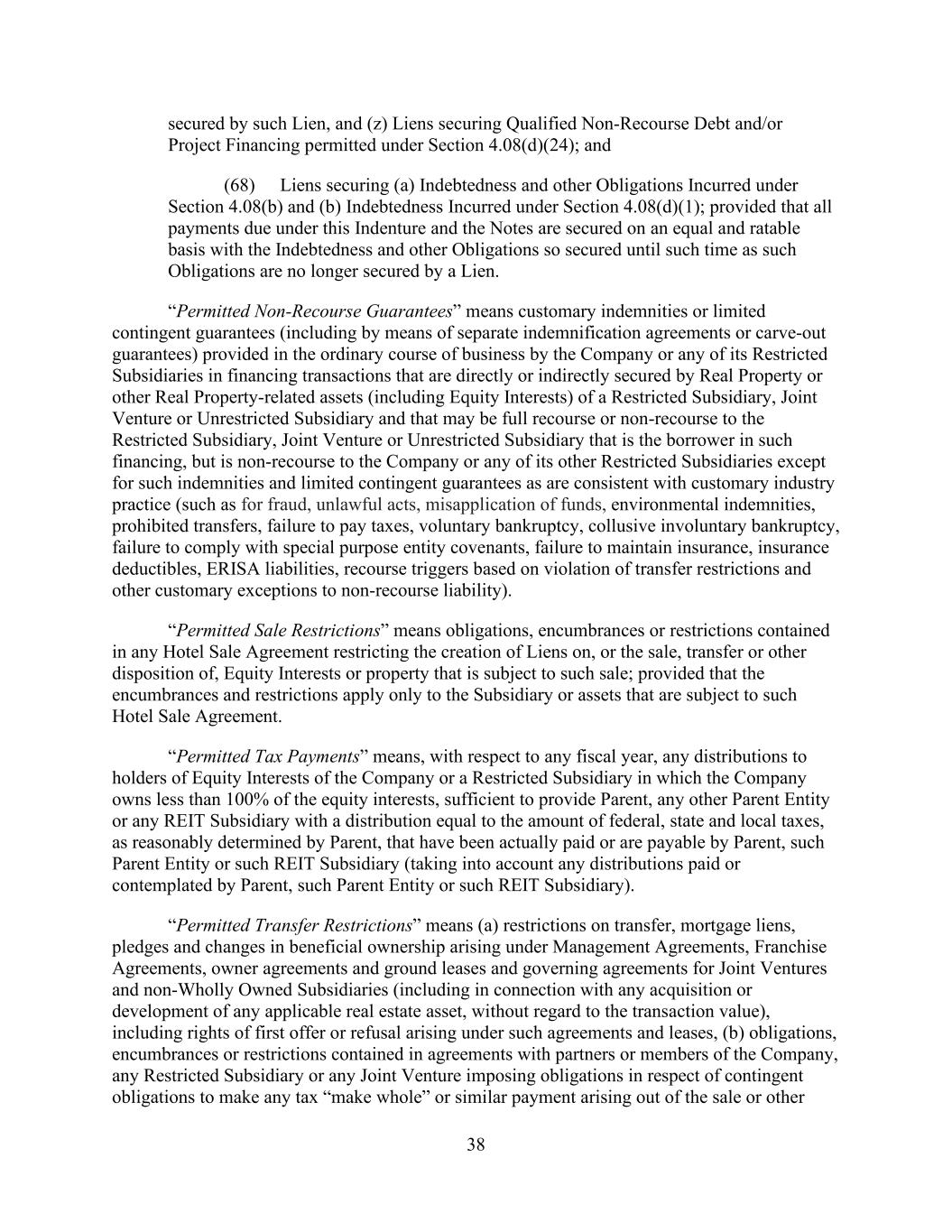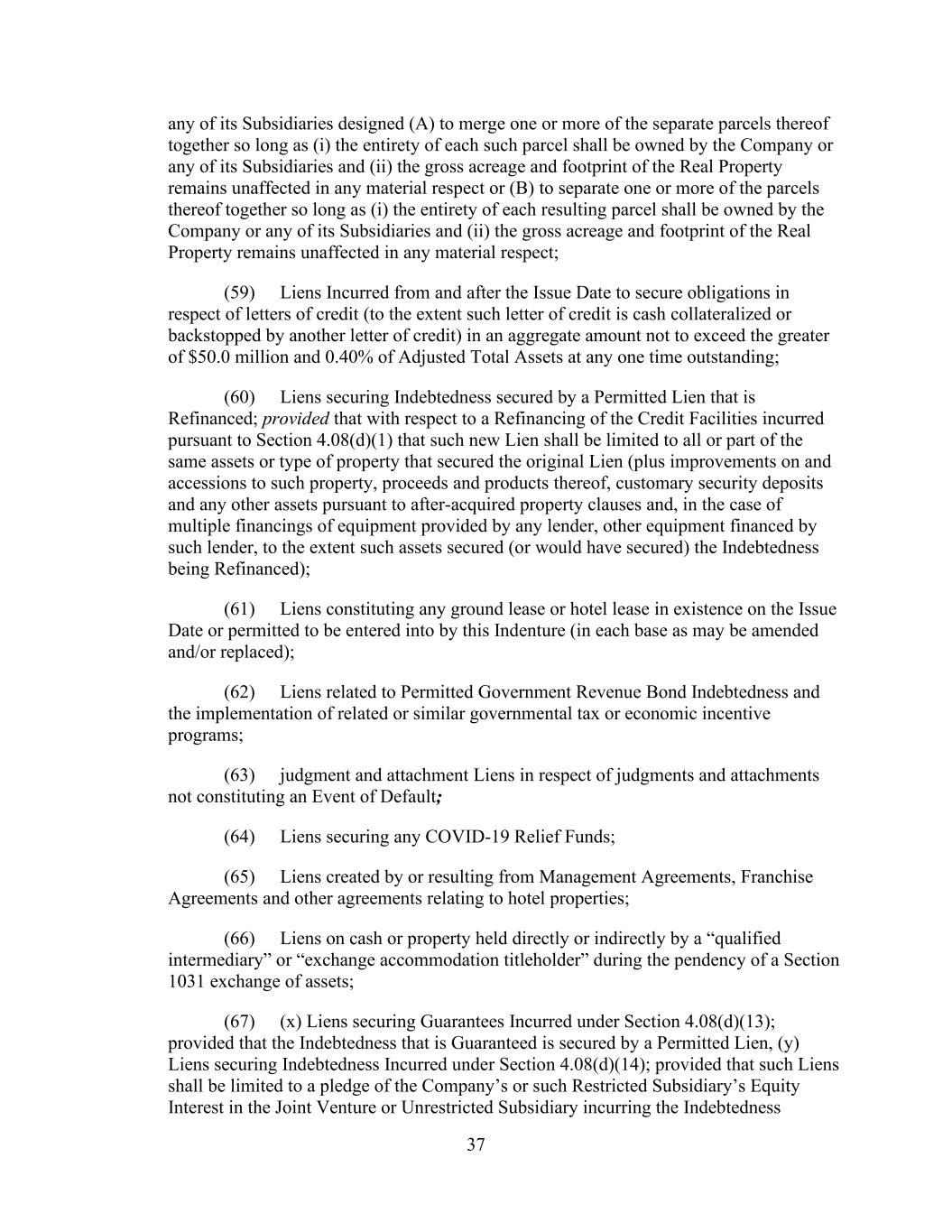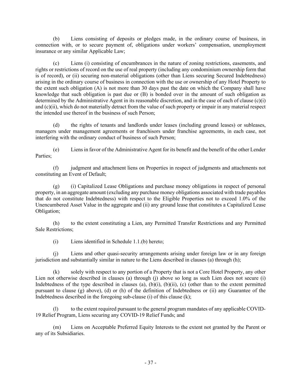 - 37 - (b) Liens consisting of deposits or pledges made, in the ordinary course of business, in connection with, or to secure payment of, obligations under workers’ compensation, unemployment insurance or any similar Applicable Law; (c) Liens (i) consisting of encumbrances in the nature of zoning restrictions, easements, and rights or restrictions of record on the use of real property (including any condominium ownership form that is of record), or (ii) securing non-material obligations (other than Liens securing Secured Indebtedness) arising in the ordinary course of business in connection with the use or ownership of any Hotel Property to the extent such obligation (A) is not more than 30 days past the date on which the Company shall have knowledge that such obligation is past due or (B) is bonded over in the amount of such obligation as determined by the Administrative Agent in its reasonable discretion, and in the case of each of clause (c)(i) and (c)(ii), which do not materially detract from the value of such property or impair in any material respect the intended use thereof in the business of such Person; (d) the rights of tenants and landlords under leases (including ground leases) or subleases, managers under management agreements or franchisors under franchise agreements, in each case, not interfering with the ordinary conduct of business of such Person; (e) Liens in favor of the Administrative Agent for its benefit and the benefit of the other Lender Parties; (f) judgment and attachment liens on Properties in respect of judgments and attachments not constituting an Event of Default; (g) (i) Capitalized Lease Obligations and purchase money obligations in respect of personal property, in an aggregate amount (excluding any purchase money obligations associated with trade payables that do not constitute Indebtedness) with respect to the Eligible Properties not to exceed 1.0% of the Unencumbered Asset Value in the aggregate and (ii) any ground lease that constitutes a Capitalized Lease Obligation; (h) to the extent constituting a Lien, any Permitted Transfer Restrictions and any Permitted Sale Restrictions; (i) Liens identified in Schedule 1.1.(b) hereto; (j) Liens and other quasi-security arrangements arising under foreign law or in any foreign jurisdiction and substantially similar in nature to the Liens described in clauses (a) through (h); (k) solely with respect to any portion of a Property that is not a Core Hotel Property, any other Lien not otherwise described in clauses (a) through (j) above so long as such Lien does not secure (i) Indebtedness of the type described in clauses (a), (b)(i), (b)(ii), (c) (other than to the extent permitted pursuant to clause (g) above), (d) or (h) of the definition of Indebtedness or (ii) any Guarantee of the Indebtedness described in the foregoing sub-clause (i) of this clause (k); (l) to the extent required pursuant to the general program mandates of any applicable COVID- 19 Relief Program, Liens securing any COVID-19 Relief Funds; and (m) Liens on Acceptable Preferred Equity Interests to the extent not granted by the Parent or any of its Subsidiaries.