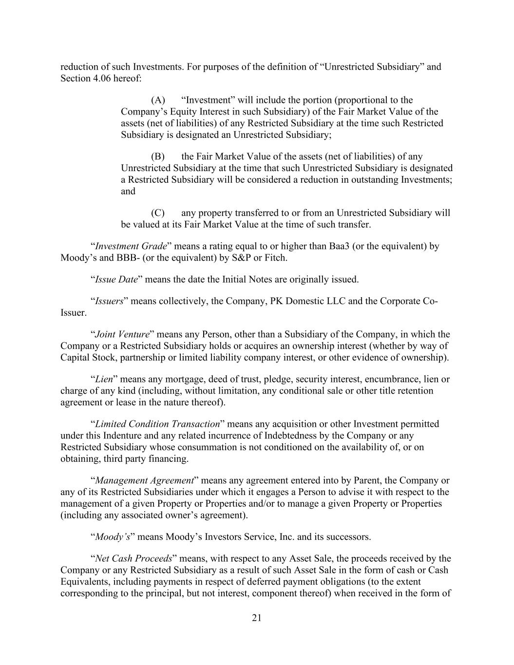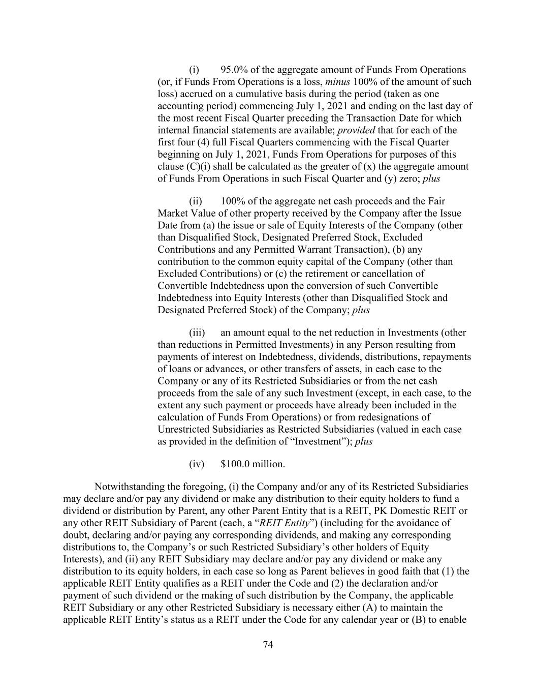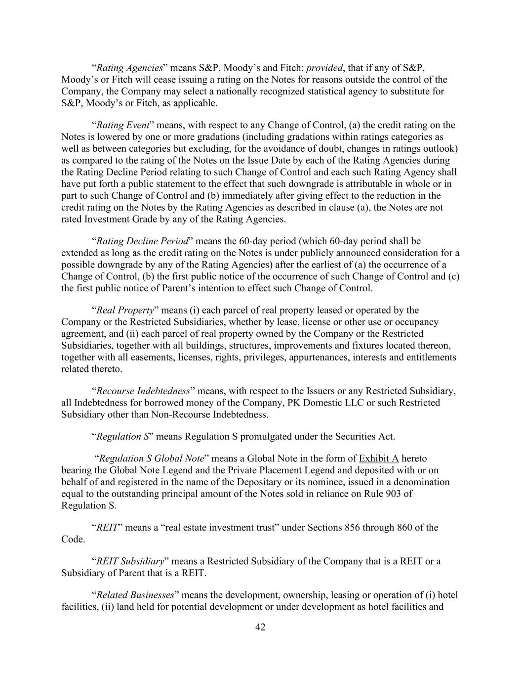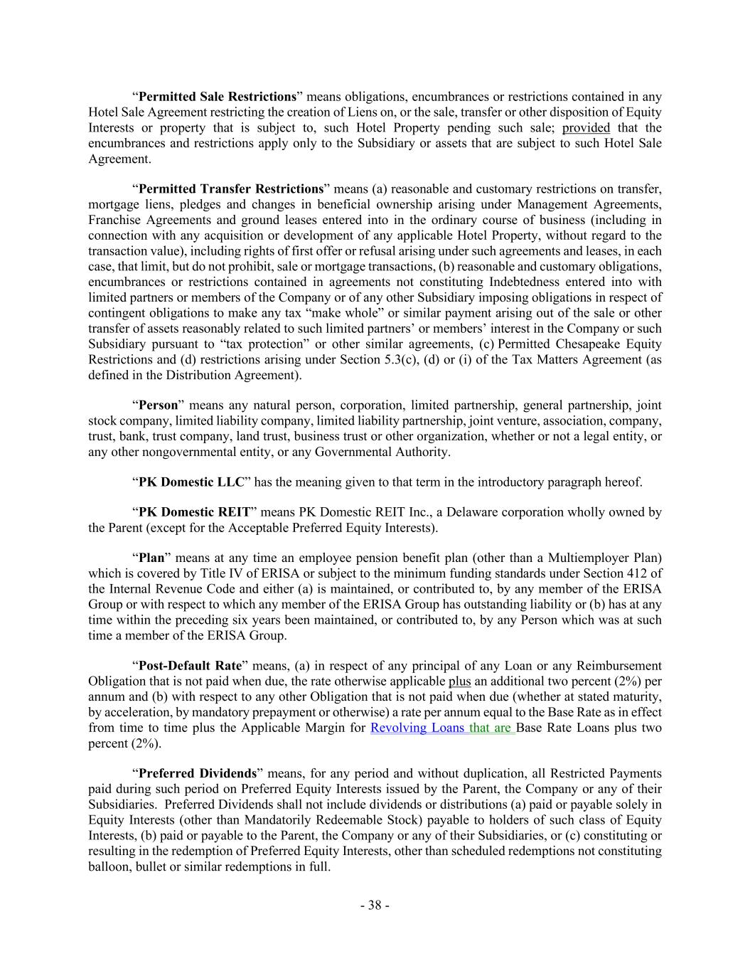 - 38 - “Permitted Sale Restrictions” means obligations, encumbrances or restrictions contained in any Hotel Sale Agreement restricting the creation of Liens on, or the sale, transfer or other disposition of Equity Interests or property that is subject to, such Hotel Property pending such sale; provided that the encumbrances and restrictions apply only to the Subsidiary or assets that are subject to such Hotel Sale Agreement. “Permitted Transfer Restrictions” means (a) reasonable and customary restrictions on transfer, mortgage liens, pledges and changes in beneficial ownership arising under Management Agreements, Franchise Agreements and ground leases entered into in the ordinary course of business (including in connection with any acquisition or development of any applicable Hotel Property, without regard to the transaction value), including rights of first offer or refusal arising under such agreements and leases, in each case, that limit, but do not prohibit, sale or mortgage transactions, (b) reasonable and customary obligations, encumbrances or restrictions contained in agreements not constituting Indebtedness entered into with limited partners or members of the Company or of any other Subsidiary imposing obligations in respect of contingent obligations to make any tax “make whole” or similar payment arising out of the sale or other transfer of assets reasonably related to such limited partners’ or members’ interest in the Company or such Subsidiary pursuant to “tax protection” or other similar agreements, (c) Permitted Chesapeake Equity Restrictions and (d) restrictions arising under Section 5.3(c), (d) or (i) of the Tax Matters Agreement (as defined in the Distribution Agreement). “Person” means any natural person, corporation, limited partnership, general partnership, joint stock company, limited liability company, limited liability partnership, joint venture, association, company, trust, bank, trust company, land trust, business trust or other organization, whether or not a legal entity, or any other nongovernmental entity, or any Governmental Authority. “PK Domestic LLC” has the meaning given to that term in the introductory paragraph hereof. “PK Domestic REIT” means PK Domestic REIT Inc., a Delaware corporation wholly owned by the Parent (except for the Acceptable Preferred Equity Interests). “Plan” means at any time an employee pension benefit plan (other than a Multiemployer Plan) which is covered by Title IV of ERISA or subject to the minimum funding standards under Section 412 of the Internal Revenue Code and either (a) is maintained, or contributed to, by any member of the ERISA Group or with respect to which any member of the ERISA Group has outstanding liability or (b) has at any time within the preceding six years been maintained, or contributed to, by any Person which was at such time a member of the ERISA Group. “Post-Default Rate” means, (a) in respect of any principal of any Loan or any Reimbursement Obligation that is not paid when due, the rate otherwise applicable plus an additional two percent (2%) per annum and (b) with respect to any other Obligation that is not paid when due (whether at stated maturity, by acceleration, by mandatory prepayment or otherwise) a rate per annum equal to the Base Rate as in effect from time to time plus the Applicable Margin for Revolving Loans that are Base Rate Loans plus two percent (2%). “Preferred Dividends” means, for any period and without duplication, all Restricted Payments paid during such period on Preferred Equity Interests issued by the Parent, the Company or any of their Subsidiaries. Preferred Dividends shall not include dividends or distributions (a) paid or payable solely in Equity Interests (other than Mandatorily Redeemable Stock) payable to holders of such class of Equity Interests, (b) paid or payable to the Parent, the Company or any of their Subsidiaries, or (c) constituting or resulting in the redemption of Preferred Equity Interests, other than scheduled redemptions not constituting balloon, bullet or similar redemptions in full.