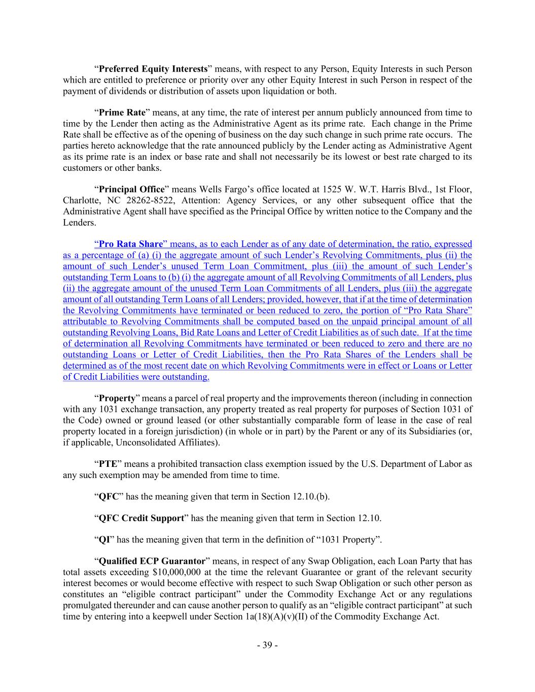 - 39 - “Preferred Equity Interests” means, with respect to any Person, Equity Interests in such Person which are entitled to preference or priority over any other Equity Interest in such Person in respect of the payment of dividends or distribution of assets upon liquidation or both. “Prime Rate” means, at any time, the rate of interest per annum publicly announced from time to time by the Lender then acting as the Administrative Agent as its prime rate. Each change in the Prime Rate shall be effective as of the opening of business on the day such change in such prime rate occurs. The parties hereto acknowledge that the rate announced publicly by the Lender acting as Administrative Agent as its prime rate is an index or base rate and shall not necessarily be its lowest or best rate charged to its customers or other banks. “Principal Office” means Wells Fargo’s office located at 1525 W. W.T. Harris Blvd., 1st Floor, Charlotte, NC 28262-8522, Attention: Agency Services, or any other subsequent office that the Administrative Agent shall have specified as the Principal Office by written notice to the Company and the Lenders. “Pro Rata Share” means, as to each Lender as of any date of determination, the ratio, expressed as a percentage of (a) (i) the aggregate amount of such Lender’s Revolving Commitments, plus (ii) the amount of such Lender’s unused Term Loan Commitment, plus (iii) the amount of such Lender’s outstanding Term Loans to (b) (i) the aggregate amount of all Revolving Commitments of all Lenders, plus (ii) the aggregate amount of the unused Term Loan Commitments of all Lenders, plus (iii) the aggregate amount of all outstanding Term Loans of all Lenders; provided, however, that if at the time of determination the Revolving Commitments have terminated or been reduced to zero, the portion of “Pro Rata Share” attributable to Revolving Commitments shall be computed based on the unpaid principal amount of all outstanding Revolving Loans, Bid Rate Loans and Letter of Credit Liabilities as of such date. If at the time of determination all Revolving Commitments have terminated or been reduced to zero and there are no outstanding Loans or Letter of Credit Liabilities, then the Pro Rata Shares of the Lenders shall be determined as of the most recent date on which Revolving Commitments were in effect or Loans or Letter of Credit Liabilities were outstanding. “Property” means a parcel of real property and the improvements thereon (including in connection with any 1031 exchange transaction, any property treated as real property for purposes of Section 1031 of the Code) owned or ground leased (or other substantially comparable form of lease in the case of real property located in a foreign jurisdiction) (in whole or in part) by the Parent or any of its Subsidiaries (or, if applicable, Unconsolidated Affiliates). “PTE” means a prohibited transaction class exemption issued by the U.S. Department of Labor as any such exemption may be amended from time to time. “QFC” has the meaning given that term in Section 12.10.(b). “QFC Credit Support” has the meaning given that term in Section 12.10. “QI” has the meaning given that term in the definition of “1031 Property”. “Qualified ECP Guarantor” means, in respect of any Swap Obligation, each Loan Party that has total assets exceeding $10,000,000 at the time the relevant Guarantee or grant of the relevant security interest becomes or would become effective with respect to such Swap Obligation or such other person as constitutes an “eligible contract participant” under the Commodity Exchange Act or any regulations promulgated thereunder and can cause another person to qualify as an “eligible contract participant” at such time by entering into a keepwell under Section 1a(18)(A)(v)(II) of the Commodity Exchange Act.