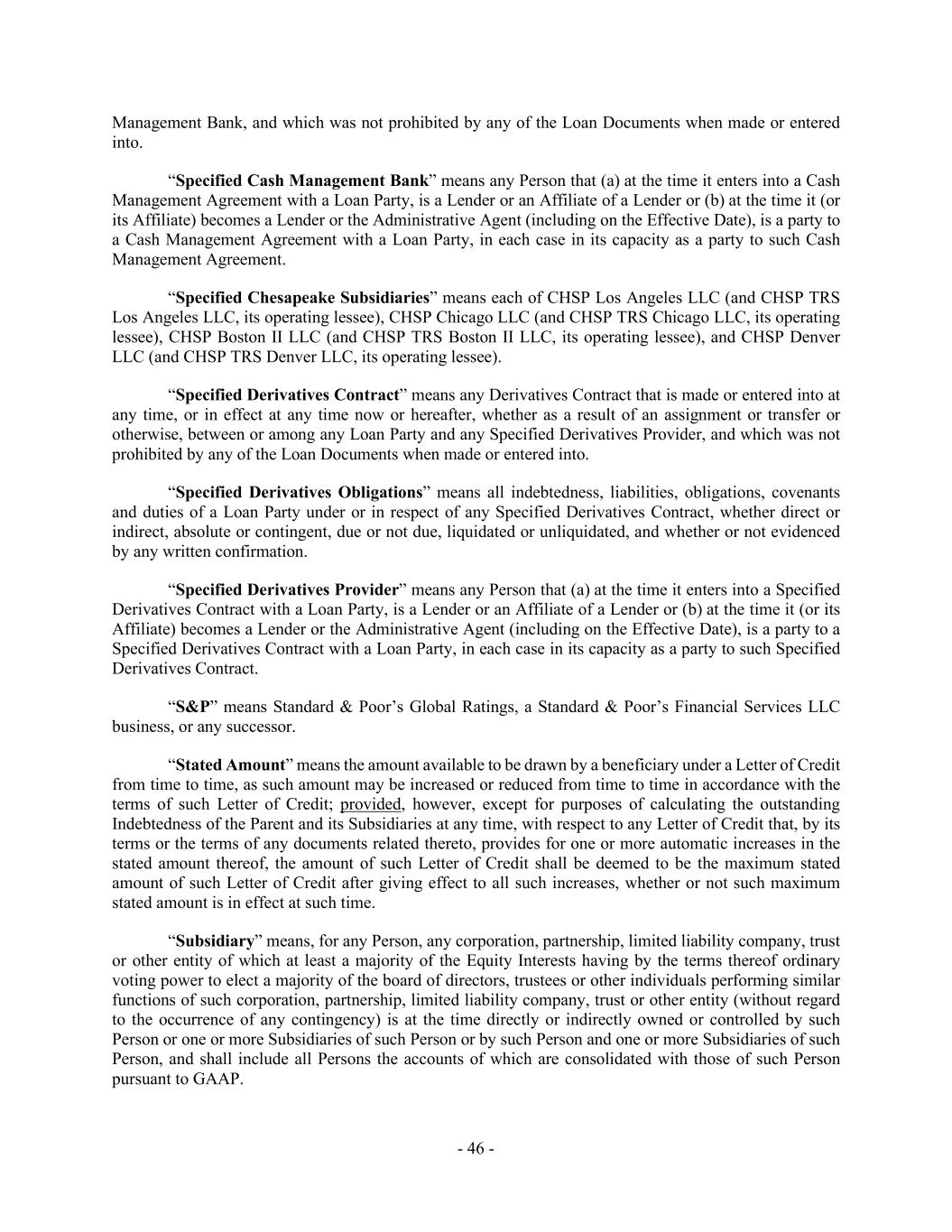 - 46 - Management Bank, and which was not prohibited by any of the Loan Documents when made or entered into. “Specified Cash Management Bank” means any Person that (a) at the time it enters into a Cash Management Agreement with a Loan Party, is a Lender or an Affiliate of a Lender or (b) at the time it (or its Affiliate) becomes a Lender or the Administrative Agent (including on the Effective Date), is a party to a Cash Management Agreement with a Loan Party, in each case in its capacity as a party to such Cash Management Agreement. “Specified Chesapeake Subsidiaries” means each of CHSP Los Angeles LLC (and CHSP TRS Los Angeles LLC, its operating lessee), CHSP Chicago LLC (and CHSP TRS Chicago LLC, its operating lessee), CHSP Boston II LLC (and CHSP TRS Boston II LLC, its operating lessee), and CHSP Denver LLC (and CHSP TRS Denver LLC, its operating lessee). “Specified Derivatives Contract” means any Derivatives Contract that is made or entered into at any time, or in effect at any time now or hereafter, whether as a result of an assignment or transfer or otherwise, between or among any Loan Party and any Specified Derivatives Provider, and which was not prohibited by any of the Loan Documents when made or entered into. “Specified Derivatives Obligations” means all indebtedness, liabilities, obligations, covenants and duties of a Loan Party under or in respect of any Specified Derivatives Contract, whether direct or indirect, absolute or contingent, due or not due, liquidated or unliquidated, and whether or not evidenced by any written confirmation. “Specified Derivatives Provider” means any Person that (a) at the time it enters into a Specified Derivatives Contract with a Loan Party, is a Lender or an Affiliate of a Lender or (b) at the time it (or its Affiliate) becomes a Lender or the Administrative Agent (including on the Effective Date), is a party to a Specified Derivatives Contract with a Loan Party, in each case in its capacity as a party to such Specified Derivatives Contract. “S&P” means Standard & Poor’s Global Ratings, a Standard & Poor’s Financial Services LLC business, or any successor. “Stated Amount” means the amount available to be drawn by a beneficiary under a Letter of Credit from time to time, as such amount may be increased or reduced from time to time in accordance with the terms of such Letter of Credit; provided, however, except for purposes of calculating the outstanding Indebtedness of the Parent and its Subsidiaries at any time, with respect to any Letter of Credit that, by its terms or the terms of any documents related thereto, provides for one or more automatic increases in the stated amount thereof, the amount of such Letter of Credit shall be deemed to be the maximum stated amount of such Letter of Credit after giving effect to all such increases, whether or not such maximum stated amount is in effect at such time. “Subsidiary” means, for any Person, any corporation, partnership, limited liability company, trust or other entity of which at least a majority of the Equity Interests having by the terms thereof ordinary voting power to elect a majority of the board of directors, trustees or other individuals performing similar functions of such corporation, partnership, limited liability company, trust or other entity (without regard to the occurrence of any contingency) is at the time directly or indirectly owned or controlled by such Person or one or more Subsidiaries of such Person or by such Person and one or more Subsidiaries of such Person, and shall include all Persons the accounts of which are consolidated with those of such Person pursuant to GAAP.