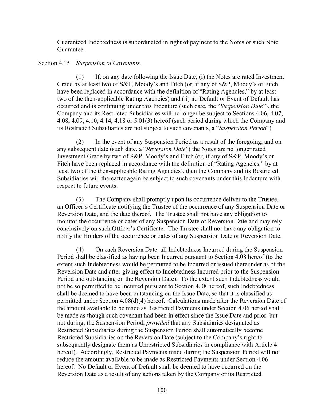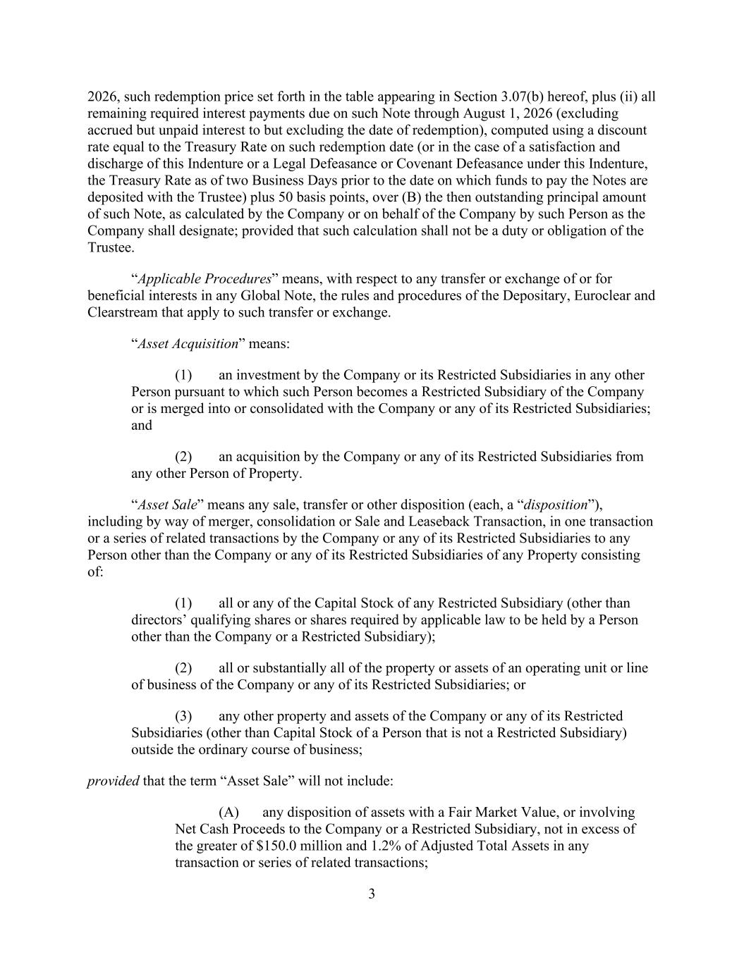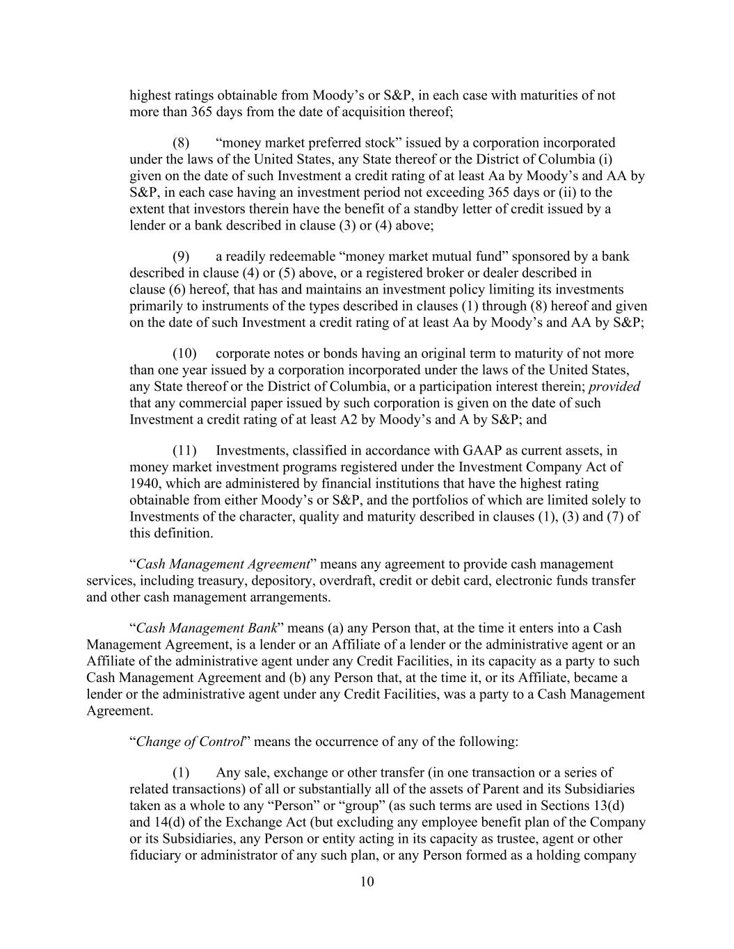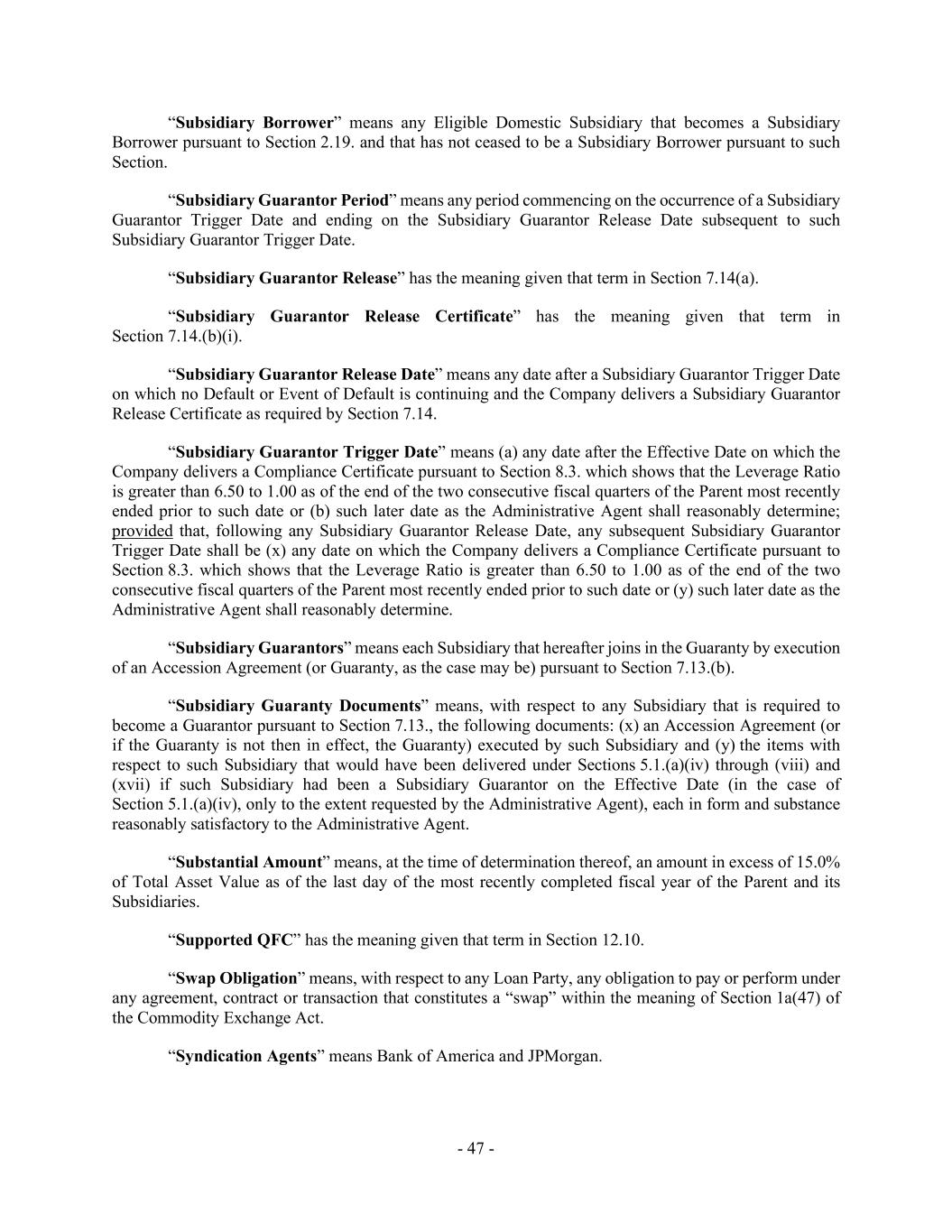 - 47 - “Subsidiary Borrower” means any Eligible Domestic Subsidiary that becomes a Subsidiary Borrower pursuant to Section 2.19. and that has not ceased to be a Subsidiary Borrower pursuant to such Section. “Subsidiary Guarantor Period” means any period commencing on the occurrence of a Subsidiary Guarantor Trigger Date and ending on the Subsidiary Guarantor Release Date subsequent to such Subsidiary Guarantor Trigger Date. “Subsidiary Guarantor Release” has the meaning given that term in Section 7.14(a). “Subsidiary Guarantor Release Certificate” has the meaning given that term in Section 7.14.(b)(i). “Subsidiary Guarantor Release Date” means any date after a Subsidiary Guarantor Trigger Date on which no Default or Event of Default is continuing and the Company delivers a Subsidiary Guarantor Release Certificate as required by Section 7.14. “Subsidiary Guarantor Trigger Date” means (a) any date after the Effective Date on which the Company delivers a Compliance Certificate pursuant to Section 8.3. which shows that the Leverage Ratio is greater than 6.50 to 1.00 as of the end of the two consecutive fiscal quarters of the Parent most recently ended prior to such date or (b) such later date as the Administrative Agent shall reasonably determine; provided that, following any Subsidiary Guarantor Release Date, any subsequent Subsidiary Guarantor Trigger Date shall be (x) any date on which the Company delivers a Compliance Certificate pursuant to Section 8.3. which shows that the Leverage Ratio is greater than 6.50 to 1.00 as of the end of the two consecutive fiscal quarters of the Parent most recently ended prior to such date or (y) such later date as the Administrative Agent shall reasonably determine. “Subsidiary Guarantors” means each Subsidiary that hereafter joins in the Guaranty by execution of an Accession Agreement (or Guaranty, as the case may be) pursuant to Section 7.13.(b). “Subsidiary Guaranty Documents” means, with respect to any Subsidiary that is required to become a Guarantor pursuant to Section 7.13., the following documents: (x) an Accession Agreement (or if the Guaranty is not then in effect, the Guaranty) executed by such Subsidiary and (y) the items with respect to such Subsidiary that would have been delivered under Sections 5.1.(a)(iv) through (viii) and (xvii) if such Subsidiary had been a Subsidiary Guarantor on the Effective Date (in the case of Section 5.1.(a)(iv), only to the extent requested by the Administrative Agent), each in form and substance reasonably satisfactory to the Administrative Agent. “Substantial Amount” means, at the time of determination thereof, an amount in excess of 15.0% of Total Asset Value as of the last day of the most recently completed fiscal year of the Parent and its Subsidiaries. “Supported QFC” has the meaning given that term in Section 12.10. “Swap Obligation” means, with respect to any Loan Party, any obligation to pay or perform under any agreement, contract or transaction that constitutes a “swap” within the meaning of Section 1a(47) of the Commodity Exchange Act. “Syndication Agents” means Bank of America and JPMorgan.