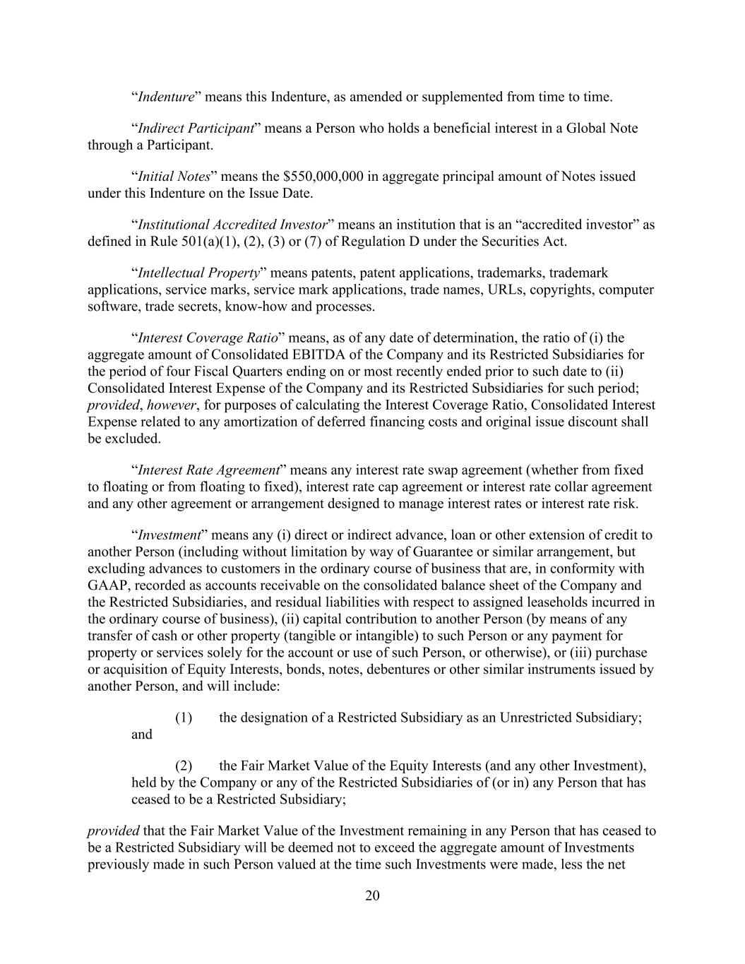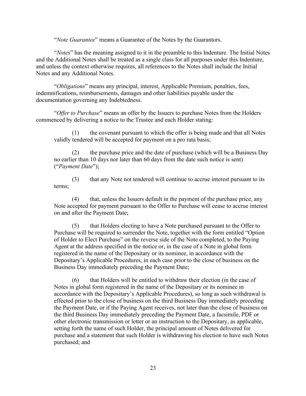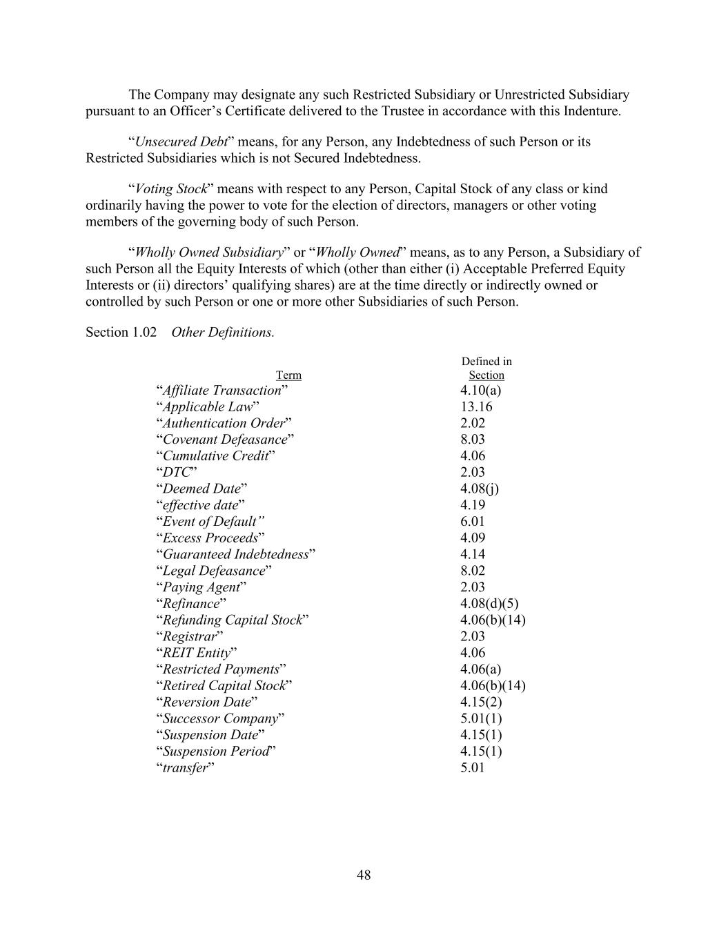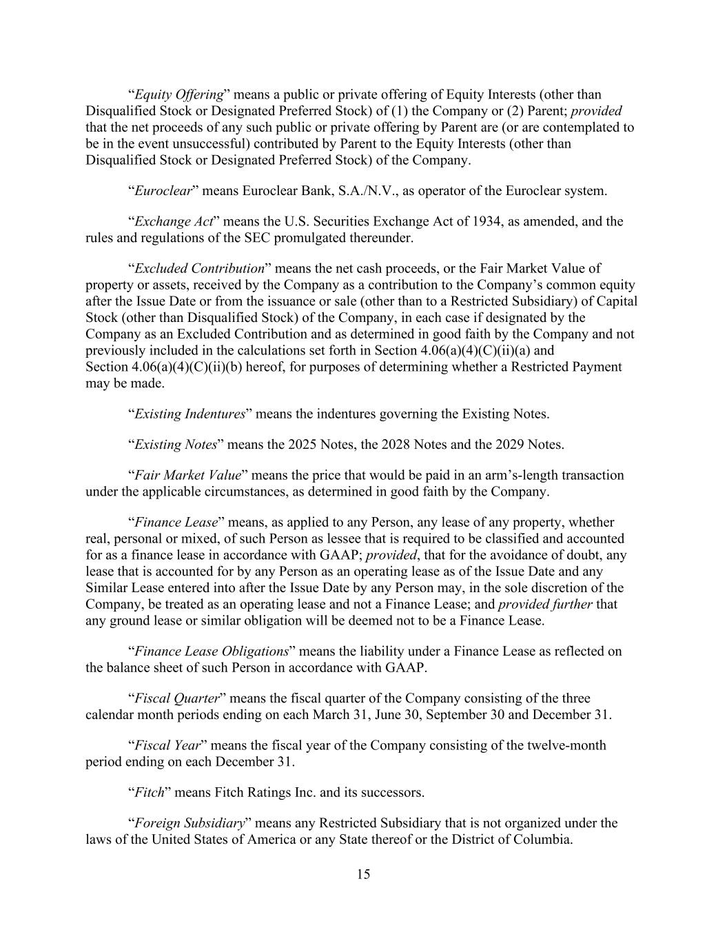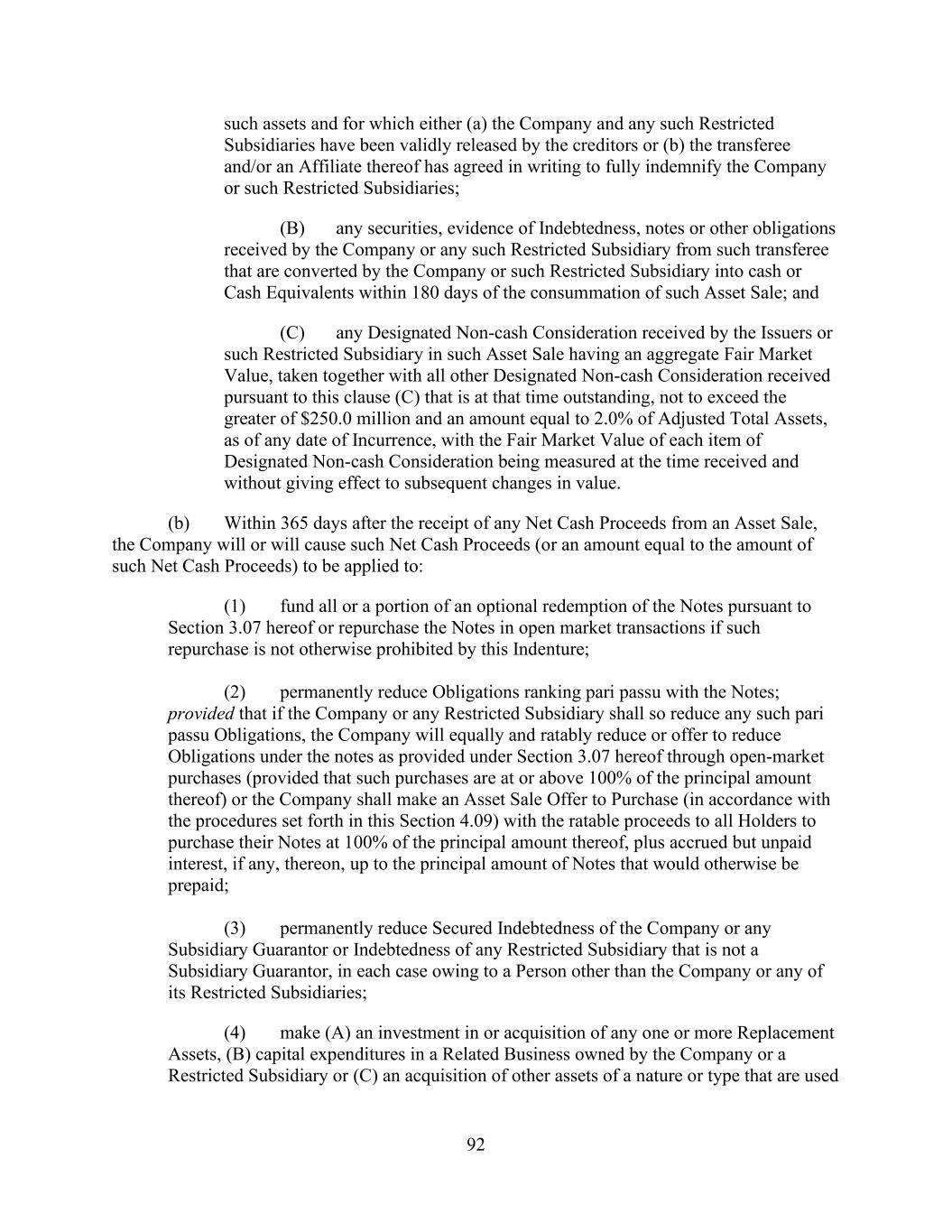 - 47 - “Subsidiary Borrower” means any Eligible Domestic Subsidiary that becomes a Subsidiary Borrower pursuant to Section 2.19. and that has not ceased to be a Subsidiary Borrower pursuant to such Section. “Subsidiary Guarantor Period” means any period commencing on the occurrence of a Subsidiary Guarantor Trigger Date and ending on the Subsidiary Guarantor Release Date subsequent to such Subsidiary Guarantor Trigger Date. “Subsidiary Guarantor Release” has the meaning given that term in Section 7.14(a). “Subsidiary Guarantor Release Certificate” has the meaning given that term in Section 7.14.(b)(i). “Subsidiary Guarantor Release Date” means any date after a Subsidiary Guarantor Trigger Date on which no Default or Event of Default is continuing and the Company delivers a Subsidiary Guarantor Release Certificate as required by Section 7.14. “Subsidiary Guarantor Trigger Date” means (a) any date after the Effective Date on which the Company delivers a Compliance Certificate pursuant to Section 8.3. which shows that the Leverage Ratio is greater than 6.50 to 1.00 as of the end of the two consecutive fiscal quarters of the Parent most recently ended prior to such date or (b) such later date as the Administrative Agent shall reasonably determine; provided that, following any Subsidiary Guarantor Release Date, any subsequent Subsidiary Guarantor Trigger Date shall be (x) any date on which the Company delivers a Compliance Certificate pursuant to Section 8.3. which shows that the Leverage Ratio is greater than 6.50 to 1.00 as of the end of the two consecutive fiscal quarters of the Parent most recently ended prior to such date or (y) such later date as the Administrative Agent shall reasonably determine. “Subsidiary Guarantors” means each Subsidiary that hereafter joins in the Guaranty by execution of an Accession Agreement (or Guaranty, as the case may be) pursuant to Section 7.13.(b). “Subsidiary Guaranty Documents” means, with respect to any Subsidiary that is required to become a Guarantor pursuant to Section 7.13., the following documents: (x) an Accession Agreement (or if the Guaranty is not then in effect, the Guaranty) executed by such Subsidiary and (y) the items with respect to such Subsidiary that would have been delivered under Sections 5.1.(a)(iv) through (viii) and (xvii) if such Subsidiary had been a Subsidiary Guarantor on the Effective Date (in the case of Section 5.1.(a)(iv), only to the extent requested by the Administrative Agent), each in form and substance reasonably satisfactory to the Administrative Agent. “Substantial Amount” means, at the time of determination thereof, an amount in excess of 15.0% of Total Asset Value as of the last day of the most recently completed fiscal year of the Parent and its Subsidiaries. “Supported QFC” has the meaning given that term in Section 12.10. “Swap Obligation” means, with respect to any Loan Party, any obligation to pay or perform under any agreement, contract or transaction that constitutes a “swap” within the meaning of Section 1a(47) of the Commodity Exchange Act. “Syndication Agents” means Bank of America and JPMorgan.