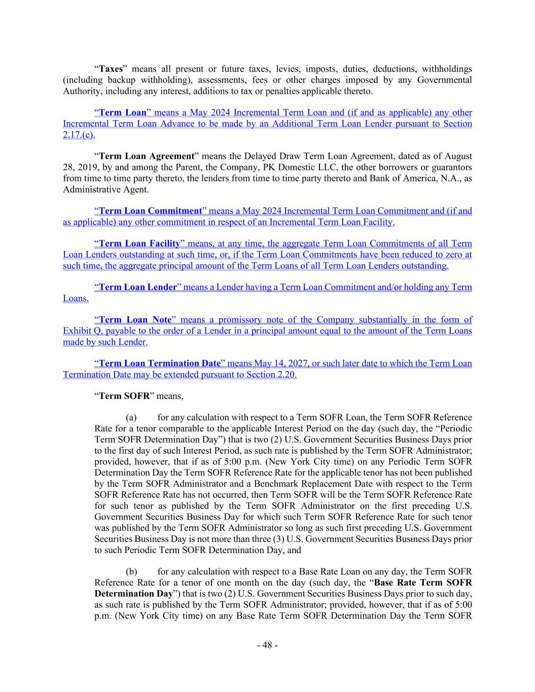 - 48 - “Taxes” means all present or future taxes, levies, imposts, duties, deductions, withholdings (including backup withholding), assessments, fees or other charges imposed by any Governmental Authority, including any interest, additions to tax or penalties applicable thereto. “Term Loan” means a May 2024 Incremental Term Loan and (if and as applicable) any other Incremental Term Loan Advance to be made by an Additional Term Loan Lender pursuant to Section 2.17.(c). “Term Loan Agreement” means the Delayed Draw Term Loan Agreement, dated as of August 28, 2019, by and among the Parent, the Company, PK Domestic LLC, the other borrowers or guarantors from time to time party thereto, the lenders from time to time party thereto and Bank of America, N.A., as Administrative Agent. “Term Loan Commitment” means a May 2024 Incremental Term Loan Commitment and (if and as applicable) any other commitment in respect of an Incremental Term Loan Facility. “Term Loan Facility” means, at any time, the aggregate Term Loan Commitments of all Term Loan Lenders outstanding at such time, or, if the Term Loan Commitments have been reduced to zero at such time, the aggregate principal amount of the Term Loans of all Term Loan Lenders outstanding. “Term Loan Lender” means a Lender having a Term Loan Commitment and/or holding any Term Loans. “Term Loan Note” means a promissory note of the Company substantially in the form of Exhibit Q, payable to the order of a Lender in a principal amount equal to the amount of the Term Loans made by such Lender. “Term Loan Termination Date” means May 14, 2027, or such later date to which the Term Loan Termination Date may be extended pursuant to Section 2.20. “Term SOFR” means, (a) for any calculation with respect to a Term SOFR Loan, the Term SOFR Reference Rate for a tenor comparable to the applicable Interest Period on the day (such day, the “Periodic Term SOFR Determination Day”) that is two (2) U.S. Government Securities Business Days prior to the first day of such Interest Period, as such rate is published by the Term SOFR Administrator; provided, however, that if as of 5:00 p.m. (New York City time) on any Periodic Term SOFR Determination Day the Term SOFR Reference Rate for the applicable tenor has not been published by the Term SOFR Administrator and a Benchmark Replacement Date with respect to the Term SOFR Reference Rate has not occurred, then Term SOFR will be the Term SOFR Reference Rate for such tenor as published by the Term SOFR Administrator on the first preceding U.S. Government Securities Business Day for which such Term SOFR Reference Rate for such tenor was published by the Term SOFR Administrator so long as such first preceding U.S. Government Securities Business Day is not more than three (3) U.S. Government Securities Business Days prior to such Periodic Term SOFR Determination Day, and (b) for any calculation with respect to a Base Rate Loan on any day, the Term SOFR Reference Rate for a tenor of one month on the day (such day, the “Base Rate Term SOFR Determination Day”) that is two (2) U.S. Government Securities Business Days prior to such day, as such rate is published by the Term SOFR Administrator; provided, however, that if as of 5:00 p.m. (New York City time) on any Base Rate Term SOFR Determination Day the Term SOFR