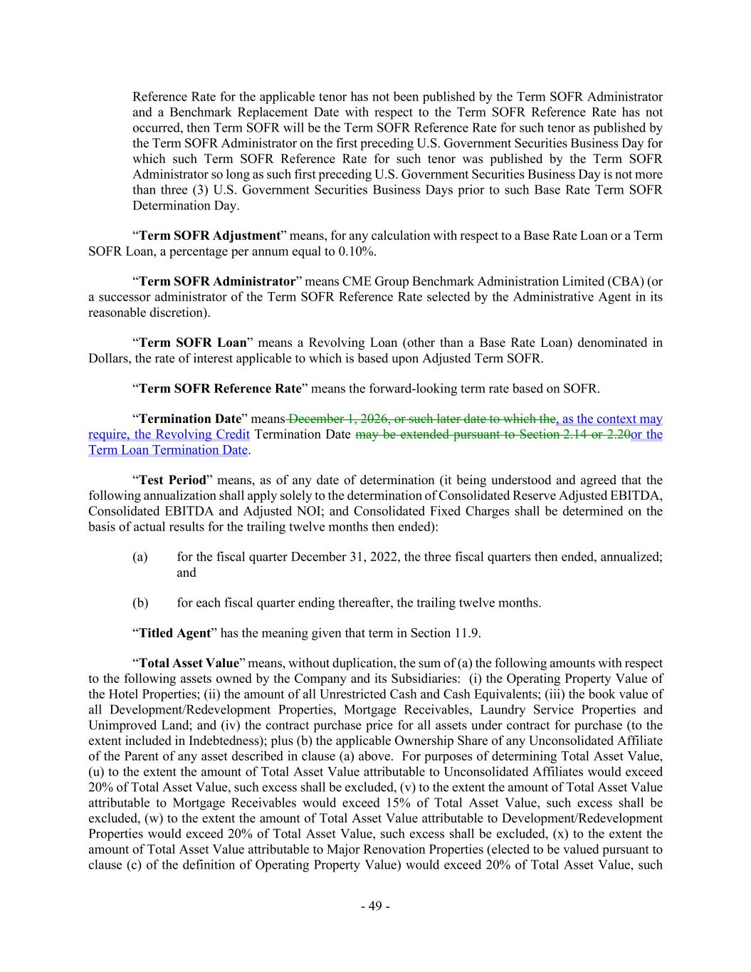 - 49 - Reference Rate for the applicable tenor has not been published by the Term SOFR Administrator and a Benchmark Replacement Date with respect to the Term SOFR Reference Rate has not occurred, then Term SOFR will be the Term SOFR Reference Rate for such tenor as published by the Term SOFR Administrator on the first preceding U.S. Government Securities Business Day for which such Term SOFR Reference Rate for such tenor was published by the Term SOFR Administrator so long as such first preceding U.S. Government Securities Business Day is not more than three (3) U.S. Government Securities Business Days prior to such Base Rate Term SOFR Determination Day. “Term SOFR Adjustment” means, for any calculation with respect to a Base Rate Loan or a Term SOFR Loan, a percentage per annum equal to 0.10%. “Term SOFR Administrator” means CME Group Benchmark Administration Limited (CBA) (or a successor administrator of the Term SOFR Reference Rate selected by the Administrative Agent in its reasonable discretion). “Term SOFR Loan” means a Revolving Loan (other than a Base Rate Loan) denominated in Dollars, the rate of interest applicable to which is based upon Adjusted Term SOFR. “Term SOFR Reference Rate” means the forward-looking term rate based on SOFR. “Termination Date” means December 1, 2026, or such later date to which the, as the context may require, the Revolving Credit Termination Date may be extended pursuant to Section 2.14 or 2.20or the Term Loan Termination Date. “Test Period” means, as of any date of determination (it being understood and agreed that the following annualization shall apply solely to the determination of Consolidated Reserve Adjusted EBITDA, Consolidated EBITDA and Adjusted NOI; and Consolidated Fixed Charges shall be determined on the basis of actual results for the trailing twelve months then ended): (a) for the fiscal quarter December 31, 2022, the three fiscal quarters then ended, annualized; and (b) for each fiscal quarter ending thereafter, the trailing twelve months. “Titled Agent” has the meaning given that term in Section 11.9. “Total Asset Value” means, without duplication, the sum of (a) the following amounts with respect to the following assets owned by the Company and its Subsidiaries: (i) the Operating Property Value of the Hotel Properties; (ii) the amount of all Unrestricted Cash and Cash Equivalents; (iii) the book value of all Development/Redevelopment Properties, Mortgage Receivables, Laundry Service Properties and Unimproved Land; and (iv) the contract purchase price for all assets under contract for purchase (to the extent included in Indebtedness); plus (b) the applicable Ownership Share of any Unconsolidated Affiliate of the Parent of any asset described in clause (a) above. For purposes of determining Total Asset Value, (u) to the extent the amount of Total Asset Value attributable to Unconsolidated Affiliates would exceed 20% of Total Asset Value, such excess shall be excluded, (v) to the extent the amount of Total Asset Value attributable to Mortgage Receivables would exceed 15% of Total Asset Value, such excess shall be excluded, (w) to the extent the amount of Total Asset Value attributable to Development/Redevelopment Properties would exceed 20% of Total Asset Value, such excess shall be excluded, (x) to the extent the amount of Total Asset Value attributable to Major Renovation Properties (elected to be valued pursuant to clause (c) of the definition of Operating Property Value) would exceed 20% of Total Asset Value, such