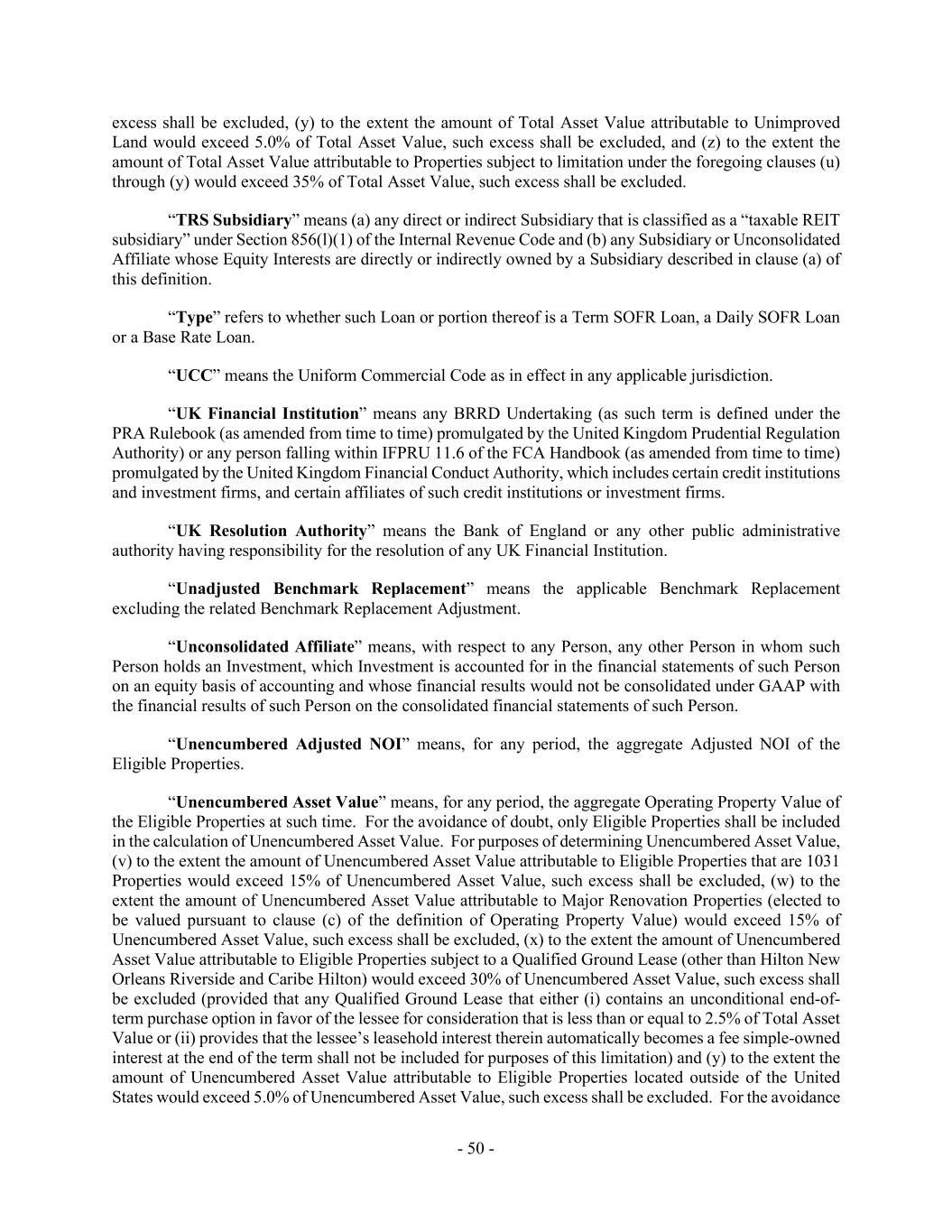- 50 - excess shall be excluded, (y) to the extent the amount of Total Asset Value attributable to Unimproved Land would exceed 5.0% of Total Asset Value, such excess shall be excluded, and (z) to the extent the amount of Total Asset Value attributable to Properties subject to limitation under the foregoing clauses (u) through (y) would exceed 35% of Total Asset Value, such excess shall be excluded. “TRS Subsidiary” means (a) any direct or indirect Subsidiary that is classified as a “taxable REIT subsidiary” under Section 856(l)(1) of the Internal Revenue Code and (b) any Subsidiary or Unconsolidated Affiliate whose Equity Interests are directly or indirectly owned by a Subsidiary described in clause (a) of this definition. “Type” refers to whether such Loan or portion thereof is a Term SOFR Loan, a Daily SOFR Loan or a Base Rate Loan. “UCC” means the Uniform Commercial Code as in effect in any applicable jurisdiction. “UK Financial Institution” means any BRRD Undertaking (as such term is defined under the PRA Rulebook (as amended from time to time) promulgated by the United Kingdom Prudential Regulation Authority) or any person falling within IFPRU 11.6 of the FCA Handbook (as amended from time to time) promulgated by the United Kingdom Financial Conduct Authority, which includes certain credit institutions and investment firms, and certain affiliates of such credit institutions or investment firms. “UK Resolution Authority” means the Bank of England or any other public administrative authority having responsibility for the resolution of any UK Financial Institution. “Unadjusted Benchmark Replacement” means the applicable Benchmark Replacement excluding the related Benchmark Replacement Adjustment. “Unconsolidated Affiliate” means, with respect to any Person, any other Person in whom such Person holds an Investment, which Investment is accounted for in the financial statements of such Person on an equity basis of accounting and whose financial results would not be consolidated under GAAP with the financial results of such Person on the consolidated financial statements of such Person. “Unencumbered Adjusted NOI” means, for any period, the aggregate Adjusted NOI of the Eligible Properties. “Unencumbered Asset Value” means, for any period, the aggregate Operating Property Value of the Eligible Properties at such time. For the avoidance of doubt, only Eligible Properties shall be included in the calculation of Unencumbered Asset Value. For purposes of determining Unencumbered Asset Value, (v) to the extent the amount of Unencumbered Asset Value attributable to Eligible Properties that are 1031 Properties would exceed 15% of Unencumbered Asset Value, such excess shall be excluded, (w) to the extent the amount of Unencumbered Asset Value attributable to Major Renovation Properties (elected to be valued pursuant to clause (c) of the definition of Operating Property Value) would exceed 15% of Unencumbered Asset Value, such excess shall be excluded, (x) to the extent the amount of Unencumbered Asset Value attributable to Eligible Properties subject to a Qualified Ground Lease (other than Hilton New Orleans Riverside and Caribe Hilton) would exceed 30% of Unencumbered Asset Value, such excess shall be excluded (provided that any Qualified Ground Lease that either (i) contains an unconditional end-of- term purchase option in favor of the lessee for consideration that is less than or equal to 2.5% of Total Asset Value or (ii) provides that the lessee’s leasehold interest therein automatically becomes a fee simple-owned interest at the end of the term shall not be included for purposes of this limitation) and (y) to the extent the amount of Unencumbered Asset Value attributable to Eligible Properties located outside of the United States would exceed 5.0% of Unencumbered Asset Value, such excess shall be excluded. For the avoidance