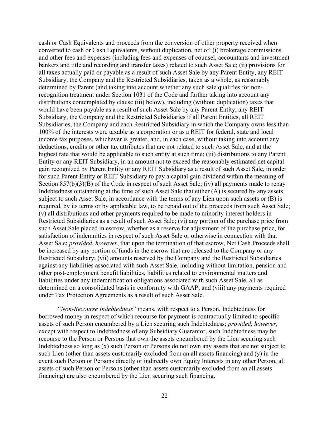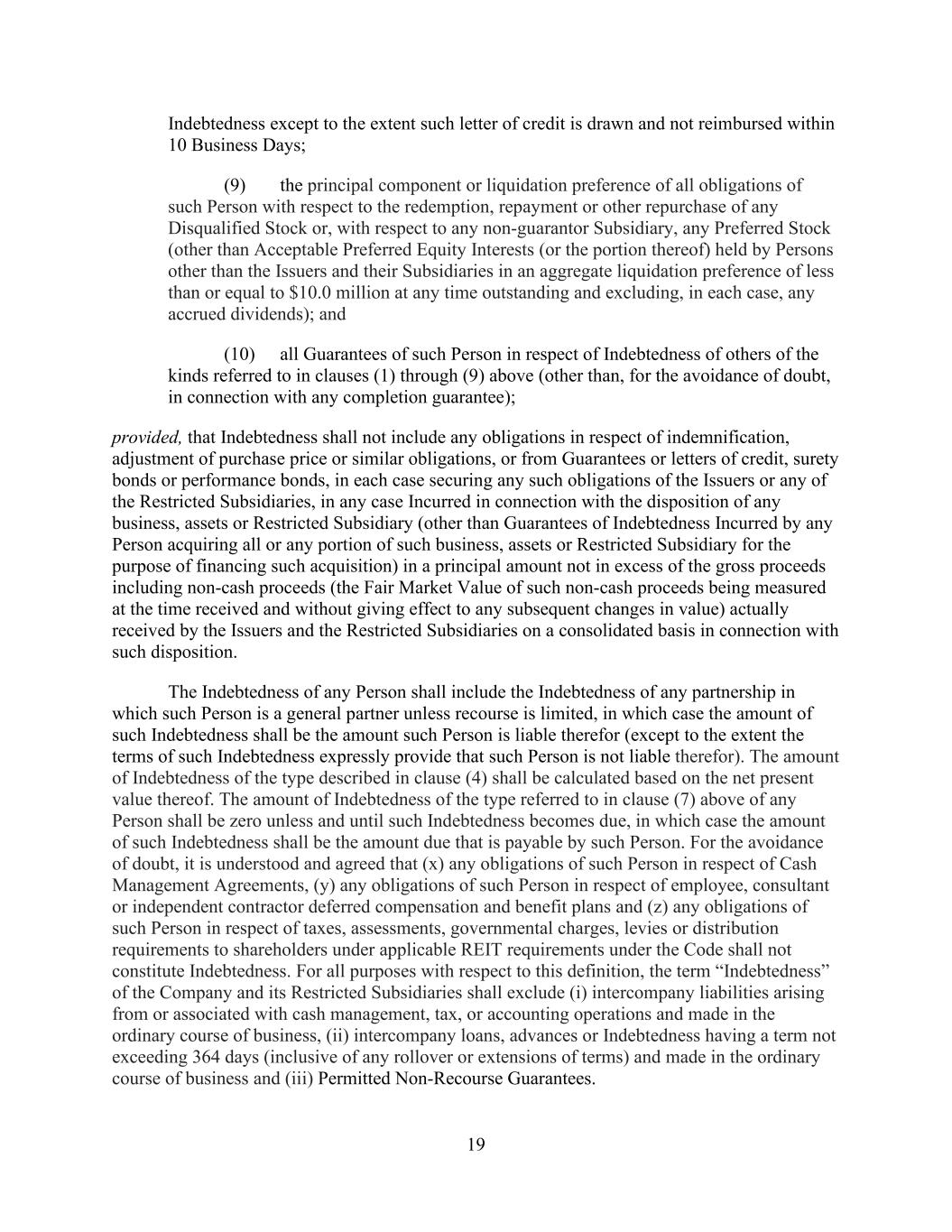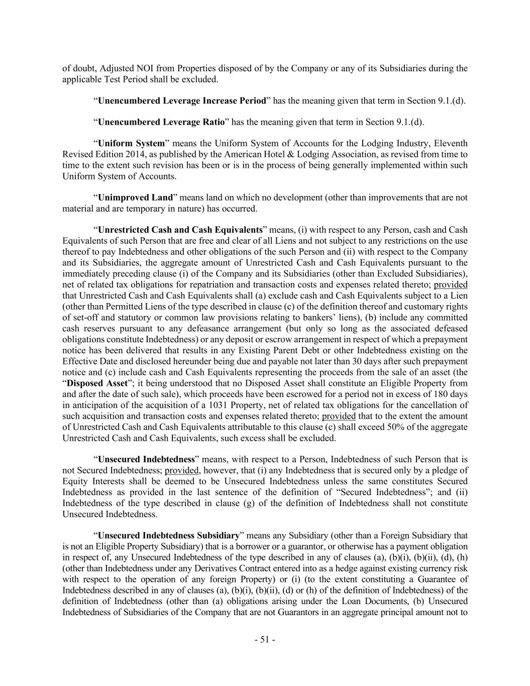 - 51 - of doubt, Adjusted NOI from Properties disposed of by the Company or any of its Subsidiaries during the applicable Test Period shall be excluded. “Unencumbered Leverage Increase Period” has the meaning given that term in Section 9.1.(d). “Unencumbered Leverage Ratio” has the meaning given that term in Section 9.1.(d). “Uniform System” means the Uniform System of Accounts for the Lodging Industry, Eleventh Revised Edition 2014, as published by the American Hotel & Lodging Association, as revised from time to time to the extent such revision has been or is in the process of being generally implemented within such Uniform System of Accounts. “Unimproved Land” means land on which no development (other than improvements that are not material and are temporary in nature) has occurred. “Unrestricted Cash and Cash Equivalents” means, (i) with respect to any Person, cash and Cash Equivalents of such Person that are free and clear of all Liens and not subject to any restrictions on the use thereof to pay Indebtedness and other obligations of the such Person and (ii) with respect to the Company and its Subsidiaries, the aggregate amount of Unrestricted Cash and Cash Equivalents pursuant to the immediately preceding clause (i) of the Company and its Subsidiaries (other than Excluded Subsidiaries), net of related tax obligations for repatriation and transaction costs and expenses related thereto; provided that Unrestricted Cash and Cash Equivalents shall (a) exclude cash and Cash Equivalents subject to a Lien (other than Permitted Liens of the type described in clause (c) of the definition thereof and customary rights of set-off and statutory or common law provisions relating to bankers’ liens), (b) include any committed cash reserves pursuant to any defeasance arrangement (but only so long as the associated defeased obligations constitute Indebtedness) or any deposit or escrow arrangement in respect of which a prepayment notice has been delivered that results in any Existing Parent Debt or other Indebtedness existing on the Effective Date and disclosed hereunder being due and payable not later than 30 days after such prepayment notice and (c) include cash and Cash Equivalents representing the proceeds from the sale of an asset (the “Disposed Asset”; it being understood that no Disposed Asset shall constitute an Eligible Property from and after the date of such sale), which proceeds have been escrowed for a period not in excess of 180 days in anticipation of the acquisition of a 1031 Property, net of related tax obligations for the cancellation of such acquisition and transaction costs and expenses related thereto; provided that to the extent the amount of Unrestricted Cash and Cash Equivalents attributable to this clause (c) shall exceed 50% of the aggregate Unrestricted Cash and Cash Equivalents, such excess shall be excluded. “Unsecured Indebtedness” means, with respect to a Person, Indebtedness of such Person that is not Secured Indebtedness; provided, however, that (i) any Indebtedness that is secured only by a pledge of Equity Interests shall be deemed to be Unsecured Indebtedness unless the same constitutes Secured Indebtedness as provided in the last sentence of the definition of “Secured Indebtedness”; and (ii) Indebtedness of the type described in clause (g) of the definition of Indebtedness shall not constitute Unsecured Indebtedness. “Unsecured Indebtedness Subsidiary” means any Subsidiary (other than a Foreign Subsidiary that is not an Eligible Property Subsidiary) that is a borrower or a guarantor, or otherwise has a payment obligation in respect of, any Unsecured Indebtedness of the type described in any of clauses (a), (b)(i), (b)(ii), (d), (h) (other than Indebtedness under any Derivatives Contract entered into as a hedge against existing currency risk with respect to the operation of any foreign Property) or (i) (to the extent constituting a Guarantee of Indebtedness described in any of clauses (a), (b)(i), (b)(ii), (d) or (h) of the definition of Indebtedness) of the definition of Indebtedness (other than (a) obligations arising under the Loan Documents, (b) Unsecured Indebtedness of Subsidiaries of the Company that are not Guarantors in an aggregate principal amount not to