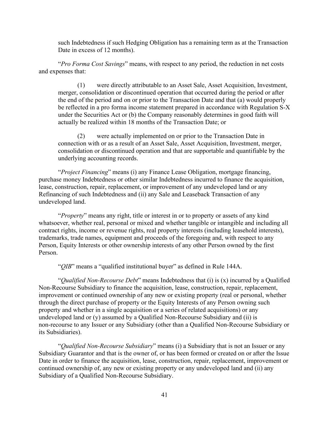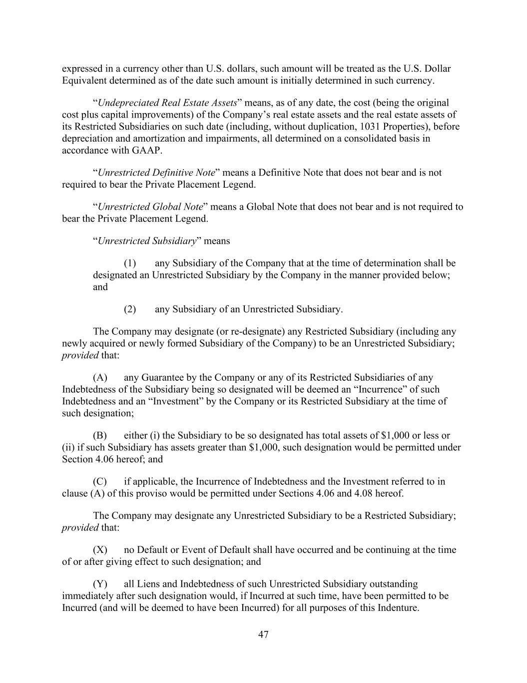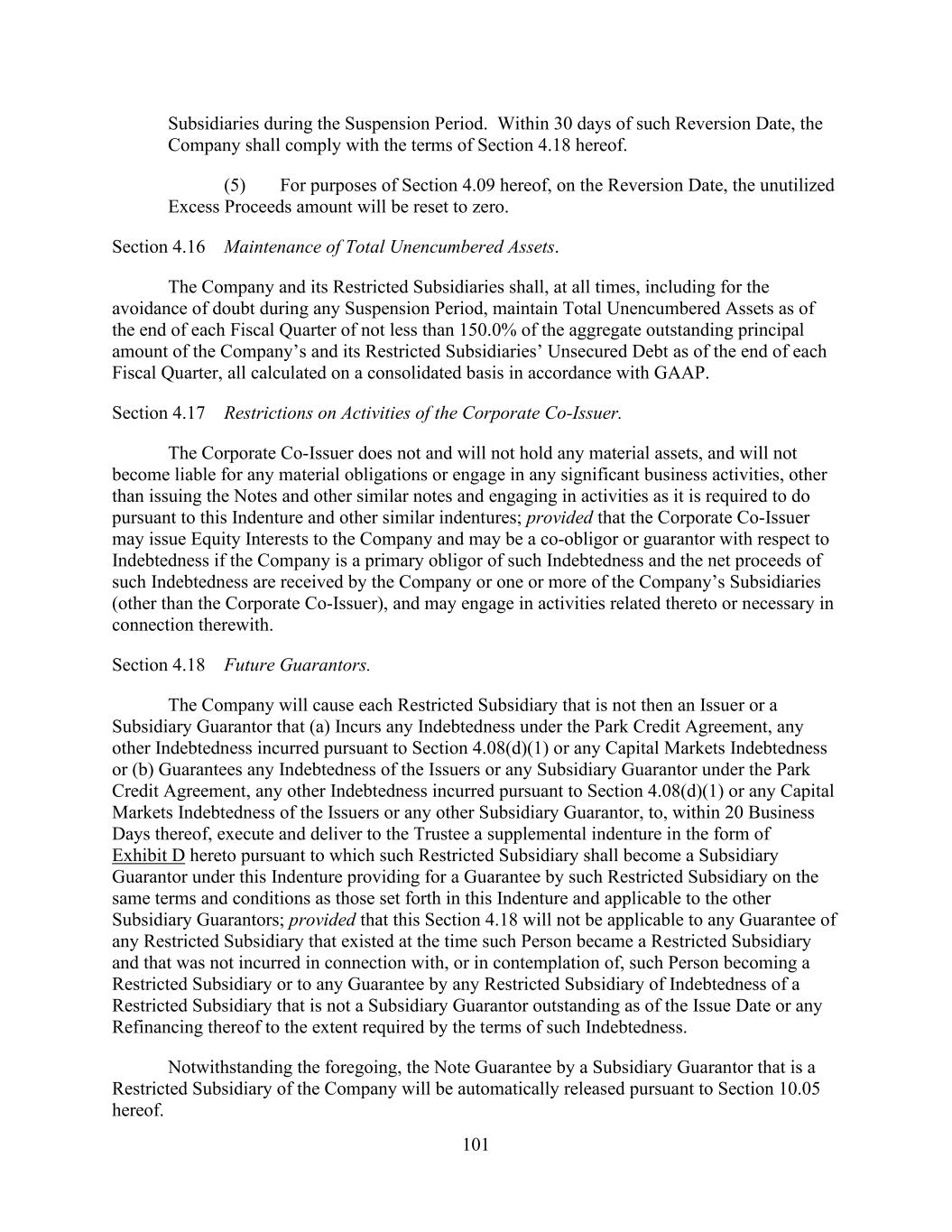 - 51 - of doubt, Adjusted NOI from Properties disposed of by the Company or any of its Subsidiaries during the applicable Test Period shall be excluded. “Unencumbered Leverage Increase Period” has the meaning given that term in Section 9.1.(d). “Unencumbered Leverage Ratio” has the meaning given that term in Section 9.1.(d). “Uniform System” means the Uniform System of Accounts for the Lodging Industry, Eleventh Revised Edition 2014, as published by the American Hotel & Lodging Association, as revised from time to time to the extent such revision has been or is in the process of being generally implemented within such Uniform System of Accounts. “Unimproved Land” means land on which no development (other than improvements that are not material and are temporary in nature) has occurred. “Unrestricted Cash and Cash Equivalents” means, (i) with respect to any Person, cash and Cash Equivalents of such Person that are free and clear of all Liens and not subject to any restrictions on the use thereof to pay Indebtedness and other obligations of the such Person and (ii) with respect to the Company and its Subsidiaries, the aggregate amount of Unrestricted Cash and Cash Equivalents pursuant to the immediately preceding clause (i) of the Company and its Subsidiaries (other than Excluded Subsidiaries), net of related tax obligations for repatriation and transaction costs and expenses related thereto; provided that Unrestricted Cash and Cash Equivalents shall (a) exclude cash and Cash Equivalents subject to a Lien (other than Permitted Liens of the type described in clause (c) of the definition thereof and customary rights of set-off and statutory or common law provisions relating to bankers’ liens), (b) include any committed cash reserves pursuant to any defeasance arrangement (but only so long as the associated defeased obligations constitute Indebtedness) or any deposit or escrow arrangement in respect of which a prepayment notice has been delivered that results in any Existing Parent Debt or other Indebtedness existing on the Effective Date and disclosed hereunder being due and payable not later than 30 days after such prepayment notice and (c) include cash and Cash Equivalents representing the proceeds from the sale of an asset (the “Disposed Asset”; it being understood that no Disposed Asset shall constitute an Eligible Property from and after the date of such sale), which proceeds have been escrowed for a period not in excess of 180 days in anticipation of the acquisition of a 1031 Property, net of related tax obligations for the cancellation of such acquisition and transaction costs and expenses related thereto; provided that to the extent the amount of Unrestricted Cash and Cash Equivalents attributable to this clause (c) shall exceed 50% of the aggregate Unrestricted Cash and Cash Equivalents, such excess shall be excluded. “Unsecured Indebtedness” means, with respect to a Person, Indebtedness of such Person that is not Secured Indebtedness; provided, however, that (i) any Indebtedness that is secured only by a pledge of Equity Interests shall be deemed to be Unsecured Indebtedness unless the same constitutes Secured Indebtedness as provided in the last sentence of the definition of “Secured Indebtedness”; and (ii) Indebtedness of the type described in clause (g) of the definition of Indebtedness shall not constitute Unsecured Indebtedness. “Unsecured Indebtedness Subsidiary” means any Subsidiary (other than a Foreign Subsidiary that is not an Eligible Property Subsidiary) that is a borrower or a guarantor, or otherwise has a payment obligation in respect of, any Unsecured Indebtedness of the type described in any of clauses (a), (b)(i), (b)(ii), (d), (h) (other than Indebtedness under any Derivatives Contract entered into as a hedge against existing currency risk with respect to the operation of any foreign Property) or (i) (to the extent constituting a Guarantee of Indebtedness described in any of clauses (a), (b)(i), (b)(ii), (d) or (h) of the definition of Indebtedness) of the definition of Indebtedness (other than (a) obligations arising under the Loan Documents, (b) Unsecured Indebtedness of Subsidiaries of the Company that are not Guarantors in an aggregate principal amount not to