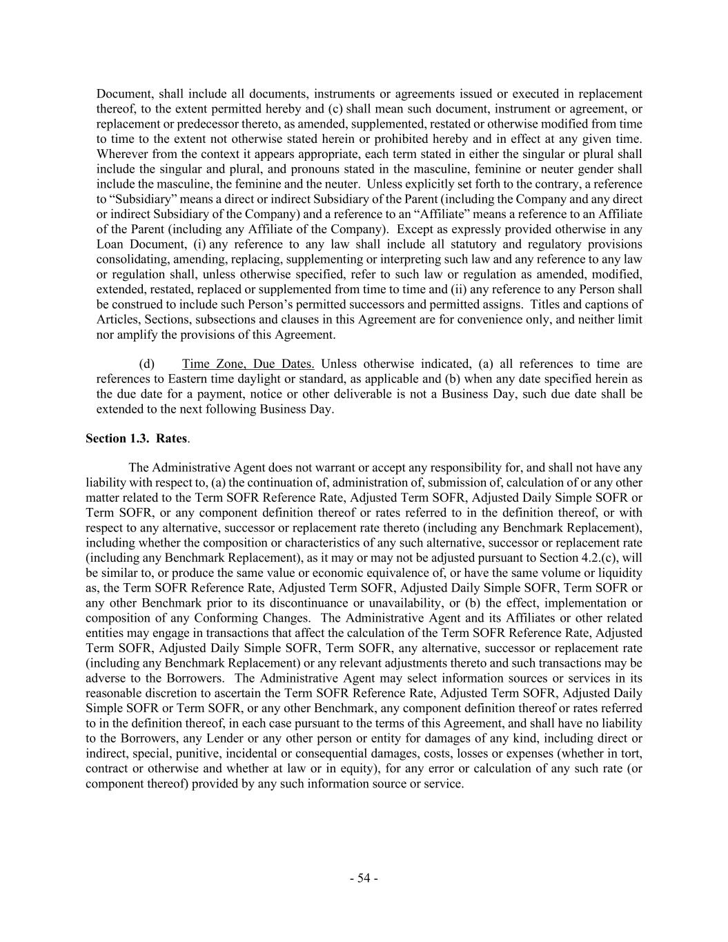 - 54 - Document, shall include all documents, instruments or agreements issued or executed in replacement thereof, to the extent permitted hereby and (c) shall mean such document, instrument or agreement, or replacement or predecessor thereto, as amended, supplemented, restated or otherwise modified from time to time to the extent not otherwise stated herein or prohibited hereby and in effect at any given time. Wherever from the context it appears appropriate, each term stated in either the singular or plural shall include the singular and plural, and pronouns stated in the masculine, feminine or neuter gender shall include the masculine, the feminine and the neuter. Unless explicitly set forth to the contrary, a reference to “Subsidiary” means a direct or indirect Subsidiary of the Parent (including the Company and any direct or indirect Subsidiary of the Company) and a reference to an “Affiliate” means a reference to an Affiliate of the Parent (including any Affiliate of the Company). Except as expressly provided otherwise in any Loan Document, (i) any reference to any law shall include all statutory and regulatory provisions consolidating, amending, replacing, supplementing or interpreting such law and any reference to any law or regulation shall, unless otherwise specified, refer to such law or regulation as amended, modified, extended, restated, replaced or supplemented from time to time and (ii) any reference to any Person shall be construed to include such Person’s permitted successors and permitted assigns. Titles and captions of Articles, Sections, subsections and clauses in this Agreement are for convenience only, and neither limit nor amplify the provisions of this Agreement. (d) Time Zone, Due Dates. Unless otherwise indicated, (a) all references to time are references to Eastern time daylight or standard, as applicable and (b) when any date specified herein as the due date for a payment, notice or other deliverable is not a Business Day, such due date shall be extended to the next following Business Day. Section 1.3. Rates. The Administrative Agent does not warrant or accept any responsibility for, and shall not have any liability with respect to, (a) the continuation of, administration of, submission of, calculation of or any other matter related to the Term SOFR Reference Rate, Adjusted Term SOFR, Adjusted Daily Simple SOFR or Term SOFR, or any component definition thereof or rates referred to in the definition thereof, or with respect to any alternative, successor or replacement rate thereto (including any Benchmark Replacement), including whether the composition or characteristics of any such alternative, successor or replacement rate (including any Benchmark Replacement), as it may or may not be adjusted pursuant to Section 4.2.(c), will be similar to, or produce the same value or economic equivalence of, or have the same volume or liquidity as, the Term SOFR Reference Rate, Adjusted Term SOFR, Adjusted Daily Simple SOFR, Term SOFR or any other Benchmark prior to its discontinuance or unavailability, or (b) the effect, implementation or composition of any Conforming Changes. The Administrative Agent and its Affiliates or other related entities may engage in transactions that affect the calculation of the Term SOFR Reference Rate, Adjusted Term SOFR, Adjusted Daily Simple SOFR, Term SOFR, any alternative, successor or replacement rate (including any Benchmark Replacement) or any relevant adjustments thereto and such transactions may be adverse to the Borrowers. The Administrative Agent may select information sources or services in its reasonable discretion to ascertain the Term SOFR Reference Rate, Adjusted Term SOFR, Adjusted Daily Simple SOFR or Term SOFR, or any other Benchmark, any component definition thereof or rates referred to in the definition thereof, in each case pursuant to the terms of this Agreement, and shall have no liability to the Borrowers, any Lender or any other person or entity for damages of any kind, including direct or indirect, special, punitive, incidental or consequential damages, costs, losses or expenses (whether in tort, contract or otherwise and whether at law or in equity), for any error or calculation of any such rate (or component thereof) provided by any such information source or service.