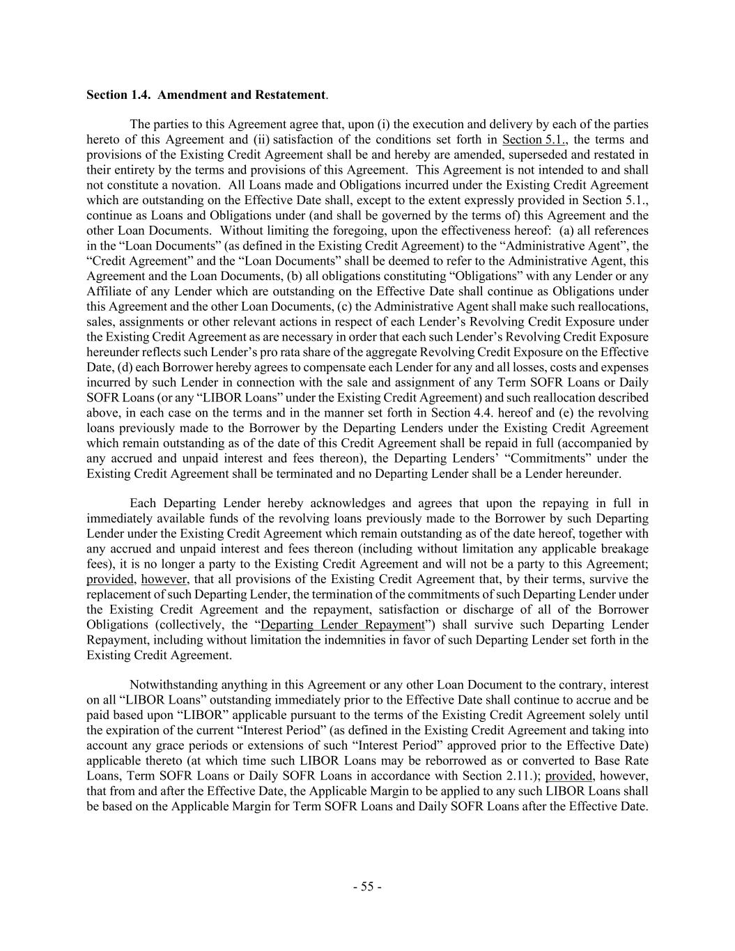 - 55 - Section 1.4. Amendment and Restatement. The parties to this Agreement agree that, upon (i) the execution and delivery by each of the parties hereto of this Agreement and (ii) satisfaction of the conditions set forth in Section 5.1., the terms and provisions of the Existing Credit Agreement shall be and hereby are amended, superseded and restated in their entirety by the terms and provisions of this Agreement. This Agreement is not intended to and shall not constitute a novation. All Loans made and Obligations incurred under the Existing Credit Agreement which are outstanding on the Effective Date shall, except to the extent expressly provided in Section 5.1., continue as Loans and Obligations under (and shall be governed by the terms of) this Agreement and the other Loan Documents. Without limiting the foregoing, upon the effectiveness hereof: (a) all references in the “Loan Documents” (as defined in the Existing Credit Agreement) to the “Administrative Agent”, the “Credit Agreement” and the “Loan Documents” shall be deemed to refer to the Administrative Agent, this Agreement and the Loan Documents, (b) all obligations constituting “Obligations” with any Lender or any Affiliate of any Lender which are outstanding on the Effective Date shall continue as Obligations under this Agreement and the other Loan Documents, (c) the Administrative Agent shall make such reallocations, sales, assignments or other relevant actions in respect of each Lender’s Revolving Credit Exposure under the Existing Credit Agreement as are necessary in order that each such Lender’s Revolving Credit Exposure hereunder reflects such Lender’s pro rata share of the aggregate Revolving Credit Exposure on the Effective Date, (d) each Borrower hereby agrees to compensate each Lender for any and all losses, costs and expenses incurred by such Lender in connection with the sale and assignment of any Term SOFR Loans or Daily SOFR Loans (or any “LIBOR Loans” under the Existing Credit Agreement) and such reallocation described above, in each case on the terms and in the manner set forth in Section 4.4. hereof and (e) the revolving loans previously made to the Borrower by the Departing Lenders under the Existing Credit Agreement which remain outstanding as of the date of this Credit Agreement shall be repaid in full (accompanied by any accrued and unpaid interest and fees thereon), the Departing Lenders’ “Commitments” under the Existing Credit Agreement shall be terminated and no Departing Lender shall be a Lender hereunder. Each Departing Lender hereby acknowledges and agrees that upon the repaying in full in immediately available funds of the revolving loans previously made to the Borrower by such Departing Lender under the Existing Credit Agreement which remain outstanding as of the date hereof, together with any accrued and unpaid interest and fees thereon (including without limitation any applicable breakage fees), it is no longer a party to the Existing Credit Agreement and will not be a party to this Agreement; provided, however, that all provisions of the Existing Credit Agreement that, by their terms, survive the replacement of such Departing Lender, the termination of the commitments of such Departing Lender under the Existing Credit Agreement and the repayment, satisfaction or discharge of all of the Borrower Obligations (collectively, the “Departing Lender Repayment”) shall survive such Departing Lender Repayment, including without limitation the indemnities in favor of such Departing Lender set forth in the Existing Credit Agreement. Notwithstanding anything in this Agreement or any other Loan Document to the contrary, interest on all “LIBOR Loans” outstanding immediately prior to the Effective Date shall continue to accrue and be paid based upon “LIBOR” applicable pursuant to the terms of the Existing Credit Agreement solely until the expiration of the current “Interest Period” (as defined in the Existing Credit Agreement and taking into account any grace periods or extensions of such “Interest Period” approved prior to the Effective Date) applicable thereto (at which time such LIBOR Loans may be reborrowed as or converted to Base Rate Loans, Term SOFR Loans or Daily SOFR Loans in accordance with Section 2.11.); provided, however, that from and after the Effective Date, the Applicable Margin to be applied to any such LIBOR Loans shall be based on the Applicable Margin for Term SOFR Loans and Daily SOFR Loans after the Effective Date.