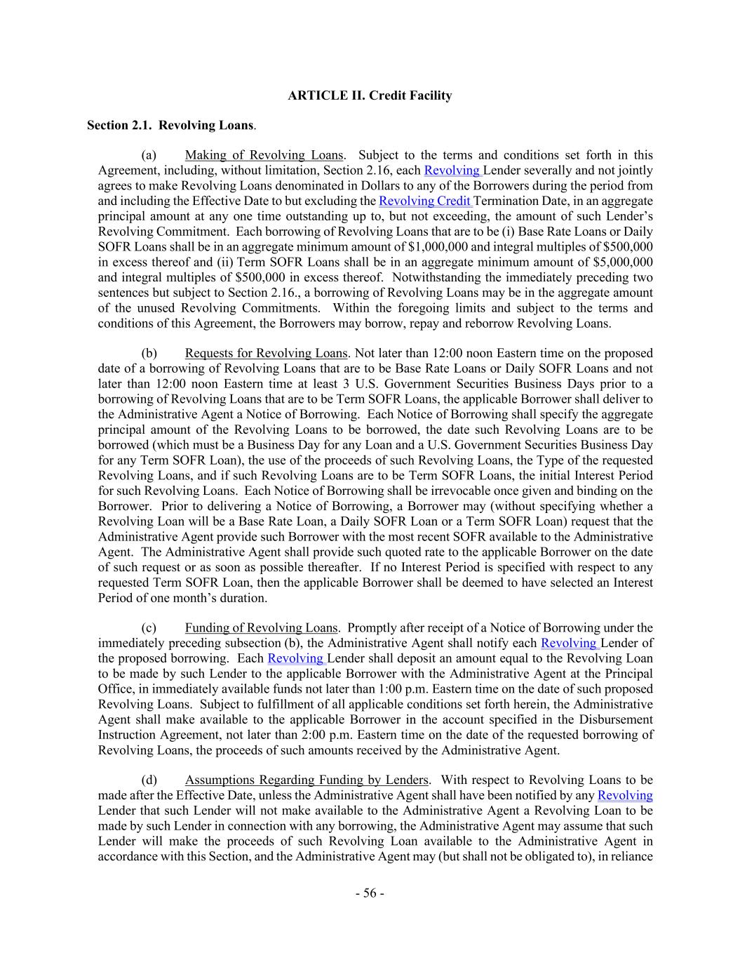 - 56 - ARTICLE II. Credit Facility Section 2.1. Revolving Loans. (a) Making of Revolving Loans. Subject to the terms and conditions set forth in this Agreement, including, without limitation, Section 2.16, each Revolving Lender severally and not jointly agrees to make Revolving Loans denominated in Dollars to any of the Borrowers during the period from and including the Effective Date to but excluding the Revolving Credit Termination Date, in an aggregate principal amount at any one time outstanding up to, but not exceeding, the amount of such Lender’s Revolving Commitment. Each borrowing of Revolving Loans that are to be (i) Base Rate Loans or Daily SOFR Loans shall be in an aggregate minimum amount of $1,000,000 and integral multiples of $500,000 in excess thereof and (ii) Term SOFR Loans shall be in an aggregate minimum amount of $5,000,000 and integral multiples of $500,000 in excess thereof. Notwithstanding the immediately preceding two sentences but subject to Section 2.16., a borrowing of Revolving Loans may be in the aggregate amount of the unused Revolving Commitments. Within the foregoing limits and subject to the terms and conditions of this Agreement, the Borrowers may borrow, repay and reborrow Revolving Loans. (b) Requests for Revolving Loans. Not later than 12:00 noon Eastern time on the proposed date of a borrowing of Revolving Loans that are to be Base Rate Loans or Daily SOFR Loans and not later than 12:00 noon Eastern time at least 3 U.S. Government Securities Business Days prior to a borrowing of Revolving Loans that are to be Term SOFR Loans, the applicable Borrower shall deliver to the Administrative Agent a Notice of Borrowing. Each Notice of Borrowing shall specify the aggregate principal amount of the Revolving Loans to be borrowed, the date such Revolving Loans are to be borrowed (which must be a Business Day for any Loan and a U.S. Government Securities Business Day for any Term SOFR Loan), the use of the proceeds of such Revolving Loans, the Type of the requested Revolving Loans, and if such Revolving Loans are to be Term SOFR Loans, the initial Interest Period for such Revolving Loans. Each Notice of Borrowing shall be irrevocable once given and binding on the Borrower. Prior to delivering a Notice of Borrowing, a Borrower may (without specifying whether a Revolving Loan will be a Base Rate Loan, a Daily SOFR Loan or a Term SOFR Loan) request that the Administrative Agent provide such Borrower with the most recent SOFR available to the Administrative Agent. The Administrative Agent shall provide such quoted rate to the applicable Borrower on the date of such request or as soon as possible thereafter. If no Interest Period is specified with respect to any requested Term SOFR Loan, then the applicable Borrower shall be deemed to have selected an Interest Period of one month’s duration. (c) Funding of Revolving Loans. Promptly after receipt of a Notice of Borrowing under the immediately preceding subsection (b), the Administrative Agent shall notify each Revolving Lender of the proposed borrowing. Each Revolving Lender shall deposit an amount equal to the Revolving Loan to be made by such Lender to the applicable Borrower with the Administrative Agent at the Principal Office, in immediately available funds not later than 1:00 p.m. Eastern time on the date of such proposed Revolving Loans. Subject to fulfillment of all applicable conditions set forth herein, the Administrative Agent shall make available to the applicable Borrower in the account specified in the Disbursement Instruction Agreement, not later than 2:00 p.m. Eastern time on the date of the requested borrowing of Revolving Loans, the proceeds of such amounts received by the Administrative Agent. (d) Assumptions Regarding Funding by Lenders. With respect to Revolving Loans to be made after the Effective Date, unless the Administrative Agent shall have been notified by any Revolving Lender that such Lender will not make available to the Administrative Agent a Revolving Loan to be made by such Lender in connection with any borrowing, the Administrative Agent may assume that such Lender will make the proceeds of such Revolving Loan available to the Administrative Agent in accordance with this Section, and the Administrative Agent may (but shall not be obligated to), in reliance