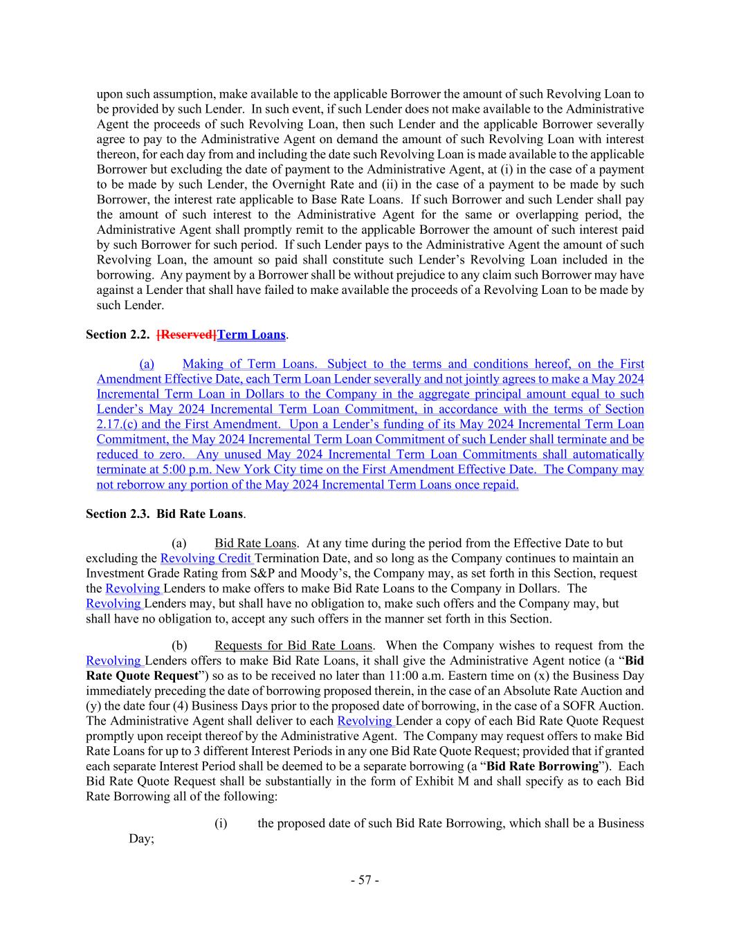 - 57 - upon such assumption, make available to the applicable Borrower the amount of such Revolving Loan to be provided by such Lender. In such event, if such Lender does not make available to the Administrative Agent the proceeds of such Revolving Loan, then such Lender and the applicable Borrower severally agree to pay to the Administrative Agent on demand the amount of such Revolving Loan with interest thereon, for each day from and including the date such Revolving Loan is made available to the applicable Borrower but excluding the date of payment to the Administrative Agent, at (i) in the case of a payment to be made by such Lender, the Overnight Rate and (ii) in the case of a payment to be made by such Borrower, the interest rate applicable to Base Rate Loans. If such Borrower and such Lender shall pay the amount of such interest to the Administrative Agent for the same or overlapping period, the Administrative Agent shall promptly remit to the applicable Borrower the amount of such interest paid by such Borrower for such period. If such Lender pays to the Administrative Agent the amount of such Revolving Loan, the amount so paid shall constitute such Lender’s Revolving Loan included in the borrowing. Any payment by a Borrower shall be without prejudice to any claim such Borrower may have against a Lender that shall have failed to make available the proceeds of a Revolving Loan to be made by such Lender. Section 2.2. [Reserved]Term Loans. (a) Making of Term Loans. Subject to the terms and conditions hereof, on the First Amendment Effective Date, each Term Loan Lender severally and not jointly agrees to make a May 2024 Incremental Term Loan in Dollars to the Company in the aggregate principal amount equal to such Lender’s May 2024 Incremental Term Loan Commitment, in accordance with the terms of Section 2.17.(c) and the First Amendment. Upon a Lender’s funding of its May 2024 Incremental Term Loan Commitment, the May 2024 Incremental Term Loan Commitment of such Lender shall terminate and be reduced to zero. Any unused May 2024 Incremental Term Loan Commitments shall automatically terminate at 5:00 p.m. New York City time on the First Amendment Effective Date. The Company may not reborrow any portion of the May 2024 Incremental Term Loans once repaid. Section 2.3. Bid Rate Loans. (a) Bid Rate Loans. At any time during the period from the Effective Date to but excluding the Revolving Credit Termination Date, and so long as the Company continues to maintain an Investment Grade Rating from S&P and Moody’s, the Company may, as set forth in this Section, request the Revolving Lenders to make offers to make Bid Rate Loans to the Company in Dollars. The Revolving Lenders may, but shall have no obligation to, make such offers and the Company may, but shall have no obligation to, accept any such offers in the manner set forth in this Section. (b) Requests for Bid Rate Loans. When the Company wishes to request from the Revolving Lenders offers to make Bid Rate Loans, it shall give the Administrative Agent notice (a “Bid Rate Quote Request”) so as to be received no later than 11:00 a.m. Eastern time on (x) the Business Day immediately preceding the date of borrowing proposed therein, in the case of an Absolute Rate Auction and (y) the date four (4) Business Days prior to the proposed date of borrowing, in the case of a SOFR Auction. The Administrative Agent shall deliver to each Revolving Lender a copy of each Bid Rate Quote Request promptly upon receipt thereof by the Administrative Agent. The Company may request offers to make Bid Rate Loans for up to 3 different Interest Periods in any one Bid Rate Quote Request; provided that if granted each separate Interest Period shall be deemed to be a separate borrowing (a “Bid Rate Borrowing”). Each Bid Rate Quote Request shall be substantially in the form of Exhibit M and shall specify as to each Bid Rate Borrowing all of the following: (i) the proposed date of such Bid Rate Borrowing, which shall be a Business Day;