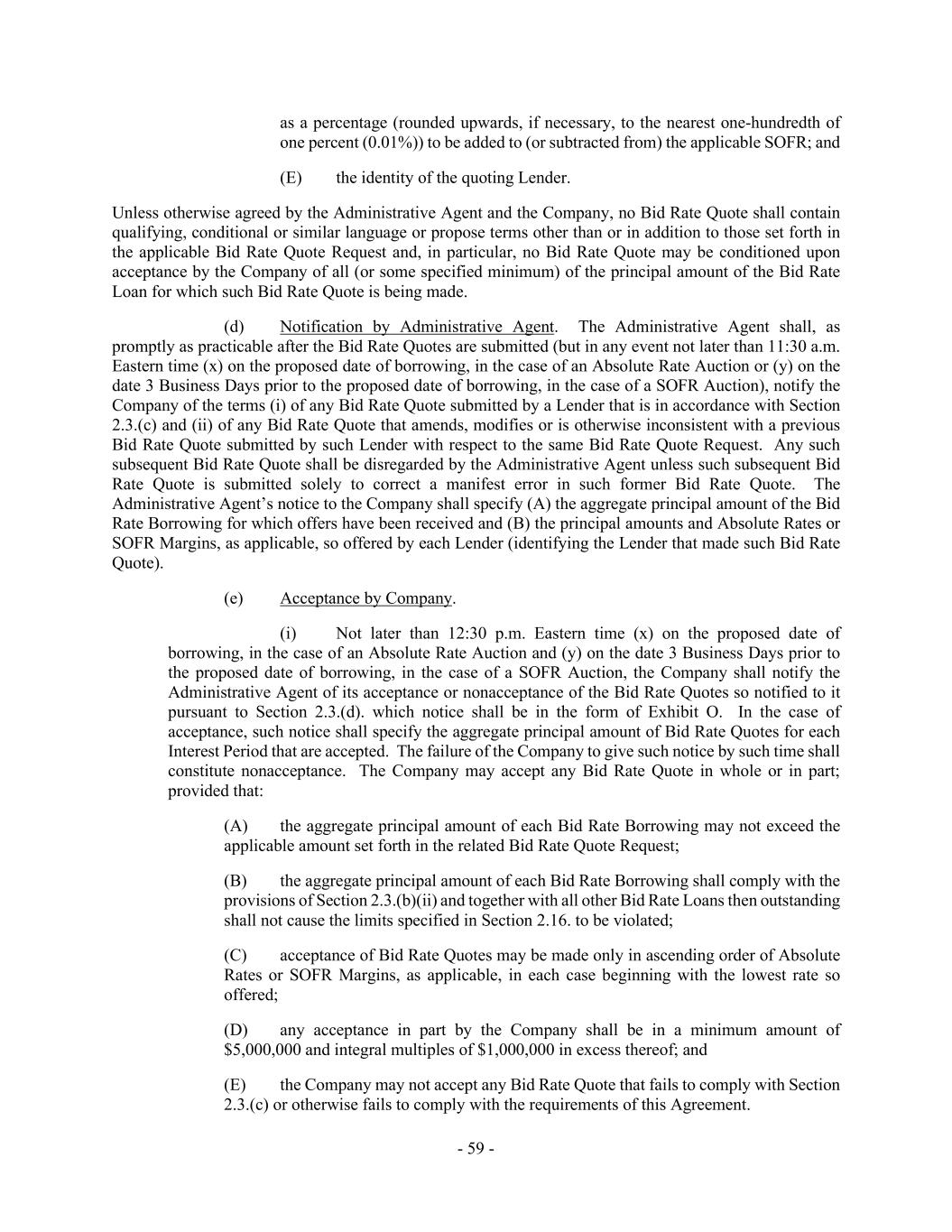 - 59 - as a percentage (rounded upwards, if necessary, to the nearest one-hundredth of one percent (0.01%)) to be added to (or subtracted from) the applicable SOFR; and (E) the identity of the quoting Lender. Unless otherwise agreed by the Administrative Agent and the Company, no Bid Rate Quote shall contain qualifying, conditional or similar language or propose terms other than or in addition to those set forth in the applicable Bid Rate Quote Request and, in particular, no Bid Rate Quote may be conditioned upon acceptance by the Company of all (or some specified minimum) of the principal amount of the Bid Rate Loan for which such Bid Rate Quote is being made. (d) Notification by Administrative Agent. The Administrative Agent shall, as promptly as practicable after the Bid Rate Quotes are submitted (but in any event not later than 11:30 a.m. Eastern time (x) on the proposed date of borrowing, in the case of an Absolute Rate Auction or (y) on the date 3 Business Days prior to the proposed date of borrowing, in the case of a SOFR Auction), notify the Company of the terms (i) of any Bid Rate Quote submitted by a Lender that is in accordance with Section 2.3.(c) and (ii) of any Bid Rate Quote that amends, modifies or is otherwise inconsistent with a previous Bid Rate Quote submitted by such Lender with respect to the same Bid Rate Quote Request. Any such subsequent Bid Rate Quote shall be disregarded by the Administrative Agent unless such subsequent Bid Rate Quote is submitted solely to correct a manifest error in such former Bid Rate Quote. The Administrative Agent’s notice to the Company shall specify (A) the aggregate principal amount of the Bid Rate Borrowing for which offers have been received and (B) the principal amounts and Absolute Rates or SOFR Margins, as applicable, so offered by each Lender (identifying the Lender that made such Bid Rate Quote). (e) Acceptance by Company. (i) Not later than 12:30 p.m. Eastern time (x) on the proposed date of borrowing, in the case of an Absolute Rate Auction and (y) on the date 3 Business Days prior to the proposed date of borrowing, in the case of a SOFR Auction, the Company shall notify the Administrative Agent of its acceptance or nonacceptance of the Bid Rate Quotes so notified to it pursuant to Section 2.3.(d). which notice shall be in the form of Exhibit O. In the case of acceptance, such notice shall specify the aggregate principal amount of Bid Rate Quotes for each Interest Period that are accepted. The failure of the Company to give such notice by such time shall constitute nonacceptance. The Company may accept any Bid Rate Quote in whole or in part; provided that: (A) the aggregate principal amount of each Bid Rate Borrowing may not exceed the applicable amount set forth in the related Bid Rate Quote Request; (B) the aggregate principal amount of each Bid Rate Borrowing shall comply with the provisions of Section 2.3.(b)(ii) and together with all other Bid Rate Loans then outstanding shall not cause the limits specified in Section 2.16. to be violated; (C) acceptance of Bid Rate Quotes may be made only in ascending order of Absolute Rates or SOFR Margins, as applicable, in each case beginning with the lowest rate so offered; (D) any acceptance in part by the Company shall be in a minimum amount of $5,000,000 and integral multiples of $1,000,000 in excess thereof; and (E) the Company may not accept any Bid Rate Quote that fails to comply with Section 2.3.(c) or otherwise fails to comply with the requirements of this Agreement.