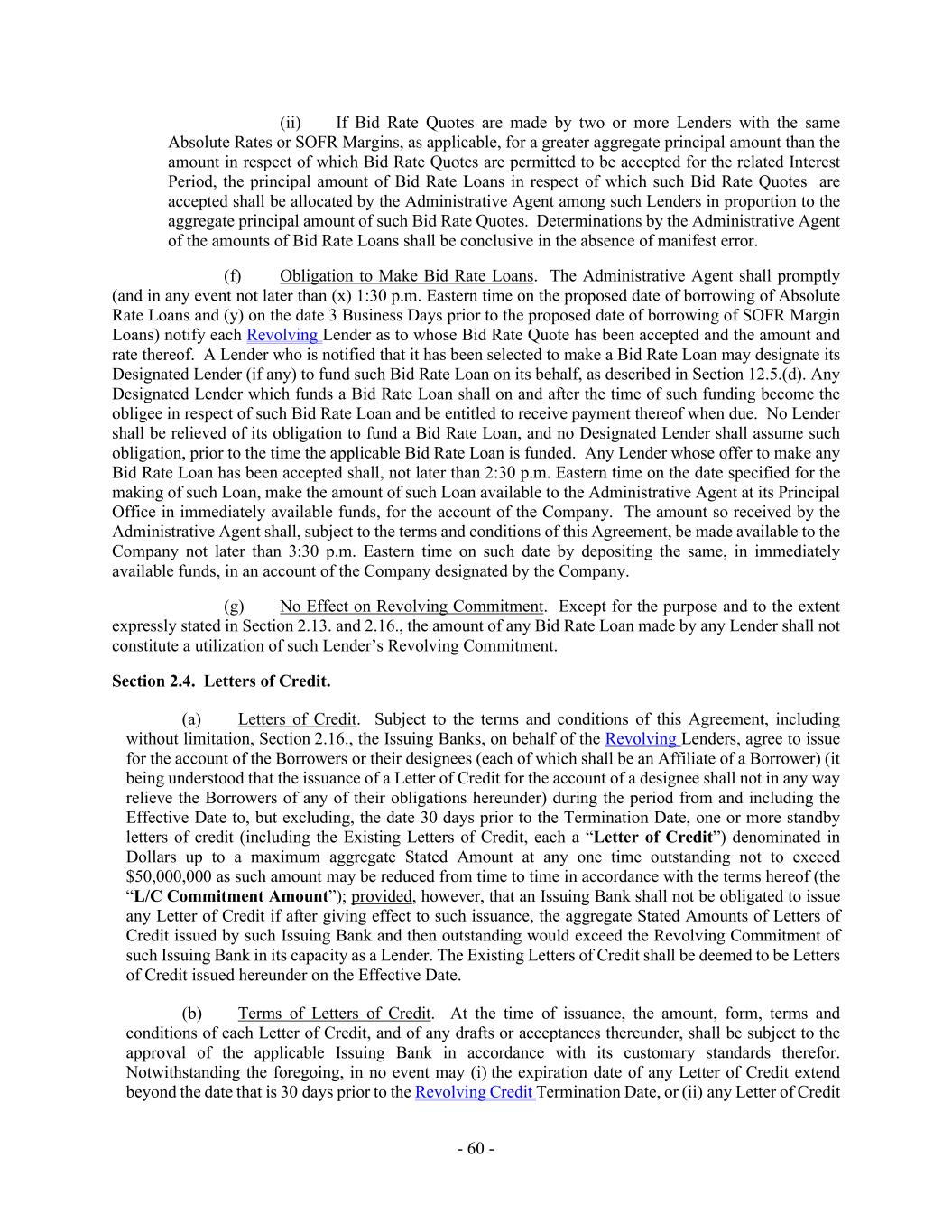 - 60 - (ii) If Bid Rate Quotes are made by two or more Lenders with the same Absolute Rates or SOFR Margins, as applicable, for a greater aggregate principal amount than the amount in respect of which Bid Rate Quotes are permitted to be accepted for the related Interest Period, the principal amount of Bid Rate Loans in respect of which such Bid Rate Quotes are accepted shall be allocated by the Administrative Agent among such Lenders in proportion to the aggregate principal amount of such Bid Rate Quotes. Determinations by the Administrative Agent of the amounts of Bid Rate Loans shall be conclusive in the absence of manifest error. (f) Obligation to Make Bid Rate Loans. The Administrative Agent shall promptly (and in any event not later than (x) 1:30 p.m. Eastern time on the proposed date of borrowing of Absolute Rate Loans and (y) on the date 3 Business Days prior to the proposed date of borrowing of SOFR Margin Loans) notify each Revolving Lender as to whose Bid Rate Quote has been accepted and the amount and rate thereof. A Lender who is notified that it has been selected to make a Bid Rate Loan may designate its Designated Lender (if any) to fund such Bid Rate Loan on its behalf, as described in Section 12.5.(d). Any Designated Lender which funds a Bid Rate Loan shall on and after the time of such funding become the obligee in respect of such Bid Rate Loan and be entitled to receive payment thereof when due. No Lender shall be relieved of its obligation to fund a Bid Rate Loan, and no Designated Lender shall assume such obligation, prior to the time the applicable Bid Rate Loan is funded. Any Lender whose offer to make any Bid Rate Loan has been accepted shall, not later than 2:30 p.m. Eastern time on the date specified for the making of such Loan, make the amount of such Loan available to the Administrative Agent at its Principal Office in immediately available funds, for the account of the Company. The amount so received by the Administrative Agent shall, subject to the terms and conditions of this Agreement, be made available to the Company not later than 3:30 p.m. Eastern time on such date by depositing the same, in immediately available funds, in an account of the Company designated by the Company. (g) No Effect on Revolving Commitment. Except for the purpose and to the extent expressly stated in Section 2.13. and 2.16., the amount of any Bid Rate Loan made by any Lender shall not constitute a utilization of such Lender’s Revolving Commitment. Section 2.4. Letters of Credit. (a) Letters of Credit. Subject to the terms and conditions of this Agreement, including without limitation, Section 2.16., the Issuing Banks, on behalf of the Revolving Lenders, agree to issue for the account of the Borrowers or their designees (each of which shall be an Affiliate of a Borrower) (it being understood that the issuance of a Letter of Credit for the account of a designee shall not in any way relieve the Borrowers of any of their obligations hereunder) during the period from and including the Effective Date to, but excluding, the date 30 days prior to the Termination Date, one or more standby letters of credit (including the Existing Letters of Credit, each a “Letter of Credit”) denominated in Dollars up to a maximum aggregate Stated Amount at any one time outstanding not to exceed $50,000,000 as such amount may be reduced from time to time in accordance with the terms hereof (the “L/C Commitment Amount”); provided, however, that an Issuing Bank shall not be obligated to issue any Letter of Credit if after giving effect to such issuance, the aggregate Stated Amounts of Letters of Credit issued by such Issuing Bank and then outstanding would exceed the Revolving Commitment of such Issuing Bank in its capacity as a Lender. The Existing Letters of Credit shall be deemed to be Letters of Credit issued hereunder on the Effective Date. (b) Terms of Letters of Credit. At the time of issuance, the amount, form, terms and conditions of each Letter of Credit, and of any drafts or acceptances thereunder, shall be subject to the approval of the applicable Issuing Bank in accordance with its customary standards therefor. Notwithstanding the foregoing, in no event may (i) the expiration date of any Letter of Credit extend beyond the date that is 30 days prior to the Revolving Credit Termination Date, or (ii) any Letter of Credit