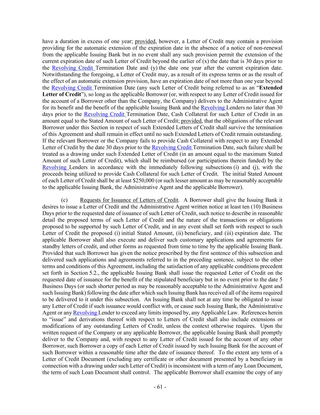 - 61 - have a duration in excess of one year; provided, however, a Letter of Credit may contain a provision providing for the automatic extension of the expiration date in the absence of a notice of non-renewal from the applicable Issuing Bank but in no event shall any such provision permit the extension of the current expiration date of such Letter of Credit beyond the earlier of (x) the date that is 30 days prior to the Revolving Credit Termination Date and (y) the date one year after the current expiration date. Notwithstanding the foregoing, a Letter of Credit may, as a result of its express terms or as the result of the effect of an automatic extension provision, have an expiration date of not more than one year beyond the Revolving Credit Termination Date (any such Letter of Credit being referred to as an “Extended Letter of Credit”), so long as the applicable Borrower (or, with respect to any Letter of Credit issued for the account of a Borrower other than the Company, the Company) delivers to the Administrative Agent for its benefit and the benefit of the applicable Issuing Bank and the Revolving Lenders no later than 30 days prior to the Revolving Credit Termination Date, Cash Collateral for such Letter of Credit in an amount equal to the Stated Amount of such Letter of Credit; provided, that the obligations of the relevant Borrower under this Section in respect of such Extended Letters of Credit shall survive the termination of this Agreement and shall remain in effect until no such Extended Letters of Credit remain outstanding. If the relevant Borrower or the Company fails to provide Cash Collateral with respect to any Extended Letter of Credit by the date 30 days prior to the Revolving Credit Termination Date, such failure shall be treated as a drawing under such Extended Letter of Credit (in an amount equal to the maximum Stated Amount of such Letter of Credit), which shall be reimbursed (or participations therein funded) by the Revolving Lenders in accordance with the immediately following subsections (i) and (j), with the proceeds being utilized to provide Cash Collateral for such Letter of Credit. The initial Stated Amount of each Letter of Credit shall be at least $250,000 (or such lesser amount as may be reasonably acceptable to the applicable Issuing Bank, the Administrative Agent and the applicable Borrower). (c) Requests for Issuance of Letters of Credit. A Borrower shall give the Issuing Bank it desires to issue a Letter of Credit and the Administrative Agent written notice at least ten (10) Business Days prior to the requested date of issuance of such Letter of Credit, such notice to describe in reasonable detail the proposed terms of such Letter of Credit and the nature of the transactions or obligations proposed to be supported by such Letter of Credit, and in any event shall set forth with respect to such Letter of Credit the proposed (i) initial Stated Amount, (ii) beneficiary, and (iii) expiration date. The applicable Borrower shall also execute and deliver such customary applications and agreements for standby letters of credit, and other forms as requested from time to time by the applicable Issuing Bank. Provided that such Borrower has given the notice prescribed by the first sentence of this subsection and delivered such applications and agreements referred to in the preceding sentence, subject to the other terms and conditions of this Agreement, including the satisfaction of any applicable conditions precedent set forth in Section 5.2., the applicable Issuing Bank shall issue the requested Letter of Credit on the requested date of issuance for the benefit of the stipulated beneficiary but in no event prior to the date 5 Business Days (or such shorter period as may be reasonably acceptable to the Administrative Agent and such Issuing Bank) following the date after which such Issuing Bank has received all of the items required to be delivered to it under this subsection. An Issuing Bank shall not at any time be obligated to issue any Letter of Credit if such issuance would conflict with, or cause such Issuing Bank, the Administrative Agent or any Revolving Lender to exceed any limits imposed by, any Applicable Law. References herein to “issue” and derivations thereof with respect to Letters of Credit shall also include extensions or modifications of any outstanding Letters of Credit, unless the context otherwise requires. Upon the written request of the Company or any applicable Borrower, the applicable Issuing Bank shall promptly deliver to the Company and, with respect to any Letter of Credit issued for the account of any other Borrower, such Borrower a copy of each Letter of Credit issued by such Issuing Bank for the account of such Borrower within a reasonable time after the date of issuance thereof. To the extent any term of a Letter of Credit Document (excluding any certificate or other document presented by a beneficiary in connection with a drawing under such Letter of Credit) is inconsistent with a term of any Loan Document, the term of such Loan Document shall control. The applicable Borrower shall examine the copy of any
