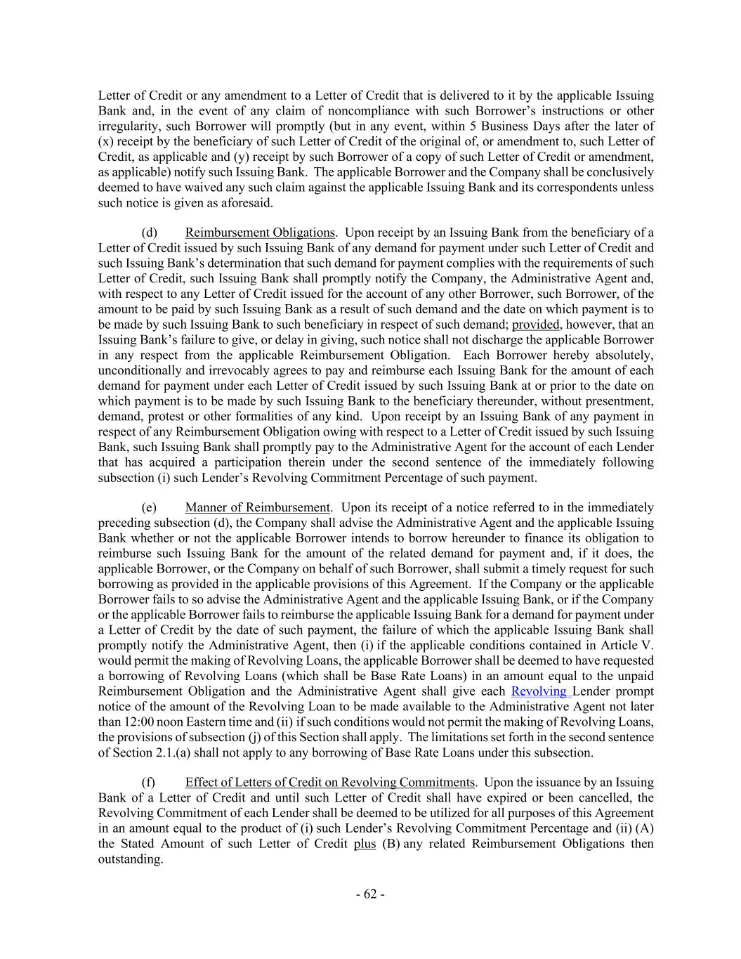 - 62 - Letter of Credit or any amendment to a Letter of Credit that is delivered to it by the applicable Issuing Bank and, in the event of any claim of noncompliance with such Borrower’s instructions or other irregularity, such Borrower will promptly (but in any event, within 5 Business Days after the later of (x) receipt by the beneficiary of such Letter of Credit of the original of, or amendment to, such Letter of Credit, as applicable and (y) receipt by such Borrower of a copy of such Letter of Credit or amendment, as applicable) notify such Issuing Bank. The applicable Borrower and the Company shall be conclusively deemed to have waived any such claim against the applicable Issuing Bank and its correspondents unless such notice is given as aforesaid. (d) Reimbursement Obligations. Upon receipt by an Issuing Bank from the beneficiary of a Letter of Credit issued by such Issuing Bank of any demand for payment under such Letter of Credit and such Issuing Bank’s determination that such demand for payment complies with the requirements of such Letter of Credit, such Issuing Bank shall promptly notify the Company, the Administrative Agent and, with respect to any Letter of Credit issued for the account of any other Borrower, such Borrower, of the amount to be paid by such Issuing Bank as a result of such demand and the date on which payment is to be made by such Issuing Bank to such beneficiary in respect of such demand; provided, however, that an Issuing Bank’s failure to give, or delay in giving, such notice shall not discharge the applicable Borrower in any respect from the applicable Reimbursement Obligation. Each Borrower hereby absolutely, unconditionally and irrevocably agrees to pay and reimburse each Issuing Bank for the amount of each demand for payment under each Letter of Credit issued by such Issuing Bank at or prior to the date on which payment is to be made by such Issuing Bank to the beneficiary thereunder, without presentment, demand, protest or other formalities of any kind. Upon receipt by an Issuing Bank of any payment in respect of any Reimbursement Obligation owing with respect to a Letter of Credit issued by such Issuing Bank, such Issuing Bank shall promptly pay to the Administrative Agent for the account of each Lender that has acquired a participation therein under the second sentence of the immediately following subsection (i) such Lender’s Revolving Commitment Percentage of such payment. (e) Manner of Reimbursement. Upon its receipt of a notice referred to in the immediately preceding subsection (d), the Company shall advise the Administrative Agent and the applicable Issuing Bank whether or not the applicable Borrower intends to borrow hereunder to finance its obligation to reimburse such Issuing Bank for the amount of the related demand for payment and, if it does, the applicable Borrower, or the Company on behalf of such Borrower, shall submit a timely request for such borrowing as provided in the applicable provisions of this Agreement. If the Company or the applicable Borrower fails to so advise the Administrative Agent and the applicable Issuing Bank, or if the Company or the applicable Borrower fails to reimburse the applicable Issuing Bank for a demand for payment under a Letter of Credit by the date of such payment, the failure of which the applicable Issuing Bank shall promptly notify the Administrative Agent, then (i) if the applicable conditions contained in Article V. would permit the making of Revolving Loans, the applicable Borrower shall be deemed to have requested a borrowing of Revolving Loans (which shall be Base Rate Loans) in an amount equal to the unpaid Reimbursement Obligation and the Administrative Agent shall give each Revolving Lender prompt notice of the amount of the Revolving Loan to be made available to the Administrative Agent not later than 12:00 noon Eastern time and (ii) if such conditions would not permit the making of Revolving Loans, the provisions of subsection (j) of this Section shall apply. The limitations set forth in the second sentence of Section 2.1.(a) shall not apply to any borrowing of Base Rate Loans under this subsection. (f) Effect of Letters of Credit on Revolving Commitments. Upon the issuance by an Issuing Bank of a Letter of Credit and until such Letter of Credit shall have expired or been cancelled, the Revolving Commitment of each Lender shall be deemed to be utilized for all purposes of this Agreement in an amount equal to the product of (i) such Lender’s Revolving Commitment Percentage and (ii) (A) the Stated Amount of such Letter of Credit plus (B) any related Reimbursement Obligations then outstanding.