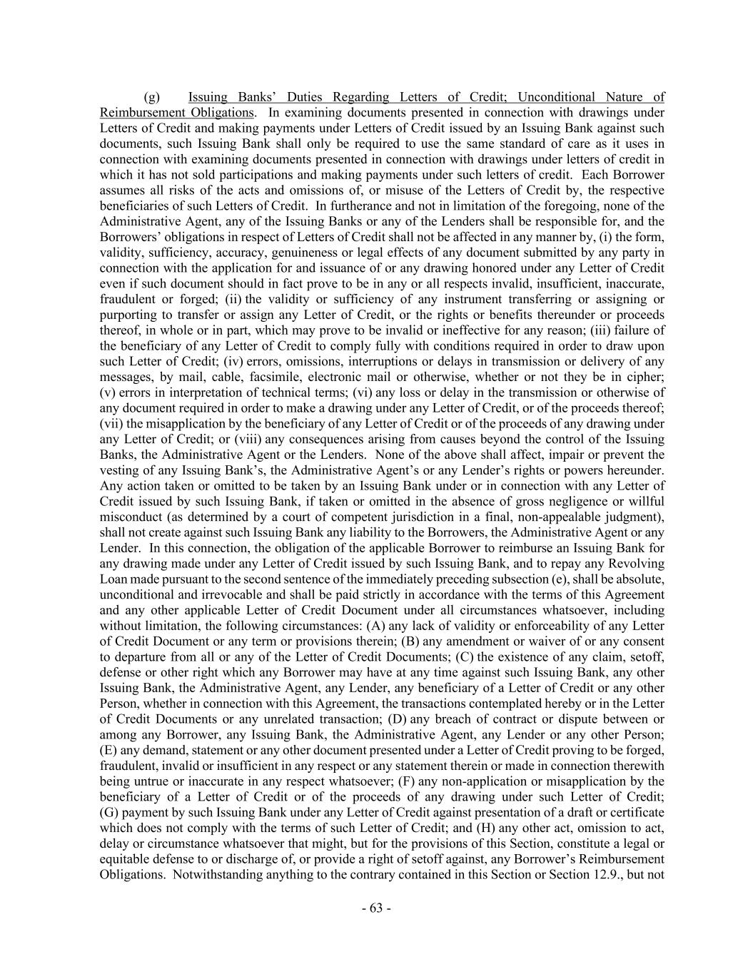 - 63 - (g) Issuing Banks’ Duties Regarding Letters of Credit; Unconditional Nature of Reimbursement Obligations. In examining documents presented in connection with drawings under Letters of Credit and making payments under Letters of Credit issued by an Issuing Bank against such documents, such Issuing Bank shall only be required to use the same standard of care as it uses in connection with examining documents presented in connection with drawings under letters of credit in which it has not sold participations and making payments under such letters of credit. Each Borrower assumes all risks of the acts and omissions of, or misuse of the Letters of Credit by, the respective beneficiaries of such Letters of Credit. In furtherance and not in limitation of the foregoing, none of the Administrative Agent, any of the Issuing Banks or any of the Lenders shall be responsible for, and the Borrowers’ obligations in respect of Letters of Credit shall not be affected in any manner by, (i) the form, validity, sufficiency, accuracy, genuineness or legal effects of any document submitted by any party in connection with the application for and issuance of or any drawing honored under any Letter of Credit even if such document should in fact prove to be in any or all respects invalid, insufficient, inaccurate, fraudulent or forged; (ii) the validity or sufficiency of any instrument transferring or assigning or purporting to transfer or assign any Letter of Credit, or the rights or benefits thereunder or proceeds thereof, in whole or in part, which may prove to be invalid or ineffective for any reason; (iii) failure of the beneficiary of any Letter of Credit to comply fully with conditions required in order to draw upon such Letter of Credit; (iv) errors, omissions, interruptions or delays in transmission or delivery of any messages, by mail, cable, facsimile, electronic mail or otherwise, whether or not they be in cipher; (v) errors in interpretation of technical terms; (vi) any loss or delay in the transmission or otherwise of any document required in order to make a drawing under any Letter of Credit, or of the proceeds thereof; (vii) the misapplication by the beneficiary of any Letter of Credit or of the proceeds of any drawing under any Letter of Credit; or (viii) any consequences arising from causes beyond the control of the Issuing Banks, the Administrative Agent or the Lenders. None of the above shall affect, impair or prevent the vesting of any Issuing Bank’s, the Administrative Agent’s or any Lender’s rights or powers hereunder. Any action taken or omitted to be taken by an Issuing Bank under or in connection with any Letter of Credit issued by such Issuing Bank, if taken or omitted in the absence of gross negligence or willful misconduct (as determined by a court of competent jurisdiction in a final, non-appealable judgment), shall not create against such Issuing Bank any liability to the Borrowers, the Administrative Agent or any Lender. In this connection, the obligation of the applicable Borrower to reimburse an Issuing Bank for any drawing made under any Letter of Credit issued by such Issuing Bank, and to repay any Revolving Loan made pursuant to the second sentence of the immediately preceding subsection (e), shall be absolute, unconditional and irrevocable and shall be paid strictly in accordance with the terms of this Agreement and any other applicable Letter of Credit Document under all circumstances whatsoever, including without limitation, the following circumstances: (A) any lack of validity or enforceability of any Letter of Credit Document or any term or provisions therein; (B) any amendment or waiver of or any consent to departure from all or any of the Letter of Credit Documents; (C) the existence of any claim, setoff, defense or other right which any Borrower may have at any time against such Issuing Bank, any other Issuing Bank, the Administrative Agent, any Lender, any beneficiary of a Letter of Credit or any other Person, whether in connection with this Agreement, the transactions contemplated hereby or in the Letter of Credit Documents or any unrelated transaction; (D) any breach of contract or dispute between or among any Borrower, any Issuing Bank, the Administrative Agent, any Lender or any other Person; (E) any demand, statement or any other document presented under a Letter of Credit proving to be forged, fraudulent, invalid or insufficient in any respect or any statement therein or made in connection therewith being untrue or inaccurate in any respect whatsoever; (F) any non-application or misapplication by the beneficiary of a Letter of Credit or of the proceeds of any drawing under such Letter of Credit; (G) payment by such Issuing Bank under any Letter of Credit against presentation of a draft or certificate which does not comply with the terms of such Letter of Credit; and (H) any other act, omission to act, delay or circumstance whatsoever that might, but for the provisions of this Section, constitute a legal or equitable defense to or discharge of, or provide a right of setoff against, any Borrower’s Reimbursement Obligations. Notwithstanding anything to the contrary contained in this Section or Section 12.9., but not