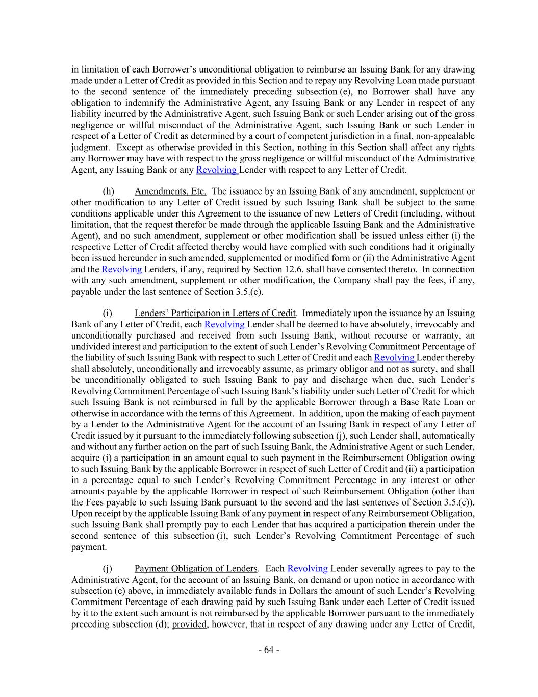 - 64 - in limitation of each Borrower’s unconditional obligation to reimburse an Issuing Bank for any drawing made under a Letter of Credit as provided in this Section and to repay any Revolving Loan made pursuant to the second sentence of the immediately preceding subsection (e), no Borrower shall have any obligation to indemnify the Administrative Agent, any Issuing Bank or any Lender in respect of any liability incurred by the Administrative Agent, such Issuing Bank or such Lender arising out of the gross negligence or willful misconduct of the Administrative Agent, such Issuing Bank or such Lender in respect of a Letter of Credit as determined by a court of competent jurisdiction in a final, non-appealable judgment. Except as otherwise provided in this Section, nothing in this Section shall affect any rights any Borrower may have with respect to the gross negligence or willful misconduct of the Administrative Agent, any Issuing Bank or any Revolving Lender with respect to any Letter of Credit. (h) Amendments, Etc. The issuance by an Issuing Bank of any amendment, supplement or other modification to any Letter of Credit issued by such Issuing Bank shall be subject to the same conditions applicable under this Agreement to the issuance of new Letters of Credit (including, without limitation, that the request therefor be made through the applicable Issuing Bank and the Administrative Agent), and no such amendment, supplement or other modification shall be issued unless either (i) the respective Letter of Credit affected thereby would have complied with such conditions had it originally been issued hereunder in such amended, supplemented or modified form or (ii) the Administrative Agent and the Revolving Lenders, if any, required by Section 12.6. shall have consented thereto. In connection with any such amendment, supplement or other modification, the Company shall pay the fees, if any, payable under the last sentence of Section 3.5.(c). (i) Lenders’ Participation in Letters of Credit. Immediately upon the issuance by an Issuing Bank of any Letter of Credit, each Revolving Lender shall be deemed to have absolutely, irrevocably and unconditionally purchased and received from such Issuing Bank, without recourse or warranty, an undivided interest and participation to the extent of such Lender’s Revolving Commitment Percentage of the liability of such Issuing Bank with respect to such Letter of Credit and each Revolving Lender thereby shall absolutely, unconditionally and irrevocably assume, as primary obligor and not as surety, and shall be unconditionally obligated to such Issuing Bank to pay and discharge when due, such Lender’s Revolving Commitment Percentage of such Issuing Bank’s liability under such Letter of Credit for which such Issuing Bank is not reimbursed in full by the applicable Borrower through a Base Rate Loan or otherwise in accordance with the terms of this Agreement. In addition, upon the making of each payment by a Lender to the Administrative Agent for the account of an Issuing Bank in respect of any Letter of Credit issued by it pursuant to the immediately following subsection (j), such Lender shall, automatically and without any further action on the part of such Issuing Bank, the Administrative Agent or such Lender, acquire (i) a participation in an amount equal to such payment in the Reimbursement Obligation owing to such Issuing Bank by the applicable Borrower in respect of such Letter of Credit and (ii) a participation in a percentage equal to such Lender’s Revolving Commitment Percentage in any interest or other amounts payable by the applicable Borrower in respect of such Reimbursement Obligation (other than the Fees payable to such Issuing Bank pursuant to the second and the last sentences of Section 3.5.(c)). Upon receipt by the applicable Issuing Bank of any payment in respect of any Reimbursement Obligation, such Issuing Bank shall promptly pay to each Lender that has acquired a participation therein under the second sentence of this subsection (i), such Lender’s Revolving Commitment Percentage of such payment. (j) Payment Obligation of Lenders. Each Revolving Lender severally agrees to pay to the Administrative Agent, for the account of an Issuing Bank, on demand or upon notice in accordance with subsection (e) above, in immediately available funds in Dollars the amount of such Lender’s Revolving Commitment Percentage of each drawing paid by such Issuing Bank under each Letter of Credit issued by it to the extent such amount is not reimbursed by the applicable Borrower pursuant to the immediately preceding subsection (d); provided, however, that in respect of any drawing under any Letter of Credit,