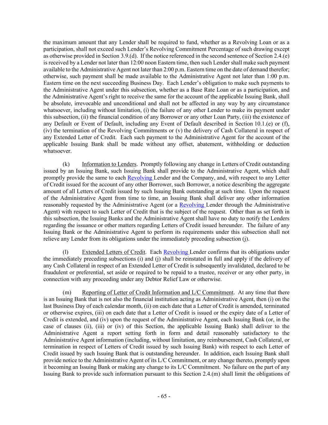 - 65 - the maximum amount that any Lender shall be required to fund, whether as a Revolving Loan or as a participation, shall not exceed such Lender’s Revolving Commitment Percentage of such drawing except as otherwise provided in Section 3.9.(d). If the notice referenced in the second sentence of Section 2.4.(e) is received by a Lender not later than 12:00 noon Eastern time, then such Lender shall make such payment available to the Administrative Agent not later than 2:00 p.m. Eastern time on the date of demand therefor; otherwise, such payment shall be made available to the Administrative Agent not later than 1:00 p.m. Eastern time on the next succeeding Business Day. Each Lender’s obligation to make such payments to the Administrative Agent under this subsection, whether as a Base Rate Loan or as a participation, and the Administrative Agent’s right to receive the same for the account of the applicable Issuing Bank, shall be absolute, irrevocable and unconditional and shall not be affected in any way by any circumstance whatsoever, including without limitation, (i) the failure of any other Lender to make its payment under this subsection, (ii) the financial condition of any Borrower or any other Loan Party, (iii) the existence of any Default or Event of Default, including any Event of Default described in Section 10.1.(e) or (f), (iv) the termination of the Revolving Commitments or (v) the delivery of Cash Collateral in respect of any Extended Letter of Credit. Each such payment to the Administrative Agent for the account of the applicable Issuing Bank shall be made without any offset, abatement, withholding or deduction whatsoever. (k) Information to Lenders. Promptly following any change in Letters of Credit outstanding issued by an Issuing Bank, such Issuing Bank shall provide to the Administrative Agent, which shall promptly provide the same to each Revolving Lender and the Company, and, with respect to any Letter of Credit issued for the account of any other Borrower, such Borrower, a notice describing the aggregate amount of all Letters of Credit issued by such Issuing Bank outstanding at such time. Upon the request of the Administrative Agent from time to time, an Issuing Bank shall deliver any other information reasonably requested by the Administrative Agent (or a Revolving Lender through the Administrative Agent) with respect to such Letter of Credit that is the subject of the request. Other than as set forth in this subsection, the Issuing Banks and the Administrative Agent shall have no duty to notify the Lenders regarding the issuance or other matters regarding Letters of Credit issued hereunder. The failure of any Issuing Bank or the Administrative Agent to perform its requirements under this subsection shall not relieve any Lender from its obligations under the immediately preceding subsection (j). (l) Extended Letters of Credit. Each Revolving Lender confirms that its obligations under the immediately preceding subsections (i) and (j) shall be reinstated in full and apply if the delivery of any Cash Collateral in respect of an Extended Letter of Credit is subsequently invalidated, declared to be fraudulent or preferential, set aside or required to be repaid to a trustee, receiver or any other party, in connection with any proceeding under any Debtor Relief Law or otherwise. (m) Reporting of Letter of Credit Information and L/C Commitment. At any time that there is an Issuing Bank that is not also the financial institution acting as Administrative Agent, then (i) on the last Business Day of each calendar month, (ii) on each date that a Letter of Credit is amended, terminated or otherwise expires, (iii) on each date that a Letter of Credit is issued or the expiry date of a Letter of Credit is extended, and (iv) upon the request of the Administrative Agent, each Issuing Bank (or, in the case of clauses (ii), (iii) or (iv) of this Section, the applicable Issuing Bank) shall deliver to the Administrative Agent a report setting forth in form and detail reasonably satisfactory to the Administrative Agent information (including, without limitation, any reimbursement, Cash Collateral, or termination in respect of Letters of Credit issued by such Issuing Bank) with respect to each Letter of Credit issued by such Issuing Bank that is outstanding hereunder. In addition, each Issuing Bank shall provide notice to the Administrative Agent of its L/C Commitment, or any change thereto, promptly upon it becoming an Issuing Bank or making any change to its L/C Commitment. No failure on the part of any Issuing Bank to provide such information pursuant to this Section 2.4.(m) shall limit the obligations of