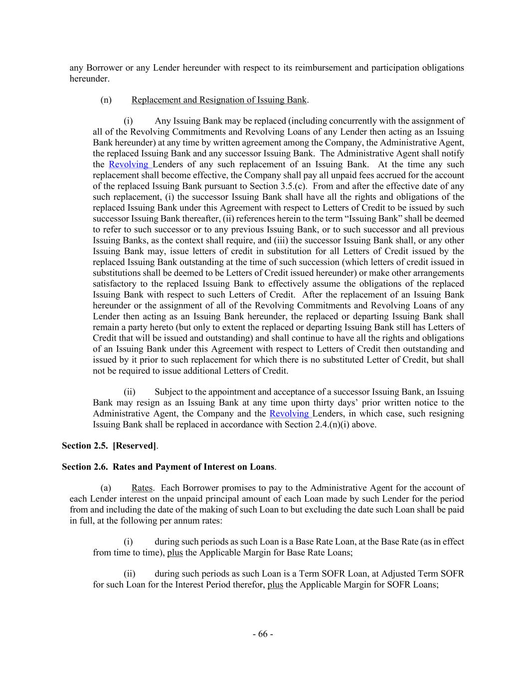 - 66 - any Borrower or any Lender hereunder with respect to its reimbursement and participation obligations hereunder. (n) Replacement and Resignation of Issuing Bank. (i) Any Issuing Bank may be replaced (including concurrently with the assignment of all of the Revolving Commitments and Revolving Loans of any Lender then acting as an Issuing Bank hereunder) at any time by written agreement among the Company, the Administrative Agent, the replaced Issuing Bank and any successor Issuing Bank. The Administrative Agent shall notify the Revolving Lenders of any such replacement of an Issuing Bank. At the time any such replacement shall become effective, the Company shall pay all unpaid fees accrued for the account of the replaced Issuing Bank pursuant to Section 3.5.(c). From and after the effective date of any such replacement, (i) the successor Issuing Bank shall have all the rights and obligations of the replaced Issuing Bank under this Agreement with respect to Letters of Credit to be issued by such successor Issuing Bank thereafter, (ii) references herein to the term “Issuing Bank” shall be deemed to refer to such successor or to any previous Issuing Bank, or to such successor and all previous Issuing Banks, as the context shall require, and (iii) the successor Issuing Bank shall, or any other Issuing Bank may, issue letters of credit in substitution for all Letters of Credit issued by the replaced Issuing Bank outstanding at the time of such succession (which letters of credit issued in substitutions shall be deemed to be Letters of Credit issued hereunder) or make other arrangements satisfactory to the replaced Issuing Bank to effectively assume the obligations of the replaced Issuing Bank with respect to such Letters of Credit. After the replacement of an Issuing Bank hereunder or the assignment of all of the Revolving Commitments and Revolving Loans of any Lender then acting as an Issuing Bank hereunder, the replaced or departing Issuing Bank shall remain a party hereto (but only to extent the replaced or departing Issuing Bank still has Letters of Credit that will be issued and outstanding) and shall continue to have all the rights and obligations of an Issuing Bank under this Agreement with respect to Letters of Credit then outstanding and issued by it prior to such replacement for which there is no substituted Letter of Credit, but shall not be required to issue additional Letters of Credit. (ii) Subject to the appointment and acceptance of a successor Issuing Bank, an Issuing Bank may resign as an Issuing Bank at any time upon thirty days’ prior written notice to the Administrative Agent, the Company and the Revolving Lenders, in which case, such resigning Issuing Bank shall be replaced in accordance with Section 2.4.(n)(i) above. Section 2.5. [Reserved]. Section 2.6. Rates and Payment of Interest on Loans. (a) Rates. Each Borrower promises to pay to the Administrative Agent for the account of each Lender interest on the unpaid principal amount of each Loan made by such Lender for the period from and including the date of the making of such Loan to but excluding the date such Loan shall be paid in full, at the following per annum rates: (i) during such periods as such Loan is a Base Rate Loan, at the Base Rate (as in effect from time to time), plus the Applicable Margin for Base Rate Loans; (ii) during such periods as such Loan is a Term SOFR Loan, at Adjusted Term SOFR for such Loan for the Interest Period therefor, plus the Applicable Margin for SOFR Loans;