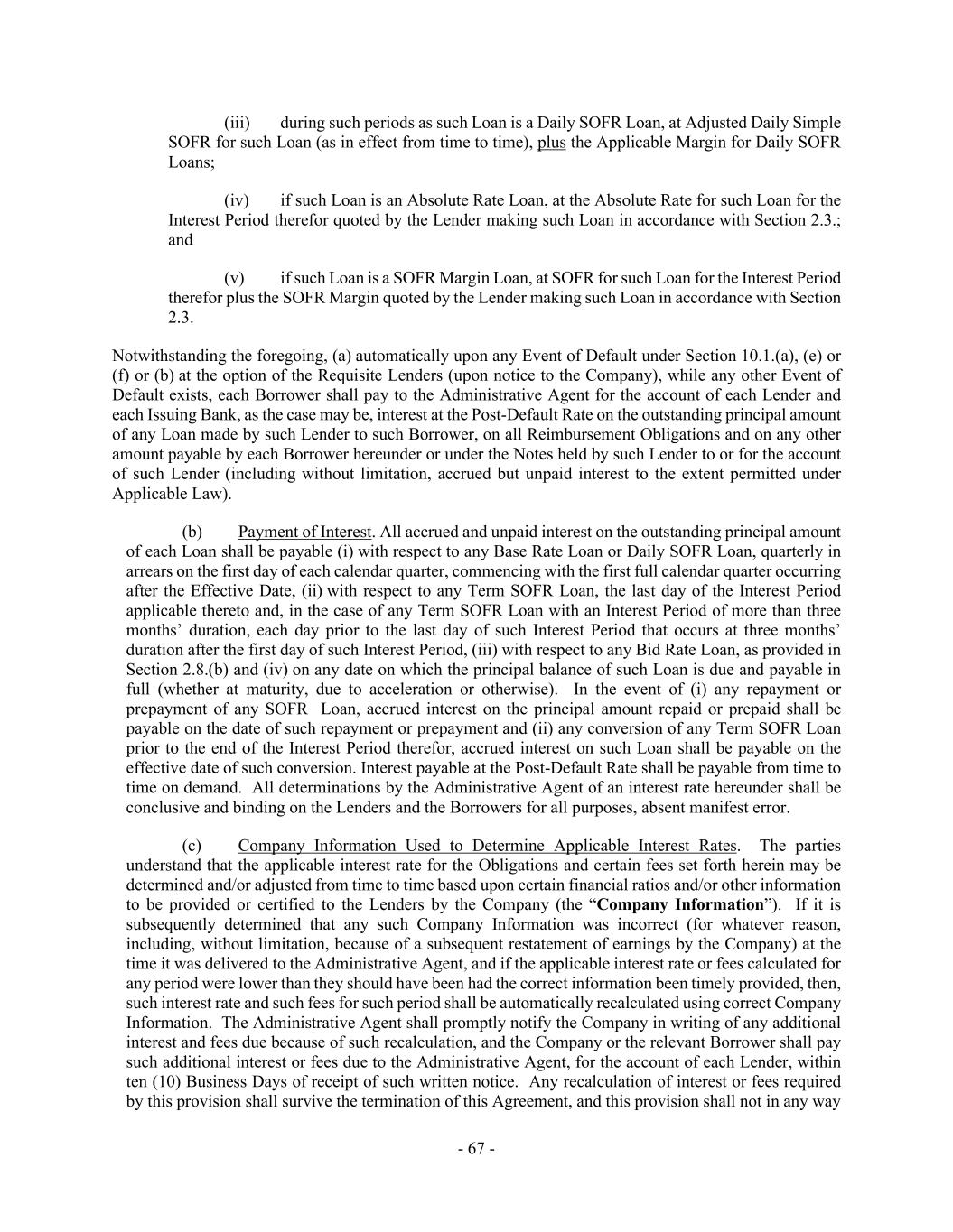 - 67 - (iii) during such periods as such Loan is a Daily SOFR Loan, at Adjusted Daily Simple SOFR for such Loan (as in effect from time to time), plus the Applicable Margin for Daily SOFR Loans; (iv) if such Loan is an Absolute Rate Loan, at the Absolute Rate for such Loan for the Interest Period therefor quoted by the Lender making such Loan in accordance with Section 2.3.; and (v) if such Loan is a SOFR Margin Loan, at SOFR for such Loan for the Interest Period therefor plus the SOFR Margin quoted by the Lender making such Loan in accordance with Section 2.3. Notwithstanding the foregoing, (a) automatically upon any Event of Default under Section 10.1.(a), (e) or (f) or (b) at the option of the Requisite Lenders (upon notice to the Company), while any other Event of Default exists, each Borrower shall pay to the Administrative Agent for the account of each Lender and each Issuing Bank, as the case may be, interest at the Post-Default Rate on the outstanding principal amount of any Loan made by such Lender to such Borrower, on all Reimbursement Obligations and on any other amount payable by each Borrower hereunder or under the Notes held by such Lender to or for the account of such Lender (including without limitation, accrued but unpaid interest to the extent permitted under Applicable Law). (b) Payment of Interest. All accrued and unpaid interest on the outstanding principal amount of each Loan shall be payable (i) with respect to any Base Rate Loan or Daily SOFR Loan, quarterly in arrears on the first day of each calendar quarter, commencing with the first full calendar quarter occurring after the Effective Date, (ii) with respect to any Term SOFR Loan, the last day of the Interest Period applicable thereto and, in the case of any Term SOFR Loan with an Interest Period of more than three months’ duration, each day prior to the last day of such Interest Period that occurs at three months’ duration after the first day of such Interest Period, (iii) with respect to any Bid Rate Loan, as provided in Section 2.8.(b) and (iv) on any date on which the principal balance of such Loan is due and payable in full (whether at maturity, due to acceleration or otherwise). In the event of (i) any repayment or prepayment of any SOFR Loan, accrued interest on the principal amount repaid or prepaid shall be payable on the date of such repayment or prepayment and (ii) any conversion of any Term SOFR Loan prior to the end of the Interest Period therefor, accrued interest on such Loan shall be payable on the effective date of such conversion. Interest payable at the Post-Default Rate shall be payable from time to time on demand. All determinations by the Administrative Agent of an interest rate hereunder shall be conclusive and binding on the Lenders and the Borrowers for all purposes, absent manifest error. (c) Company Information Used to Determine Applicable Interest Rates. The parties understand that the applicable interest rate for the Obligations and certain fees set forth herein may be determined and/or adjusted from time to time based upon certain financial ratios and/or other information to be provided or certified to the Lenders by the Company (the “Company Information”). If it is subsequently determined that any such Company Information was incorrect (for whatever reason, including, without limitation, because of a subsequent restatement of earnings by the Company) at the time it was delivered to the Administrative Agent, and if the applicable interest rate or fees calculated for any period were lower than they should have been had the correct information been timely provided, then, such interest rate and such fees for such period shall be automatically recalculated using correct Company Information. The Administrative Agent shall promptly notify the Company in writing of any additional interest and fees due because of such recalculation, and the Company or the relevant Borrower shall pay such additional interest or fees due to the Administrative Agent, for the account of each Lender, within ten (10) Business Days of receipt of such written notice. Any recalculation of interest or fees required by this provision shall survive the termination of this Agreement, and this provision shall not in any way