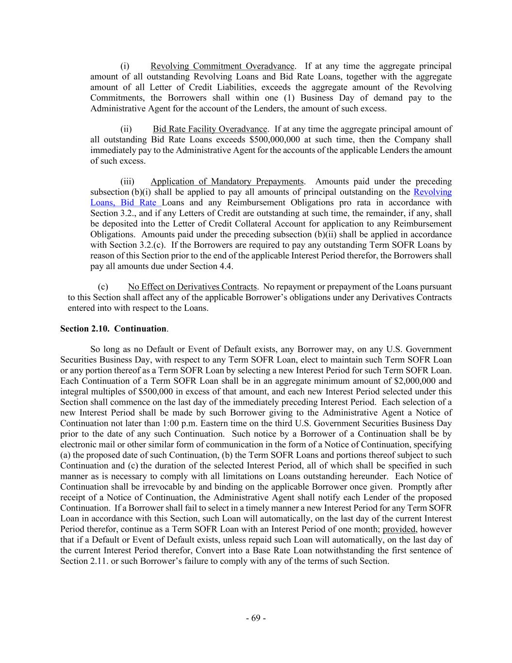 - 69 - (i) Revolving Commitment Overadvance. If at any time the aggregate principal amount of all outstanding Revolving Loans and Bid Rate Loans, together with the aggregate amount of all Letter of Credit Liabilities, exceeds the aggregate amount of the Revolving Commitments, the Borrowers shall within one (1) Business Day of demand pay to the Administrative Agent for the account of the Lenders, the amount of such excess. (ii) Bid Rate Facility Overadvance. If at any time the aggregate principal amount of all outstanding Bid Rate Loans exceeds $500,000,000 at such time, then the Company shall immediately pay to the Administrative Agent for the accounts of the applicable Lenders the amount of such excess. (iii) Application of Mandatory Prepayments. Amounts paid under the preceding subsection (b)(i) shall be applied to pay all amounts of principal outstanding on the Revolving Loans, Bid Rate Loans and any Reimbursement Obligations pro rata in accordance with Section 3.2., and if any Letters of Credit are outstanding at such time, the remainder, if any, shall be deposited into the Letter of Credit Collateral Account for application to any Reimbursement Obligations. Amounts paid under the preceding subsection (b)(ii) shall be applied in accordance with Section 3.2.(c). If the Borrowers are required to pay any outstanding Term SOFR Loans by reason of this Section prior to the end of the applicable Interest Period therefor, the Borrowers shall pay all amounts due under Section 4.4. (c) No Effect on Derivatives Contracts. No repayment or prepayment of the Loans pursuant to this Section shall affect any of the applicable Borrower’s obligations under any Derivatives Contracts entered into with respect to the Loans. Section 2.10. Continuation. So long as no Default or Event of Default exists, any Borrower may, on any U.S. Government Securities Business Day, with respect to any Term SOFR Loan, elect to maintain such Term SOFR Loan or any portion thereof as a Term SOFR Loan by selecting a new Interest Period for such Term SOFR Loan. Each Continuation of a Term SOFR Loan shall be in an aggregate minimum amount of $2,000,000 and integral multiples of $500,000 in excess of that amount, and each new Interest Period selected under this Section shall commence on the last day of the immediately preceding Interest Period. Each selection of a new Interest Period shall be made by such Borrower giving to the Administrative Agent a Notice of Continuation not later than 1:00 p.m. Eastern time on the third U.S. Government Securities Business Day prior to the date of any such Continuation. Such notice by a Borrower of a Continuation shall be by electronic mail or other similar form of communication in the form of a Notice of Continuation, specifying (a) the proposed date of such Continuation, (b) the Term SOFR Loans and portions thereof subject to such Continuation and (c) the duration of the selected Interest Period, all of which shall be specified in such manner as is necessary to comply with all limitations on Loans outstanding hereunder. Each Notice of Continuation shall be irrevocable by and binding on the applicable Borrower once given. Promptly after receipt of a Notice of Continuation, the Administrative Agent shall notify each Lender of the proposed Continuation. If a Borrower shall fail to select in a timely manner a new Interest Period for any Term SOFR Loan in accordance with this Section, such Loan will automatically, on the last day of the current Interest Period therefor, continue as a Term SOFR Loan with an Interest Period of one month; provided, however that if a Default or Event of Default exists, unless repaid such Loan will automatically, on the last day of the current Interest Period therefor, Convert into a Base Rate Loan notwithstanding the first sentence of Section 2.11. or such Borrower’s failure to comply with any of the terms of such Section.