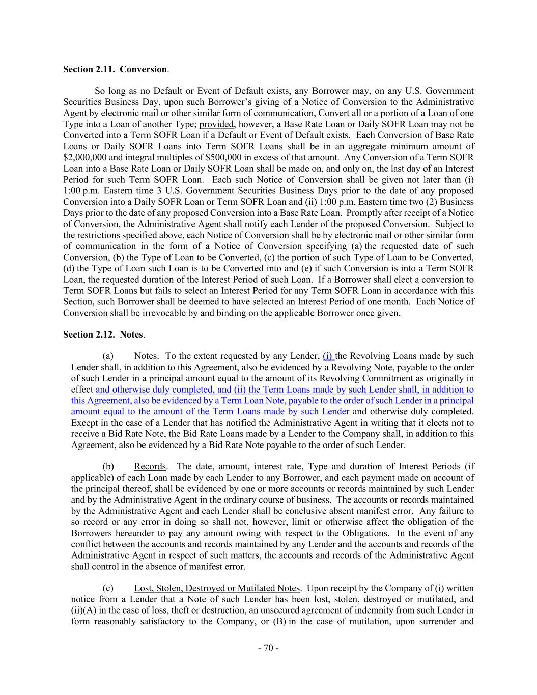 - 70 - Section 2.11. Conversion. So long as no Default or Event of Default exists, any Borrower may, on any U.S. Government Securities Business Day, upon such Borrower’s giving of a Notice of Conversion to the Administrative Agent by electronic mail or other similar form of communication, Convert all or a portion of a Loan of one Type into a Loan of another Type; provided, however, a Base Rate Loan or Daily SOFR Loan may not be Converted into a Term SOFR Loan if a Default or Event of Default exists. Each Conversion of Base Rate Loans or Daily SOFR Loans into Term SOFR Loans shall be in an aggregate minimum amount of $2,000,000 and integral multiples of $500,000 in excess of that amount. Any Conversion of a Term SOFR Loan into a Base Rate Loan or Daily SOFR Loan shall be made on, and only on, the last day of an Interest Period for such Term SOFR Loan. Each such Notice of Conversion shall be given not later than (i) 1:00 p.m. Eastern time 3 U.S. Government Securities Business Days prior to the date of any proposed Conversion into a Daily SOFR Loan or Term SOFR Loan and (ii) 1:00 p.m. Eastern time two (2) Business Days prior to the date of any proposed Conversion into a Base Rate Loan. Promptly after receipt of a Notice of Conversion, the Administrative Agent shall notify each Lender of the proposed Conversion. Subject to the restrictions specified above, each Notice of Conversion shall be by electronic mail or other similar form of communication in the form of a Notice of Conversion specifying (a) the requested date of such Conversion, (b) the Type of Loan to be Converted, (c) the portion of such Type of Loan to be Converted, (d) the Type of Loan such Loan is to be Converted into and (e) if such Conversion is into a Term SOFR Loan, the requested duration of the Interest Period of such Loan. If a Borrower shall elect a conversion to Term SOFR Loans but fails to select an Interest Period for any Term SOFR Loan in accordance with this Section, such Borrower shall be deemed to have selected an Interest Period of one month. Each Notice of Conversion shall be irrevocable by and binding on the applicable Borrower once given. Section 2.12. Notes. (a) Notes. To the extent requested by any Lender, (i) the Revolving Loans made by such Lender shall, in addition to this Agreement, also be evidenced by a Revolving Note, payable to the order of such Lender in a principal amount equal to the amount of its Revolving Commitment as originally in effect and otherwise duly completed, and (ii) the Term Loans made by such Lender shall, in addition to this Agreement, also be evidenced by a Term Loan Note, payable to the order of such Lender in a principal amount equal to the amount of the Term Loans made by such Lender and otherwise duly completed. Except in the case of a Lender that has notified the Administrative Agent in writing that it elects not to receive a Bid Rate Note, the Bid Rate Loans made by a Lender to the Company shall, in addition to this Agreement, also be evidenced by a Bid Rate Note payable to the order of such Lender. (b) Records. The date, amount, interest rate, Type and duration of Interest Periods (if applicable) of each Loan made by each Lender to any Borrower, and each payment made on account of the principal thereof, shall be evidenced by one or more accounts or records maintained by such Lender and by the Administrative Agent in the ordinary course of business. The accounts or records maintained by the Administrative Agent and each Lender shall be conclusive absent manifest error. Any failure to so record or any error in doing so shall not, however, limit or otherwise affect the obligation of the Borrowers hereunder to pay any amount owing with respect to the Obligations. In the event of any conflict between the accounts and records maintained by any Lender and the accounts and records of the Administrative Agent in respect of such matters, the accounts and records of the Administrative Agent shall control in the absence of manifest error. (c) Lost, Stolen, Destroyed or Mutilated Notes. Upon receipt by the Company of (i) written notice from a Lender that a Note of such Lender has been lost, stolen, destroyed or mutilated, and (ii)(A) in the case of loss, theft or destruction, an unsecured agreement of indemnity from such Lender in form reasonably satisfactory to the Company, or (B) in the case of mutilation, upon surrender and
